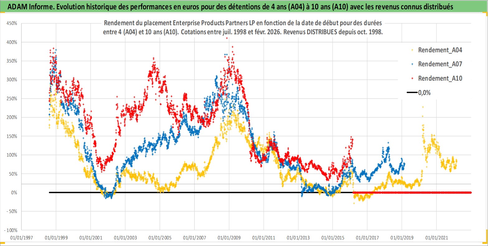 Site dédié aux investisseursPage dédiée sur site financeAnalyse des valorisations hebdomadaires de l'action Enterprise Products Partners LP. Cet actif est cote en USD. Les valorisations sont en contrevaleur EURO et couvrent les semaines 1998W31 a 2026W09. Les revenus de cet actif financier sont pris en compte depuis la semaine 1998W44. La note ESG de cet actif n'est pas connue.