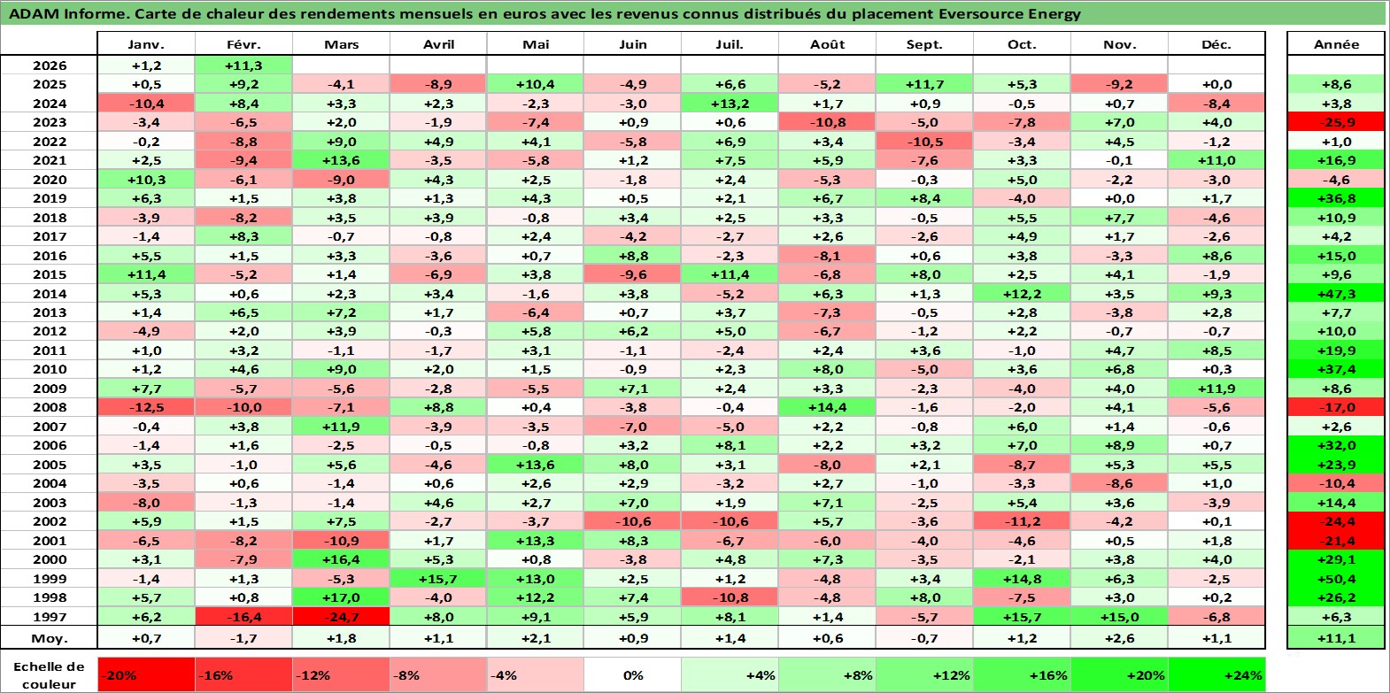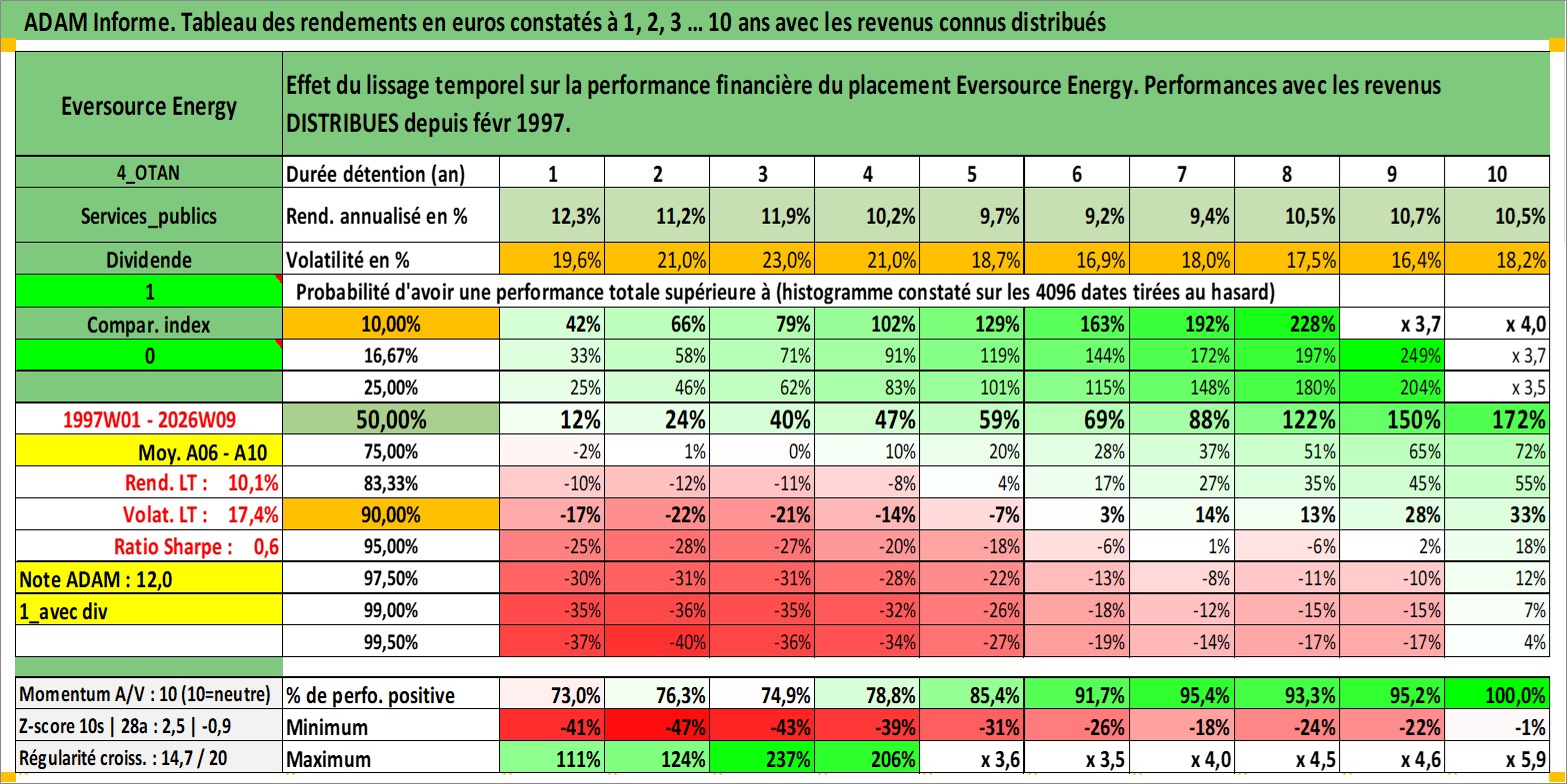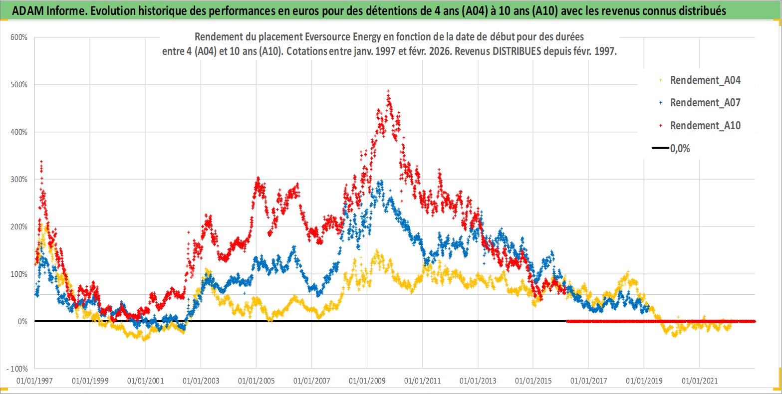 Site dédié aux investisseursPage dédiée sur site financeAnalyse des valorisations hebdomadaires de l'action Eversource Energy. Cet actif est cote en USD. Les valorisations sont en contrevaleur EURO et couvrent les semaines 1997W01 a 2026W09. Les revenus de cet actif financier sont pris en compte depuis la semaine 1997W09. La note globale ESG de cet actif est estimee a 11.0 (apres rebasage entre 0 et 20).