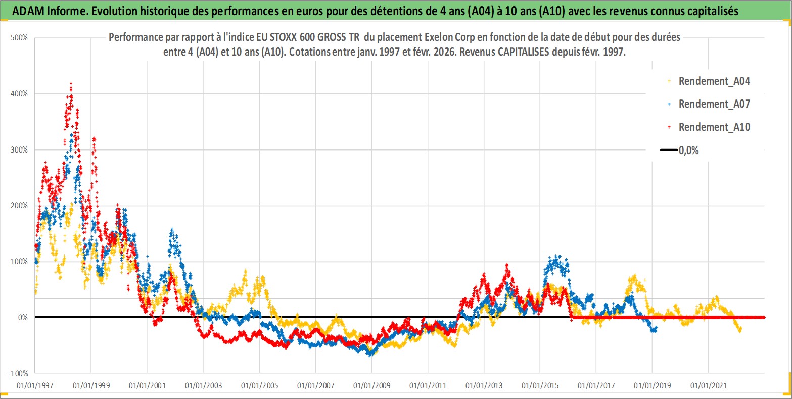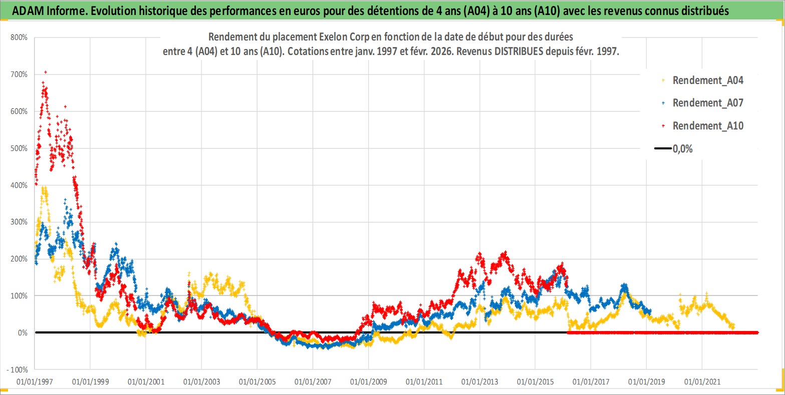 Site dédié aux investisseursPage dédiée sur site financeAnalyse des valorisations hebdomadaires de l'action Exelon Corp. Cet actif est cote en USD. Les valorisations sont en contrevaleur EURO et couvrent les semaines 1997W01 a 2026W09. Les revenus de cet actif financier sont pris en compte depuis la semaine 1997W08. La note globale ESG de cet actif est estimee a 8.0 (apres rebasage entre 0 et 20).