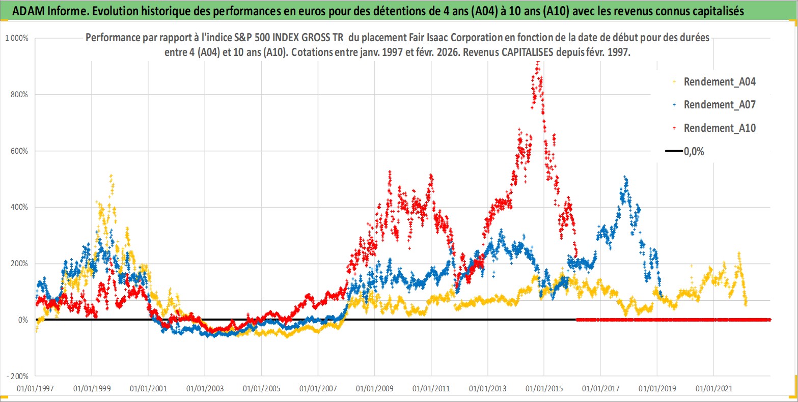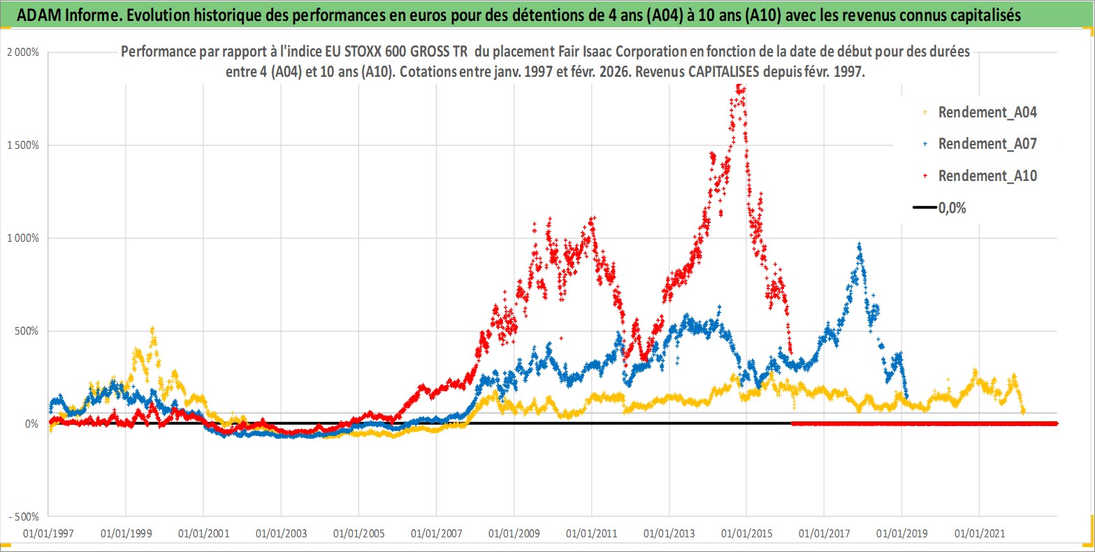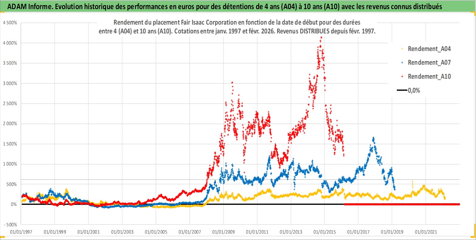 Site dédié aux investisseursPage dédiée sur site financeAnalyse des valorisations hebdomadaires de l'action Fair Isaac Corporation. Cet actif est cote en USD. Les valorisations sont en contrevaleur EURO et couvrent les semaines 1997W01 a 2026W09. Les revenus de cet actif financier sont pris en compte depuis la semaine 1997W08. La note ESG de cet actif n'est pas connue.