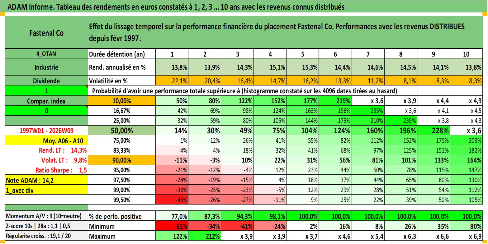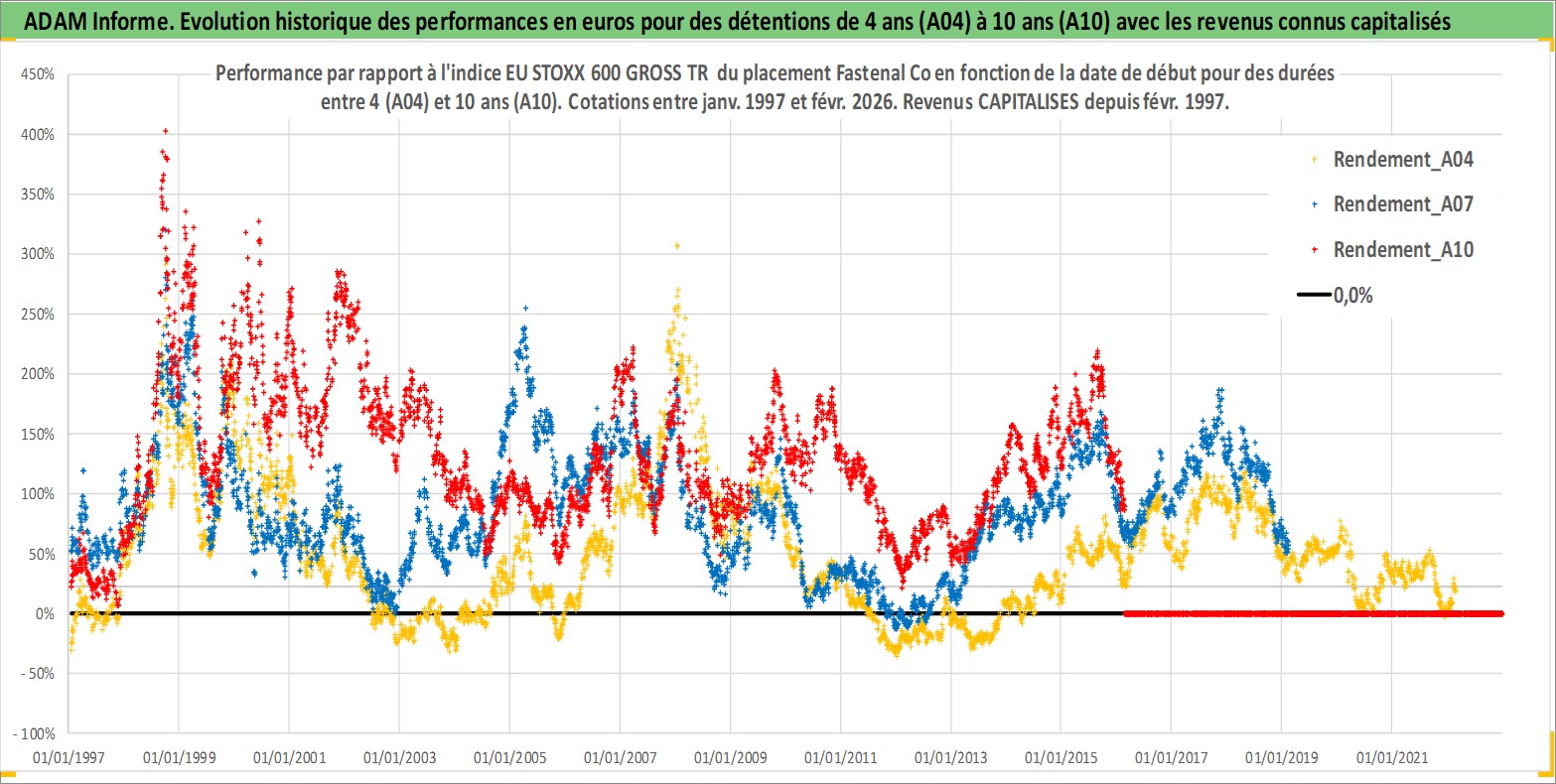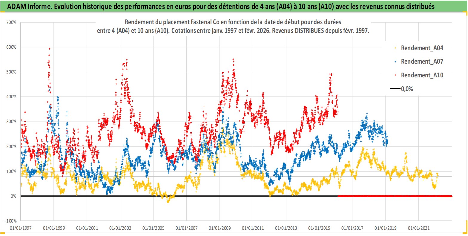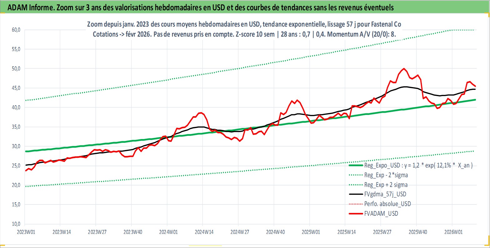 Site dédié aux investisseursPage dédiée sur site financeAnalyse des valorisations hebdomadaires de l'action Fastenal Co. Cet actif est cote en USD. Les valorisations sont en contrevaleur EURO et couvrent les semaines 1997W01 a 2026W09. Les revenus de cet actif financier sont pris en compte depuis la semaine 1997W09. La note globale ESG de cet actif est estimee a 7.0 (apres rebasage entre 0 et 20).