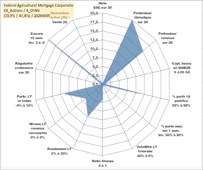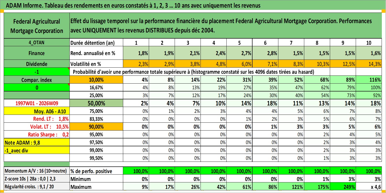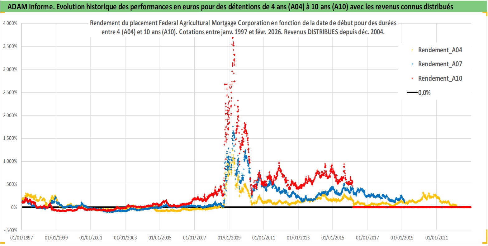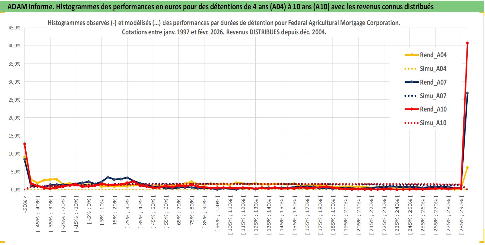Site dédié aux investisseursPage dédiée sur site financeAnalyse des valorisations hebdomadaires de l'action Federal Agricultural Mortgage Corporation. Cet actif est cote en USD. Les valorisations sont en contrevaleur EURO et couvrent les semaines 1997W01 a 2026W09. Les revenus de cet actif financier sont pris en compte depuis la semaine 2004W51. La note ESG de cet actif n'est pas connue.