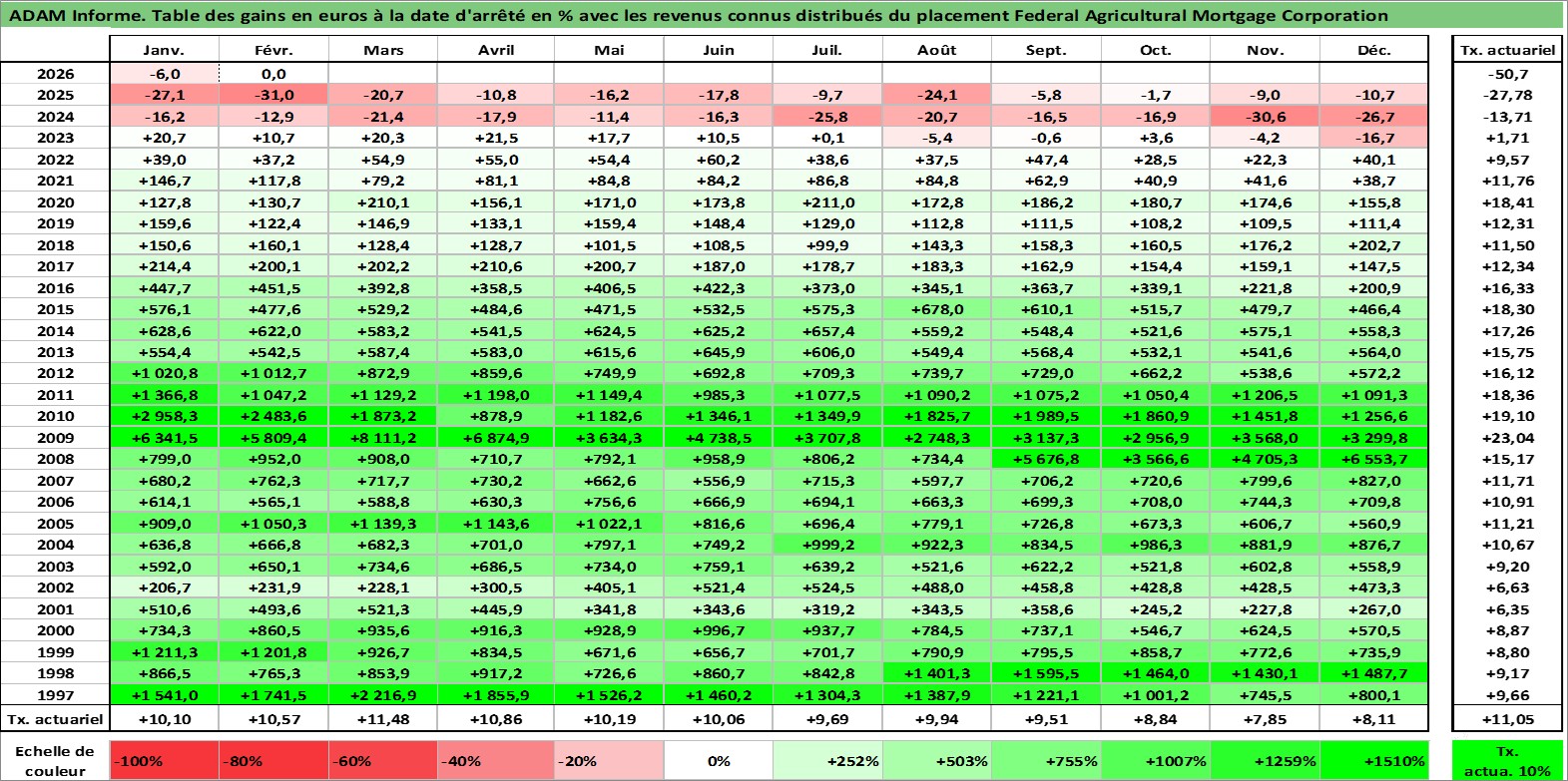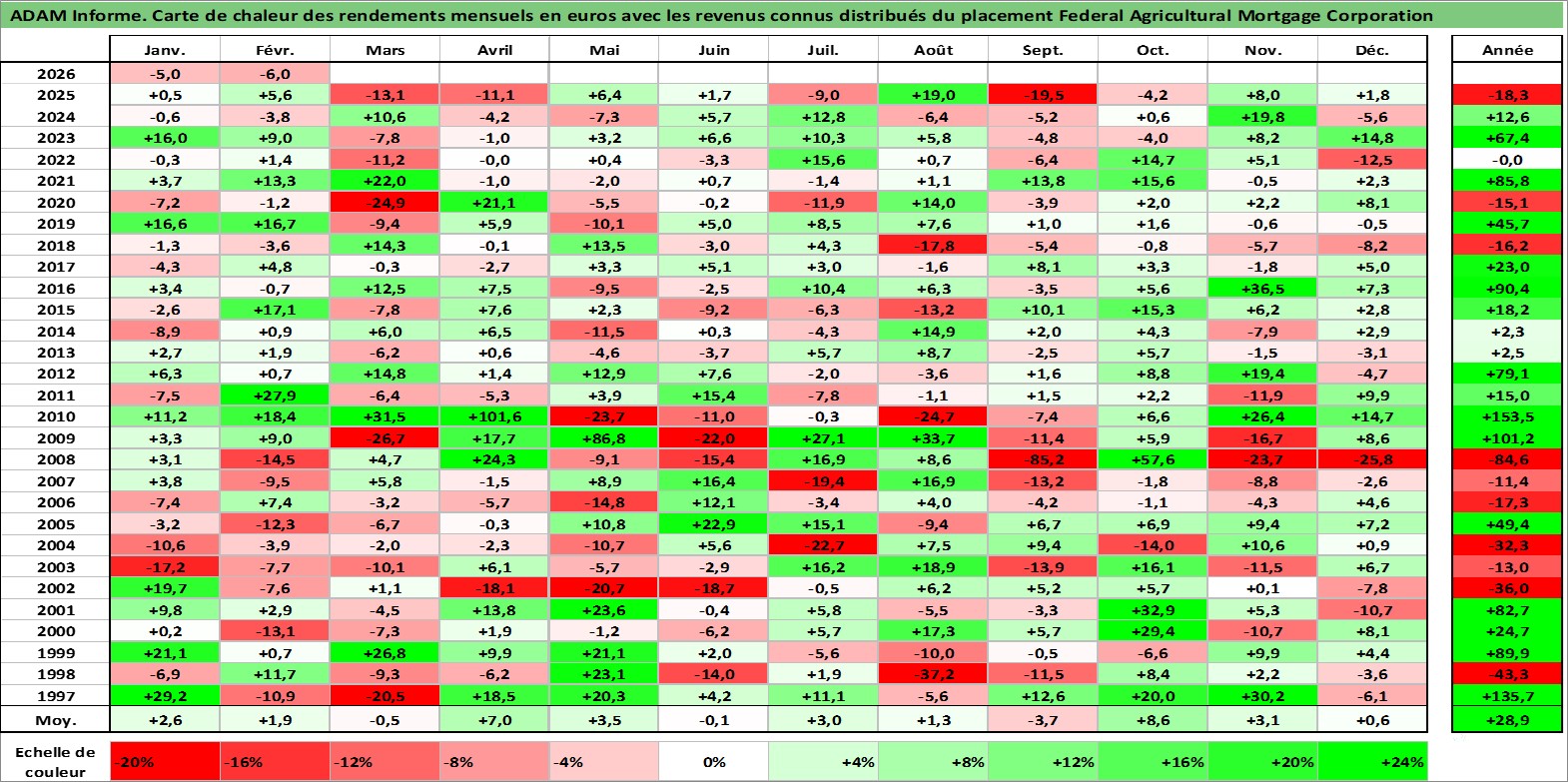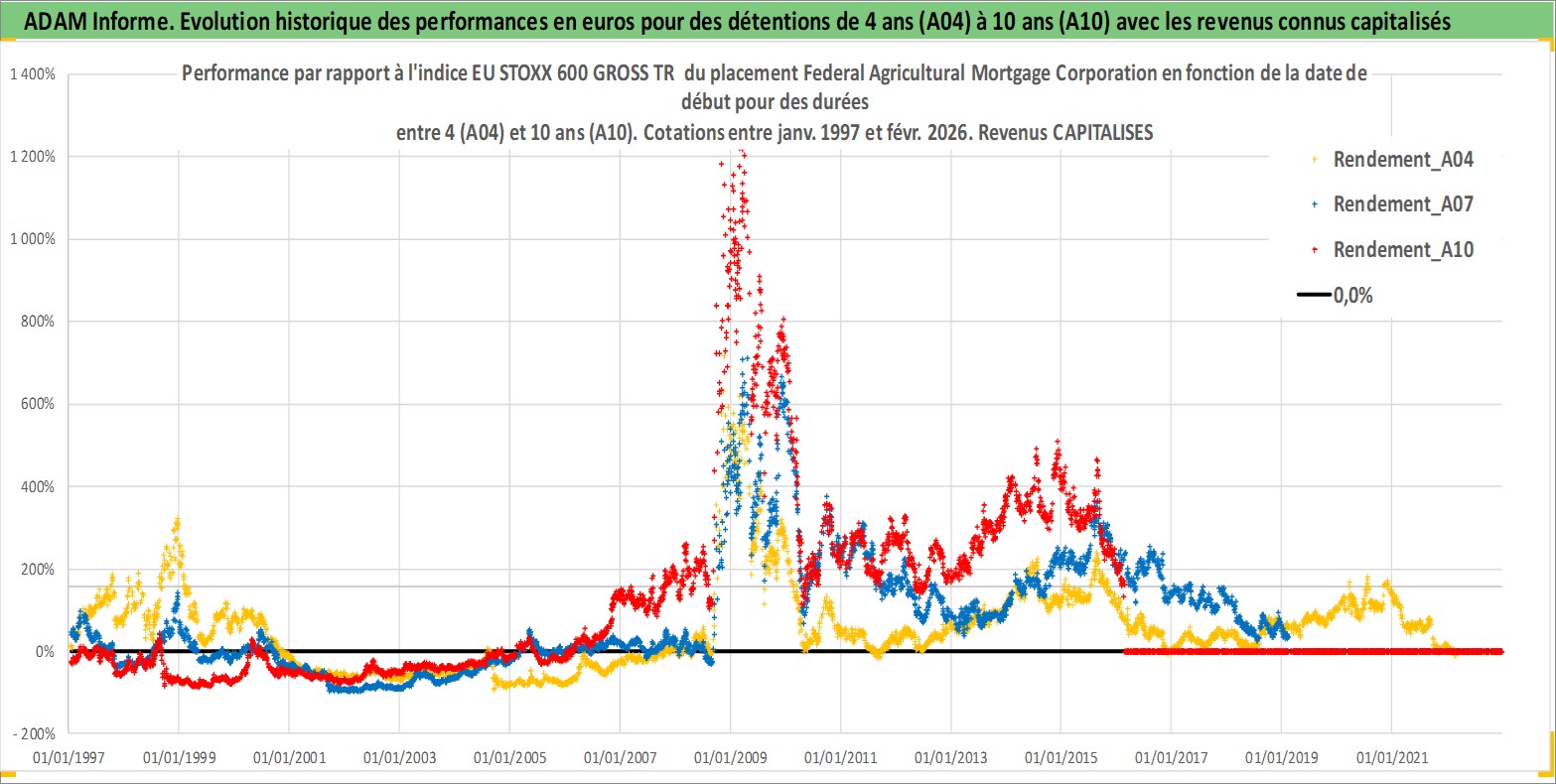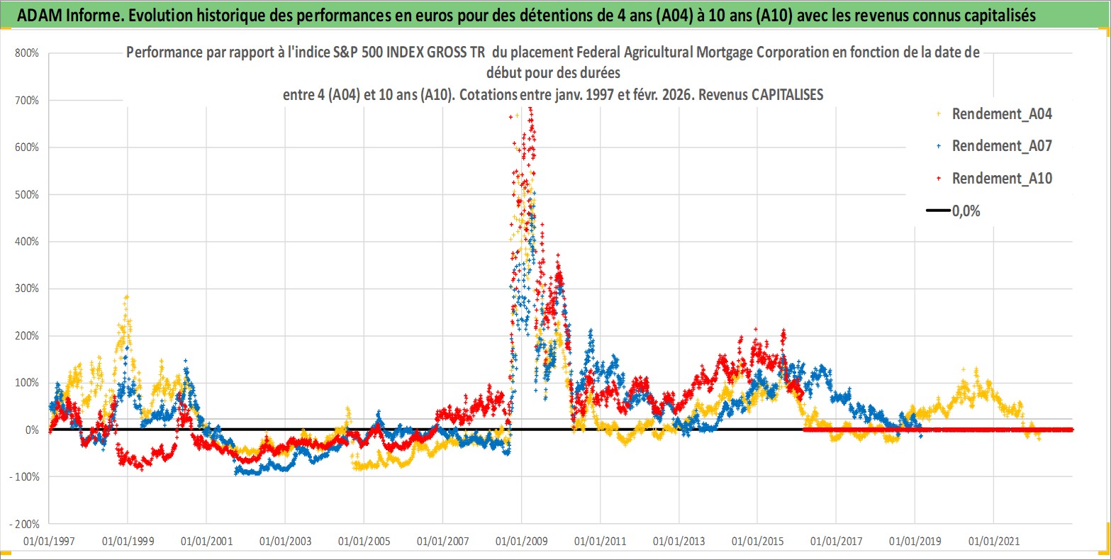 Site dédié aux investisseursPage dédiée sur site financeAnalyse des valorisations hebdomadaires de l'action Federal Agricultural Mortgage Corporation. Cet actif est cote en USD. Les valorisations sont en contrevaleur EURO et couvrent les semaines 1997W01 a 2026W09. Les revenus de cet actif financier sont pris en compte depuis la semaine 2004W51. La note ESG de cet actif n'est pas connue.