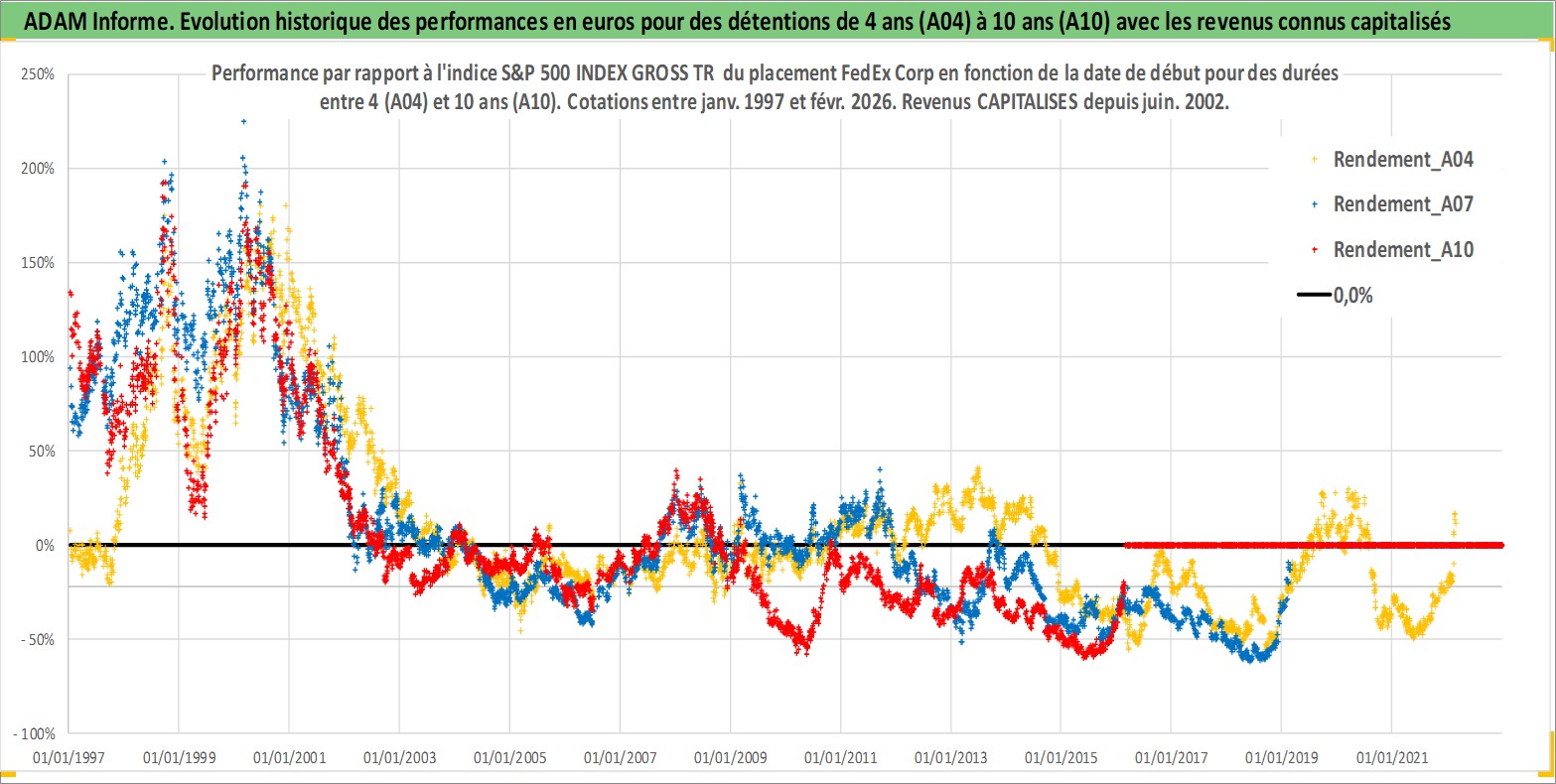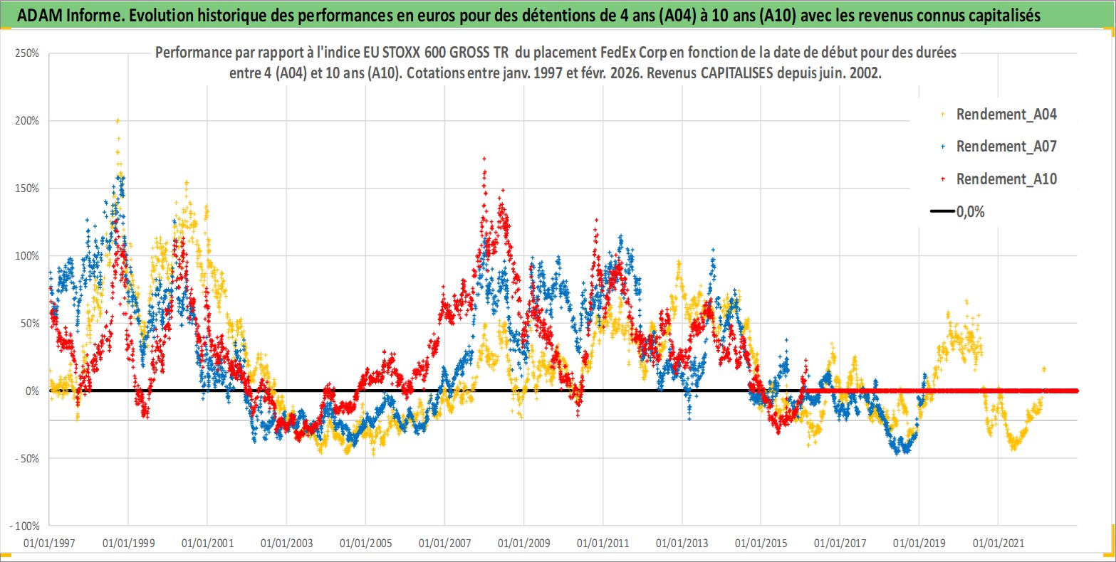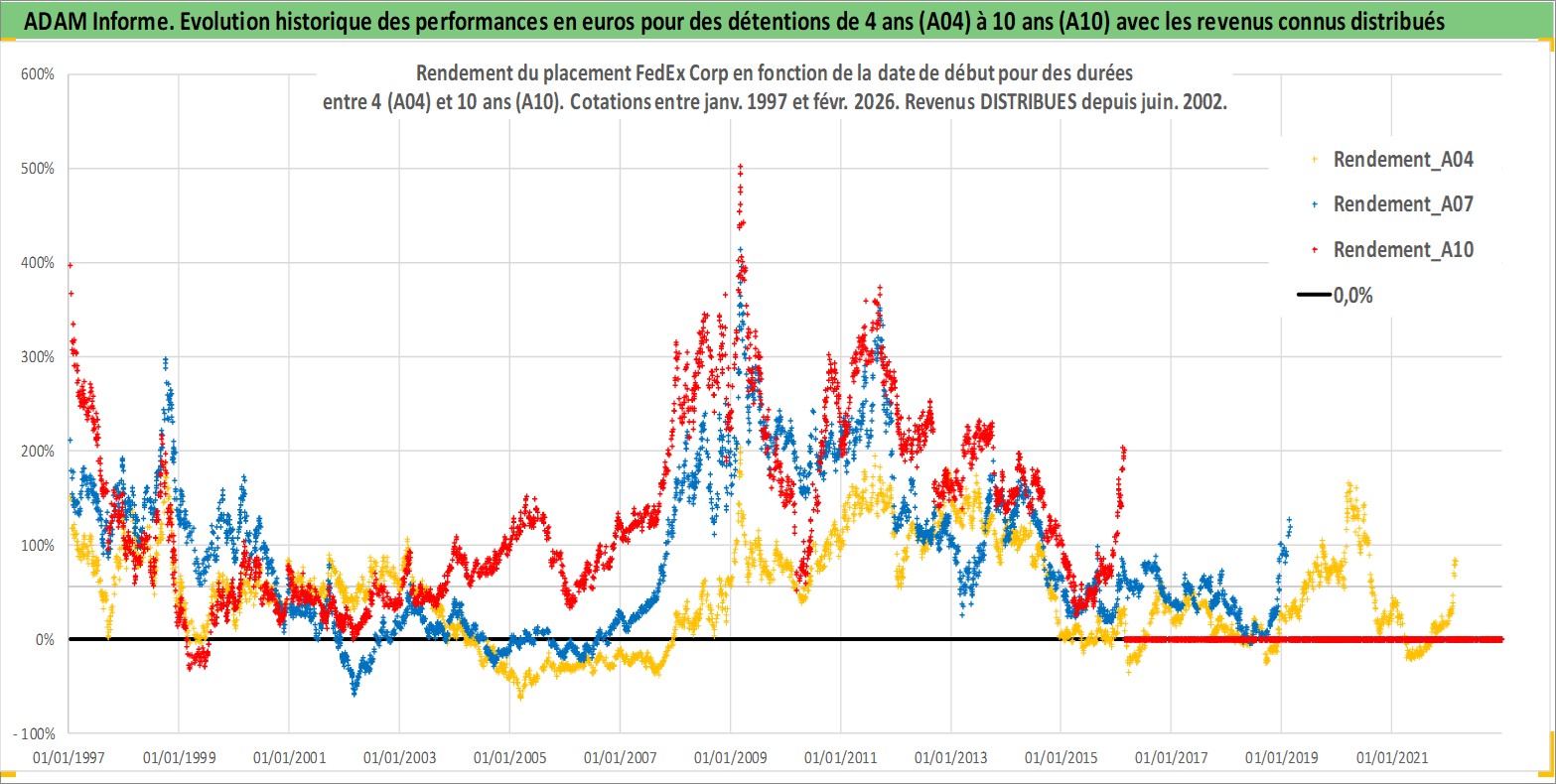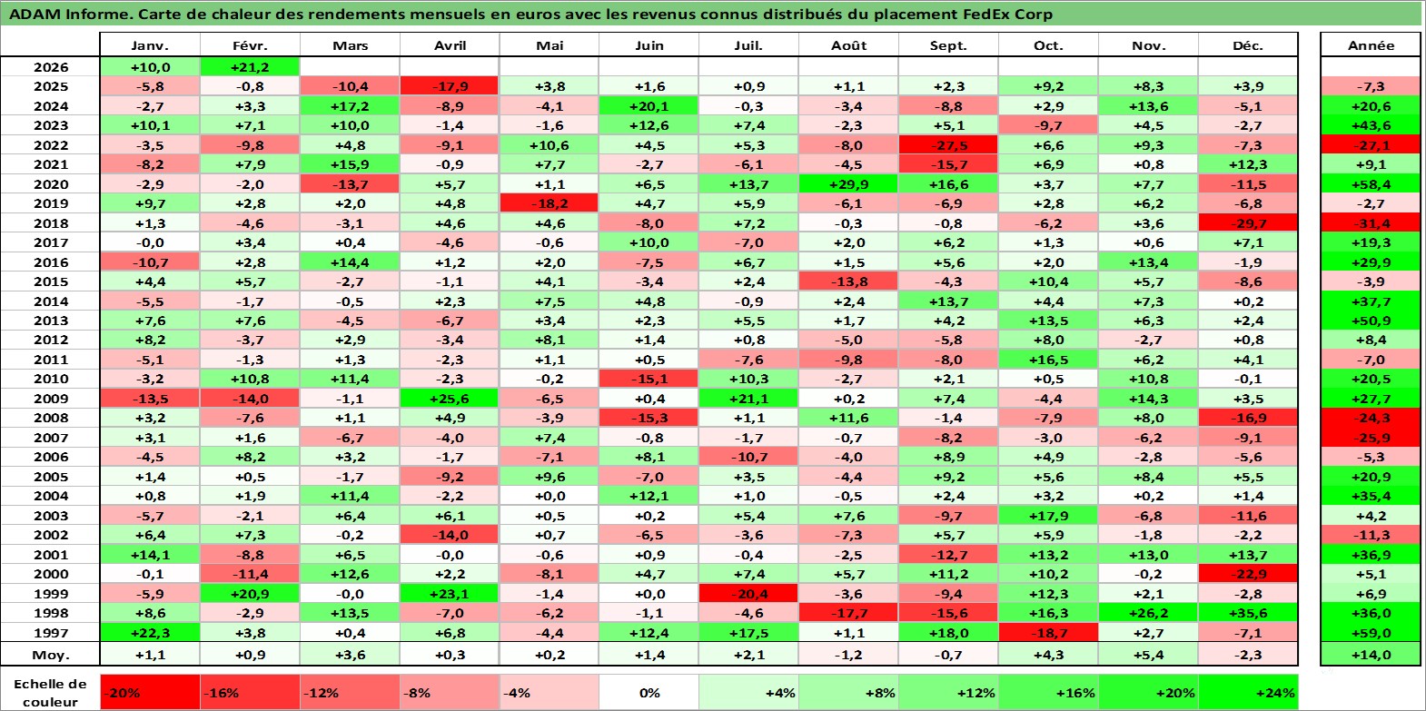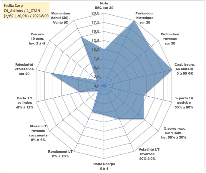 Site dédié aux investisseursPage dédiée sur site financeAnalyse des valorisations hebdomadaires de l'action FedEx Corp. Cet actif est cote en USD. Les valorisations sont en contrevaleur EURO et couvrent les semaines 1997W01 a 2026W09. Les revenus de cet actif financier sont pris en compte depuis la semaine 2002W24. La note globale ESG de cet actif est estimee a 10.0 (apres rebasage entre 0 et 20).