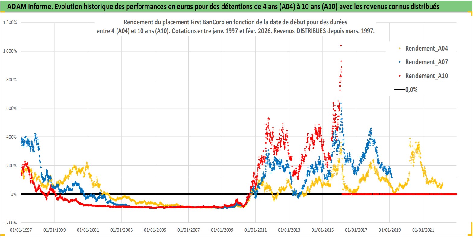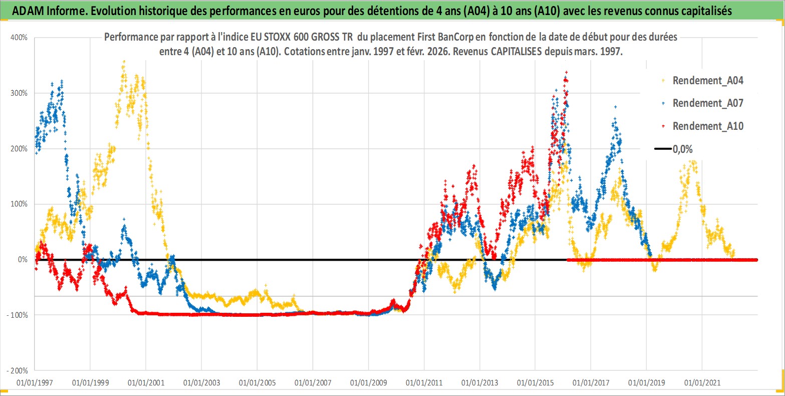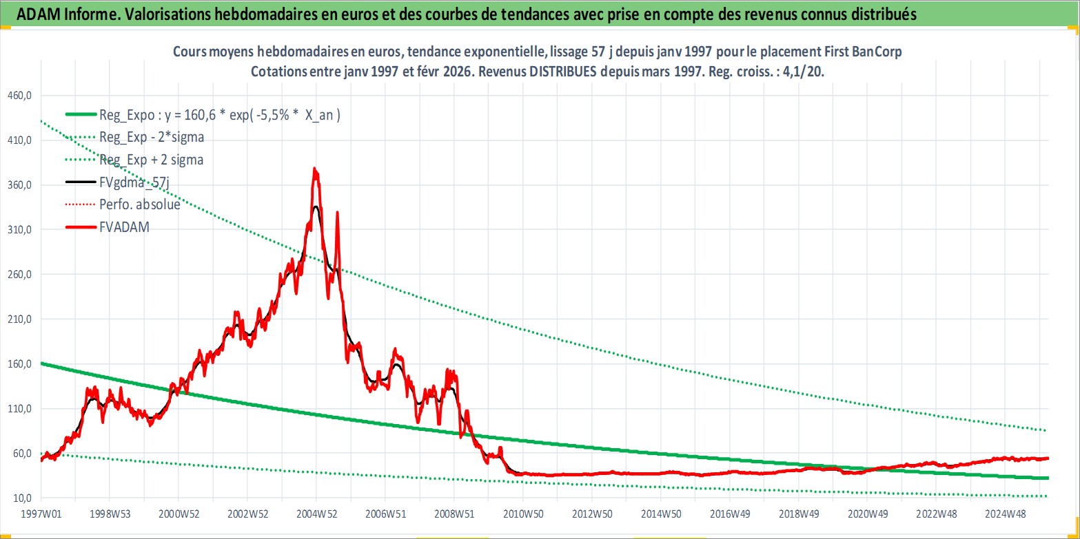 Site dédié aux investisseursPage dédiée sur site financeAnalyse des valorisations hebdomadaires de l'action First BanCorp. Cet actif est cote en USD. Les valorisations sont en contrevaleur EURO et couvrent les semaines 1997W01 a 2026W09. Les revenus de cet actif financier sont pris en compte depuis la semaine 1997W11. La note ESG de cet actif n'est pas connue.