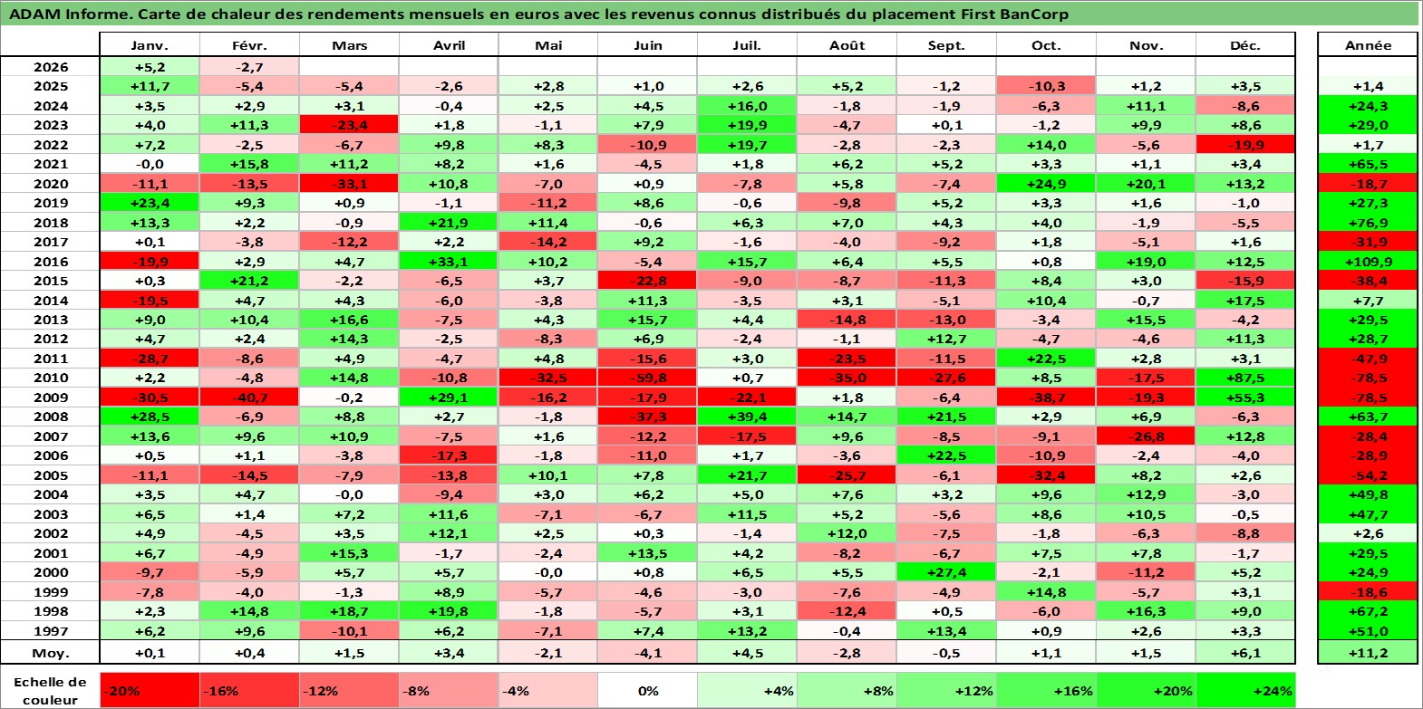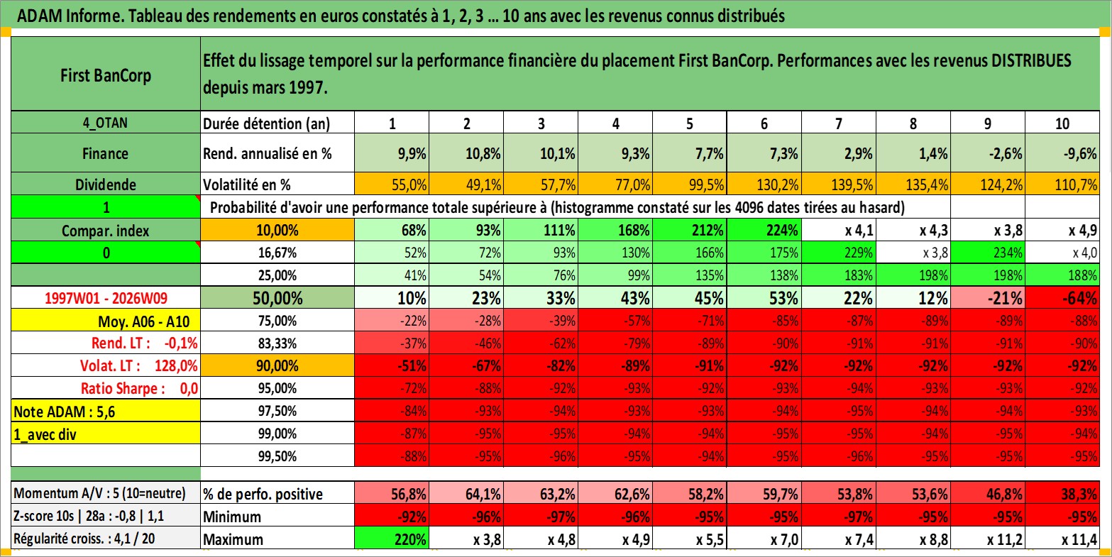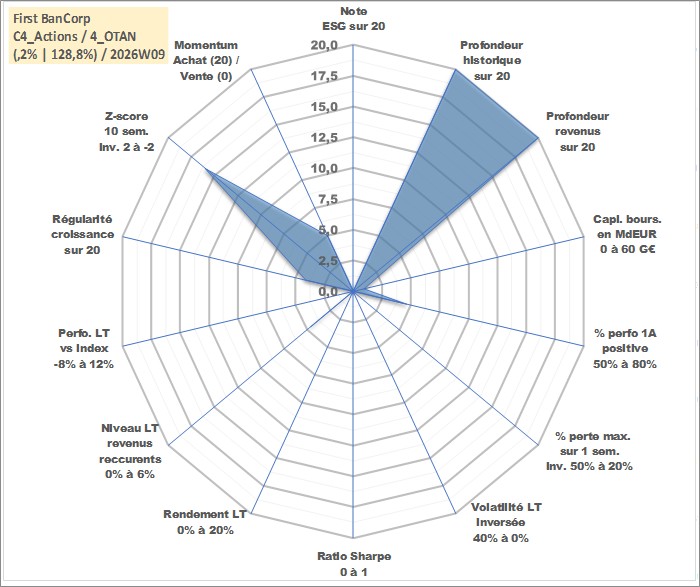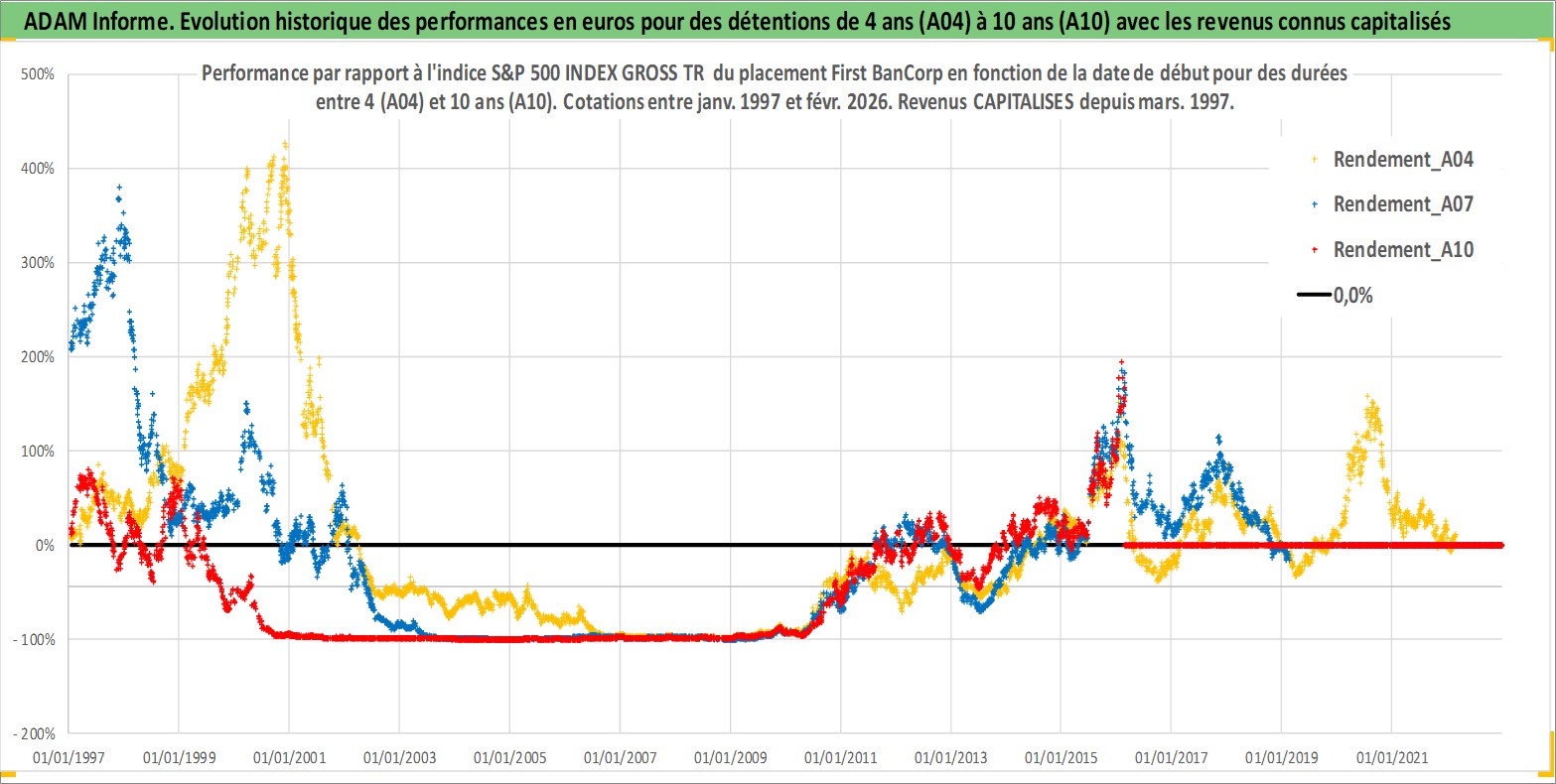 Site dédié aux investisseursPage dédiée sur site financeAnalyse des valorisations hebdomadaires de l'action First BanCorp. Cet actif est cote en USD. Les valorisations sont en contrevaleur EURO et couvrent les semaines 1997W01 a 2026W09. Les revenus de cet actif financier sont pris en compte depuis la semaine 1997W11. La note ESG de cet actif n'est pas connue.