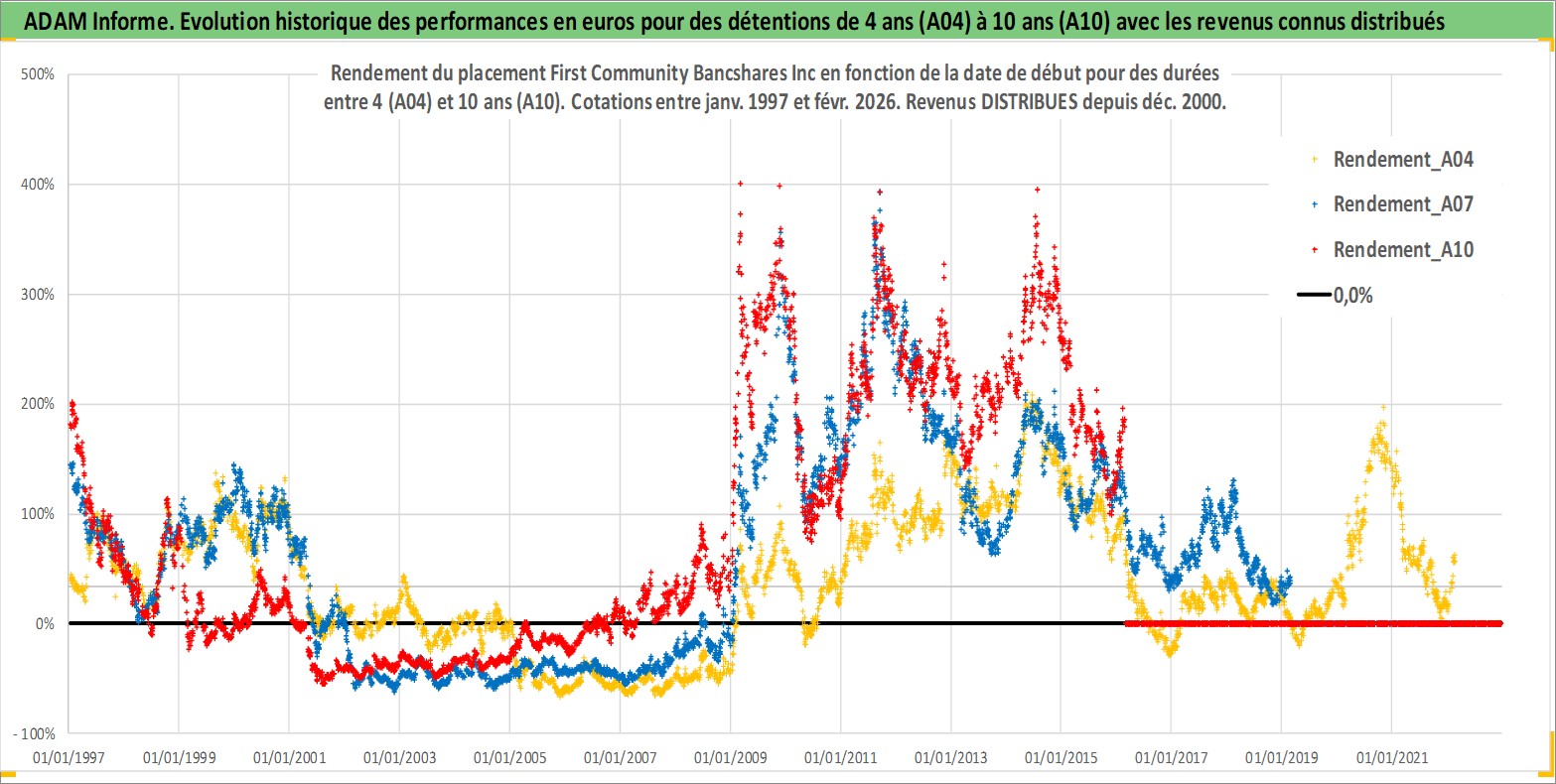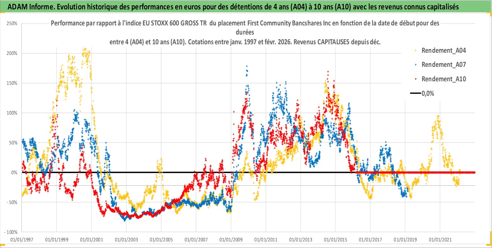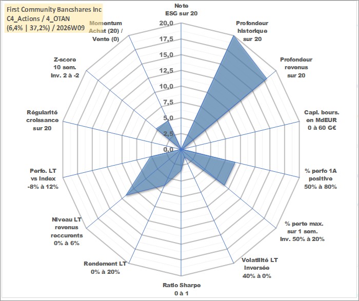 Site dédié aux investisseursPage dédiée sur site financeAnalyse des valorisations hebdomadaires de l'action First Community Bancshares Inc. Cet actif est cote en USD. Les valorisations sont en contrevaleur EURO et couvrent les semaines 1997W01 a 2026W09. Les revenus de cet actif financier sont pris en compte depuis la semaine 2000W50. La note ESG de cet actif n'est pas connue.