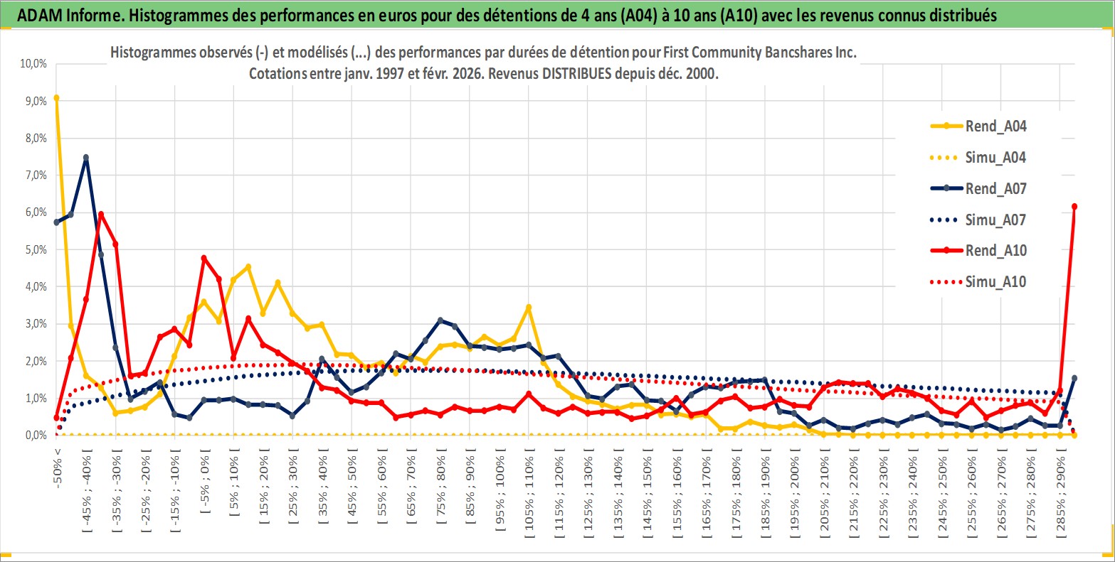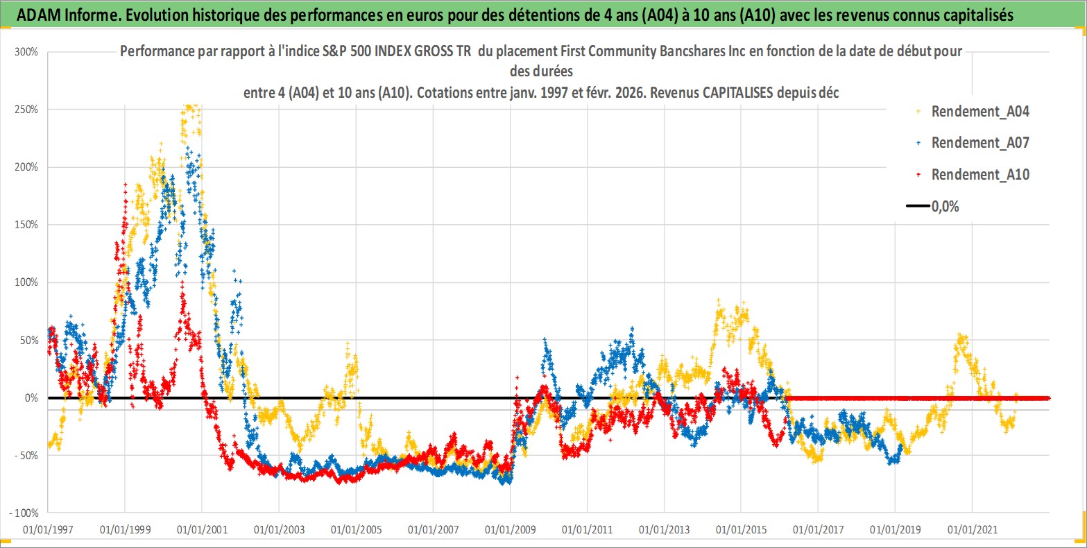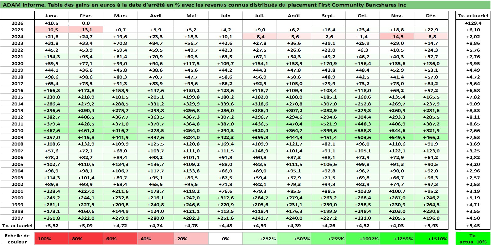 Site dédié aux investisseursPage dédiée sur site financeAnalyse des valorisations hebdomadaires de l'action First Community Bancshares Inc. Cet actif est cote en USD. Les valorisations sont en contrevaleur EURO et couvrent les semaines 1997W01 a 2026W09. Les revenus de cet actif financier sont pris en compte depuis la semaine 2000W50. La note ESG de cet actif n'est pas connue.