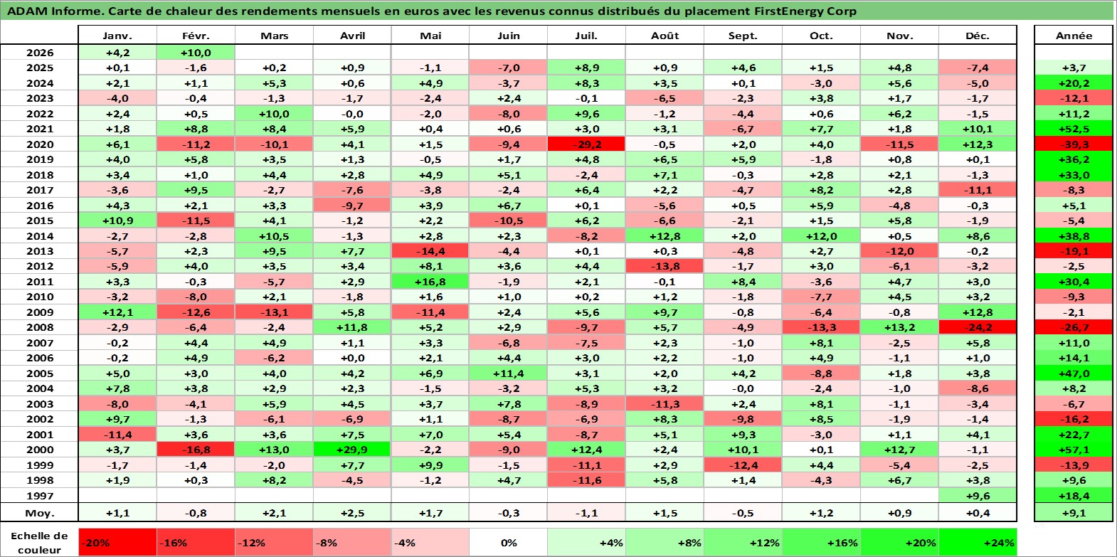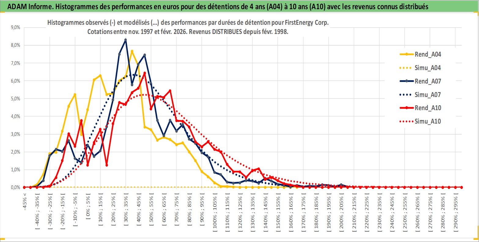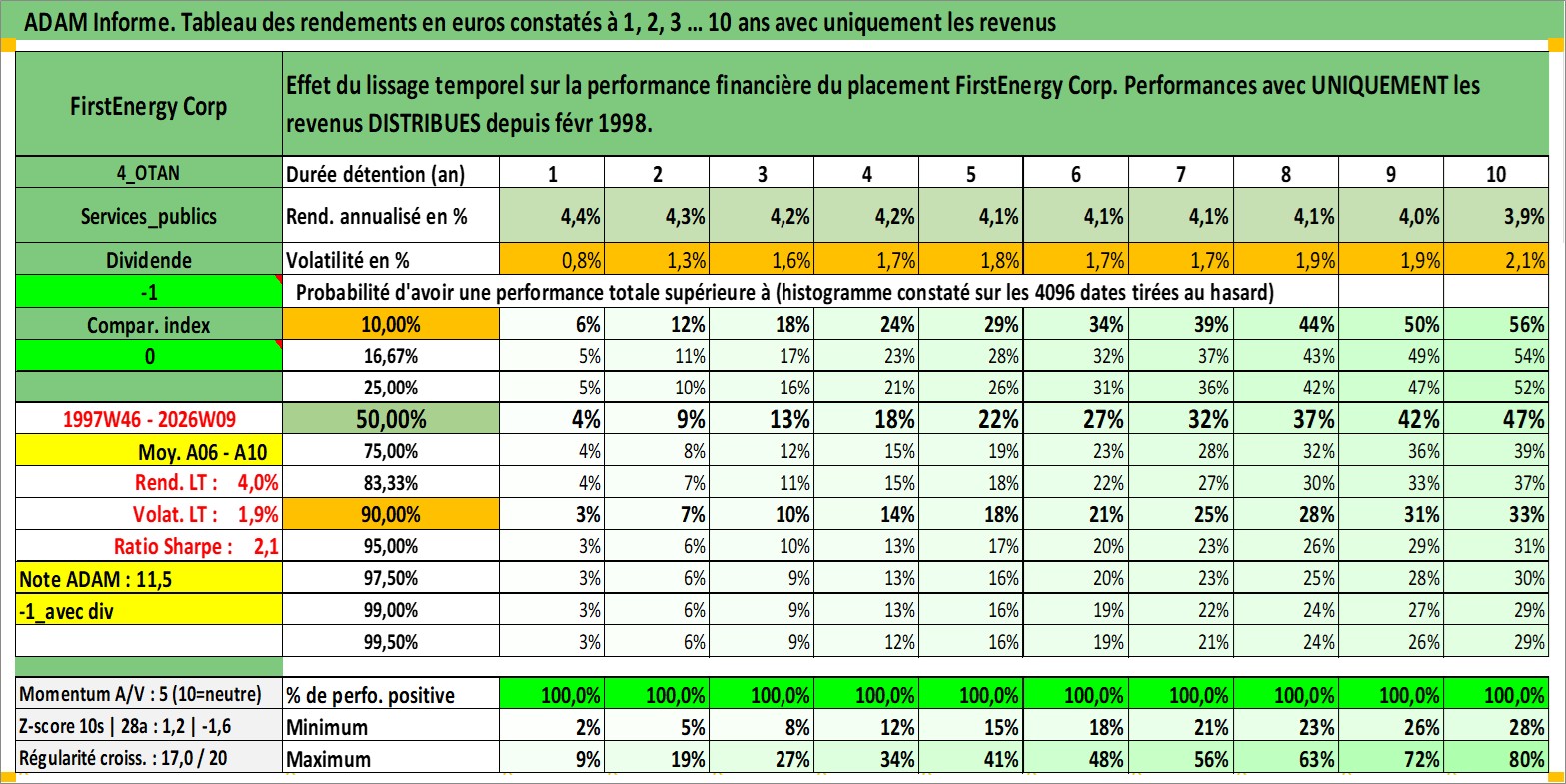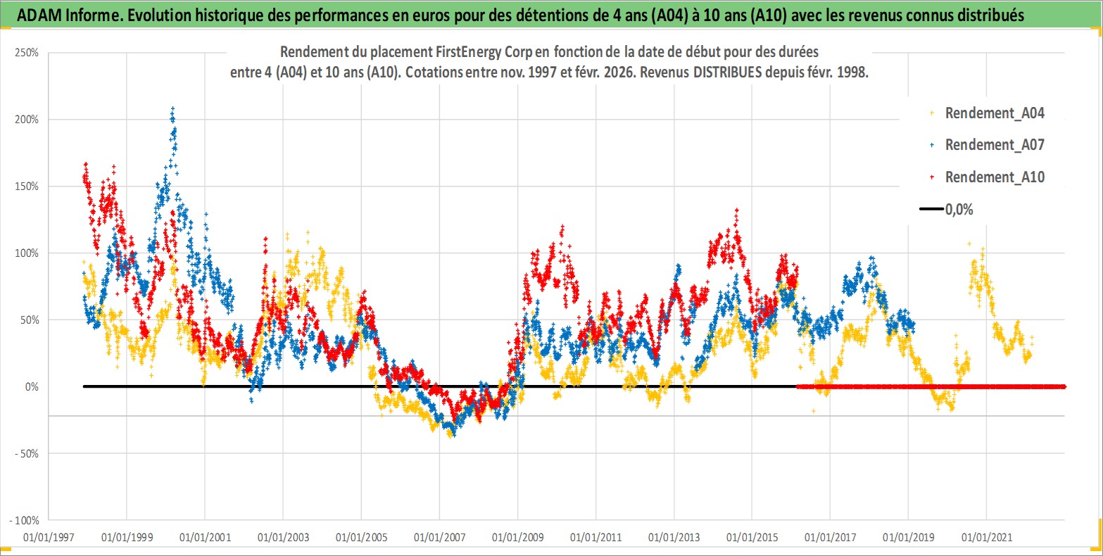 Site dédié aux investisseursPage dédiée sur site financeAnalyse des valorisations hebdomadaires de l'action FirstEnergy Corp. Cet actif est cote en USD. Les valorisations sont en contrevaleur EURO et couvrent les semaines 1997W46 a 2026W09. Les revenus de cet actif financier sont pris en compte depuis la semaine 1998W06. La note globale ESG de cet actif est estimee a 5.0 (apres rebasage entre 0 et 20).