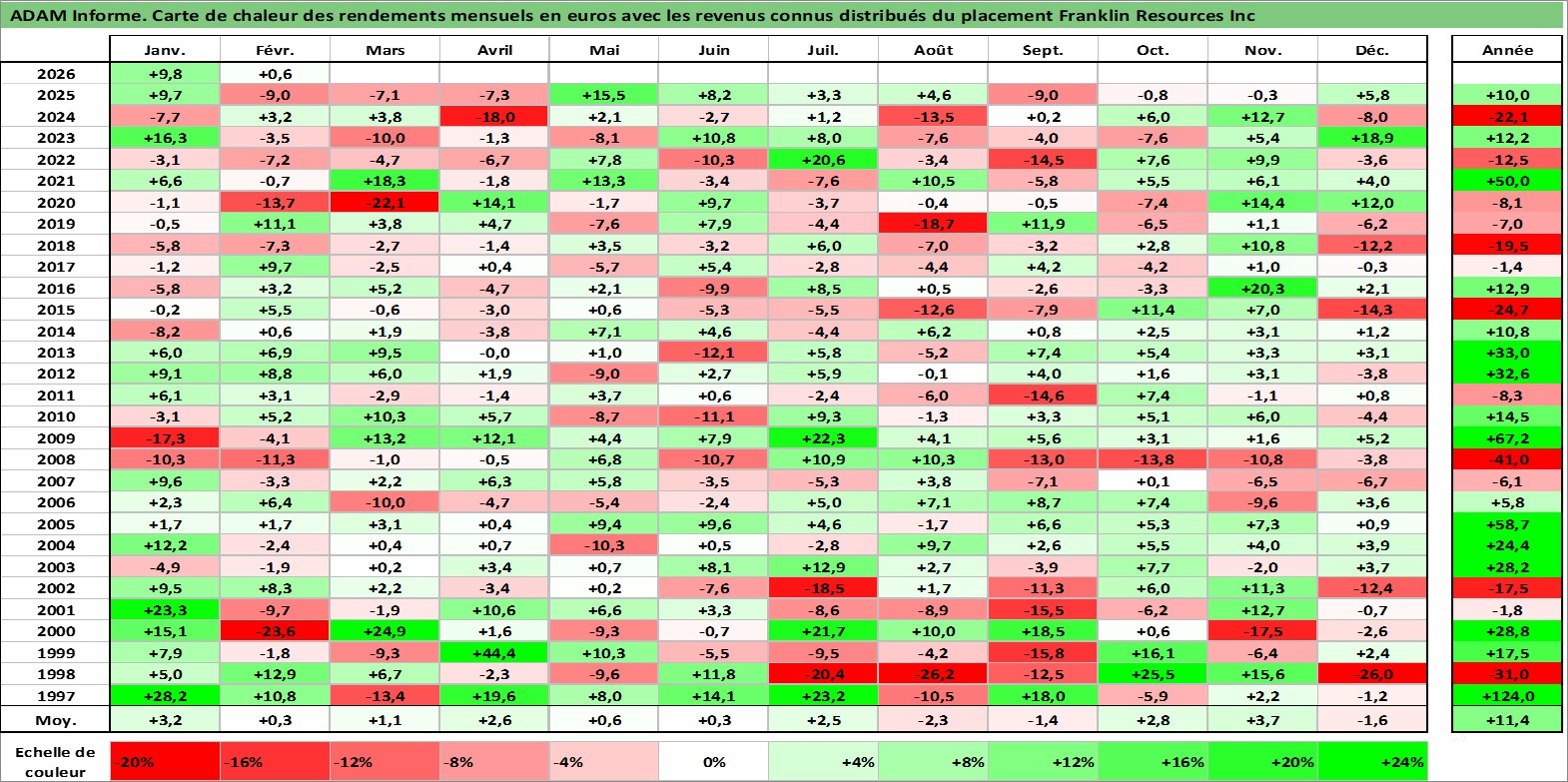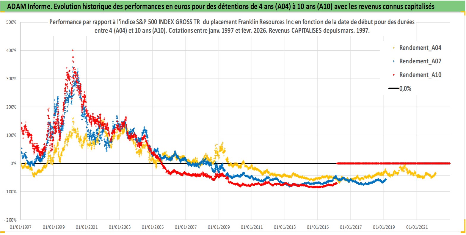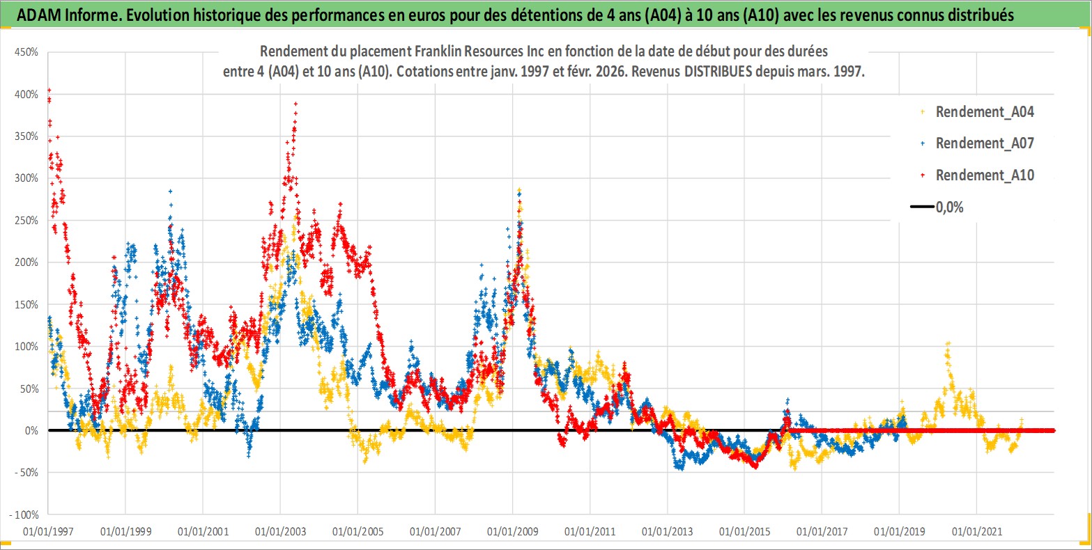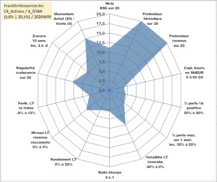 Site dédié aux investisseursPage dédiée sur site financeAnalyse des valorisations hebdomadaires de l'action Franklin Resources Inc. Cet actif est cote en USD. Les valorisations sont en contrevaleur EURO et couvrent les semaines 1997W01 a 2026W09. Les revenus de cet actif financier sont pris en compte depuis la semaine 1997W13. La note globale ESG de cet actif est estimee a 11.0 (apres rebasage entre 0 et 20).
