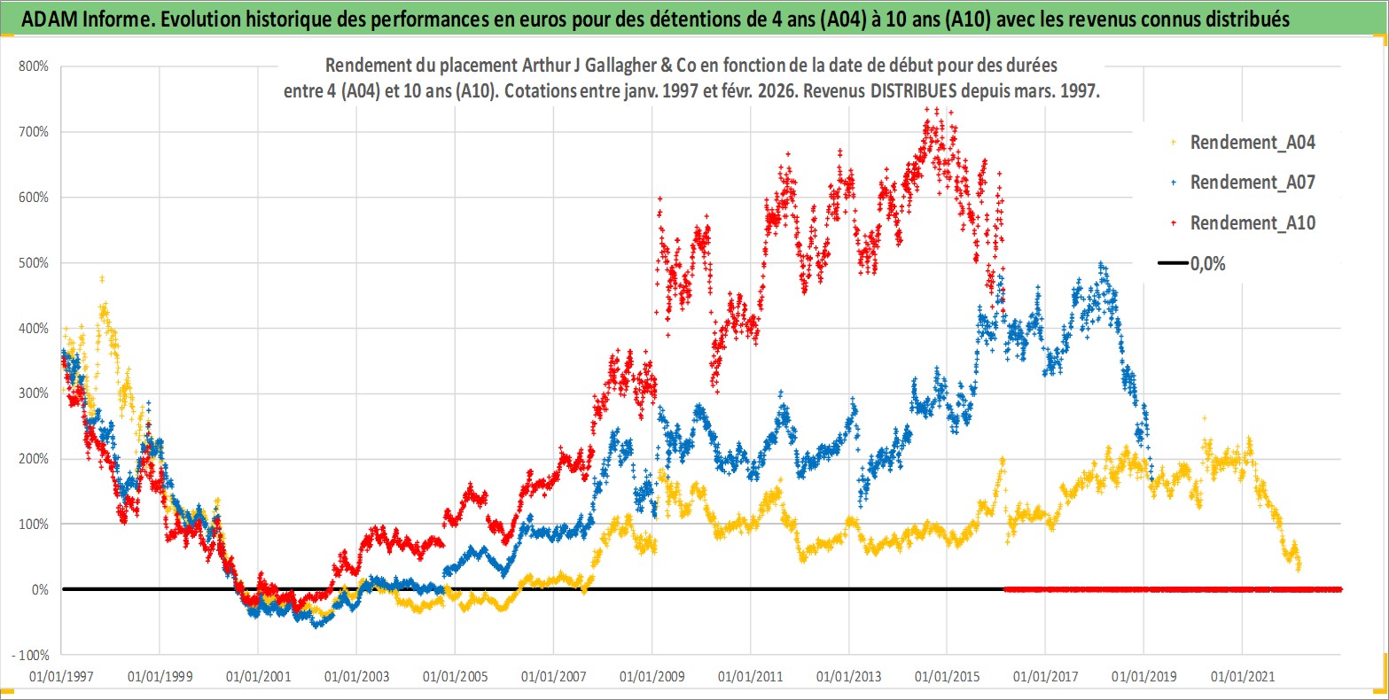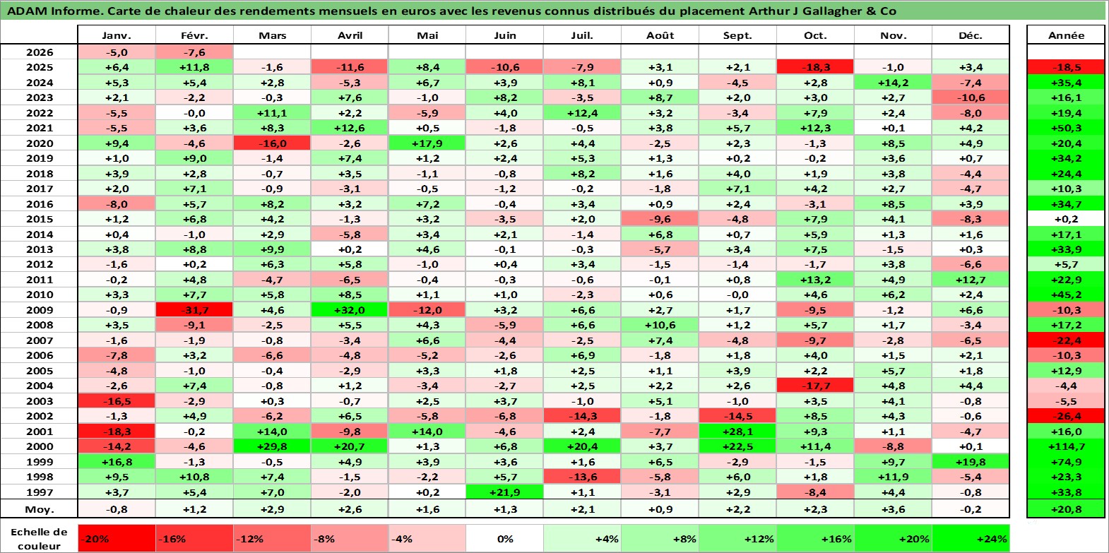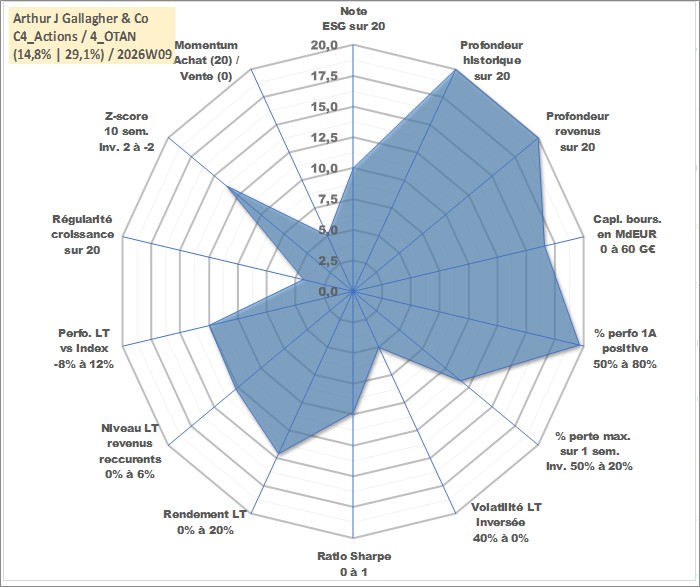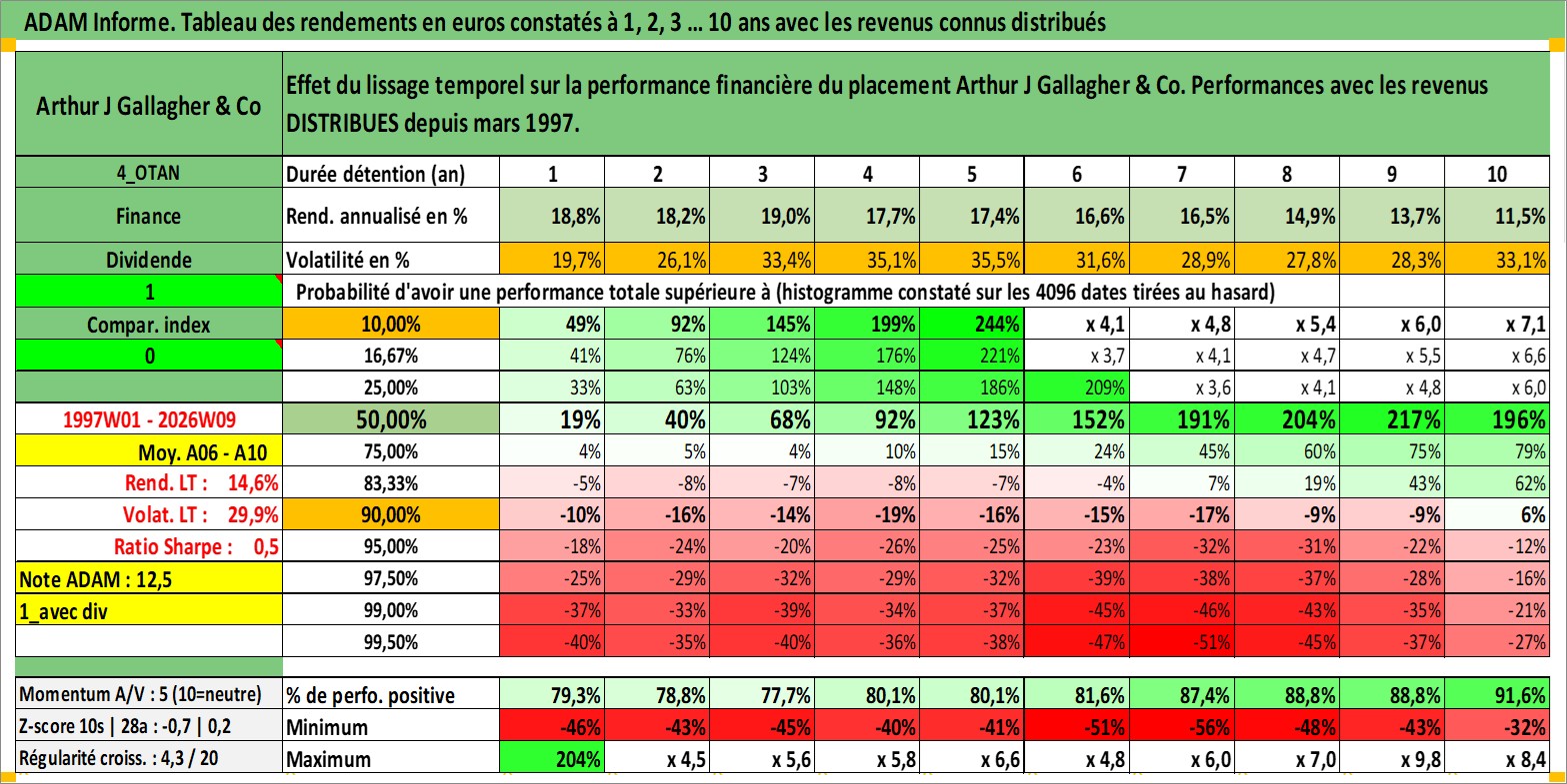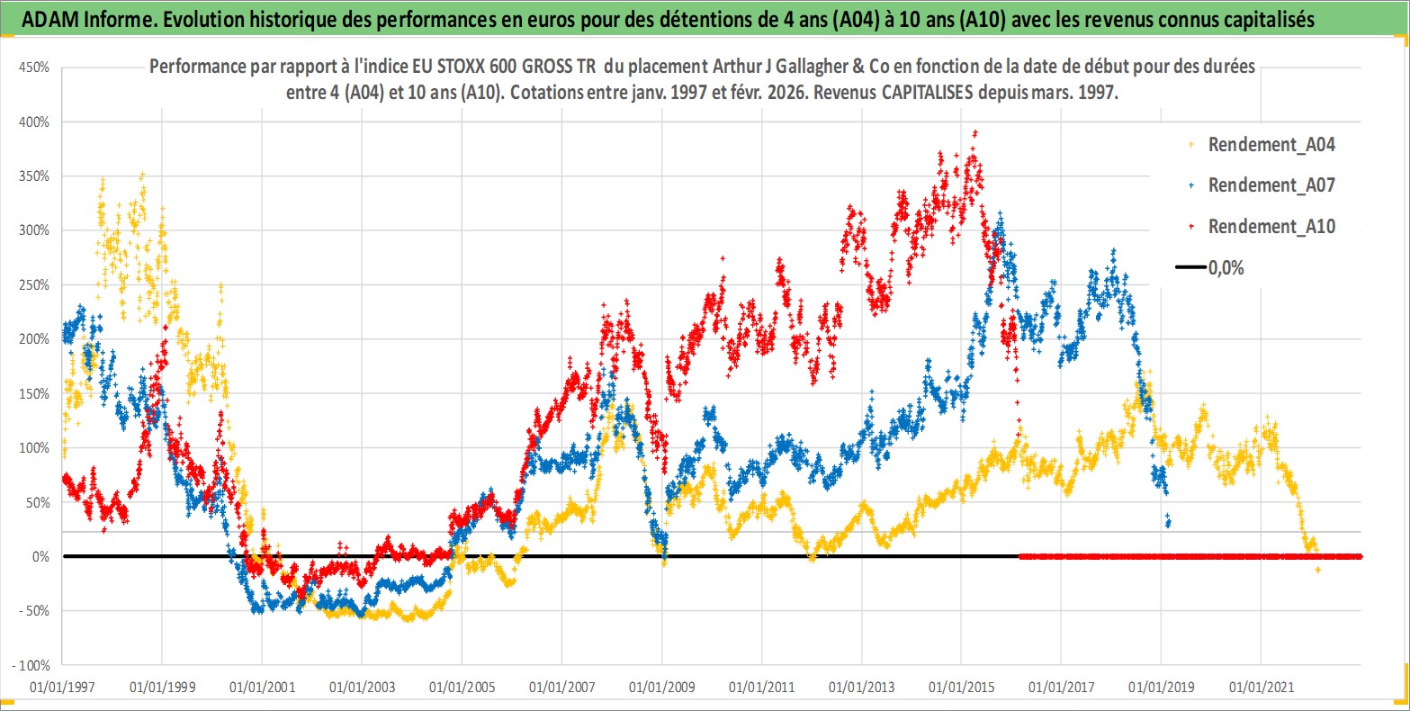 Site dédié aux investisseursPage dédiée sur site financeAnalyse des valorisations hebdomadaires de l'action Arthur J Gallagher & Co. Cet actif est cote en USD. Les valorisations sont en contrevaleur EURO et couvrent les semaines 1997W01 a 2026W09. Les revenus de cet actif financier sont pris en compte depuis la semaine 1997W13. La note globale ESG de cet actif est estimee a 10.0 (apres rebasage entre 0 et 20).