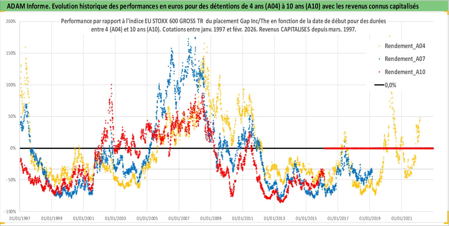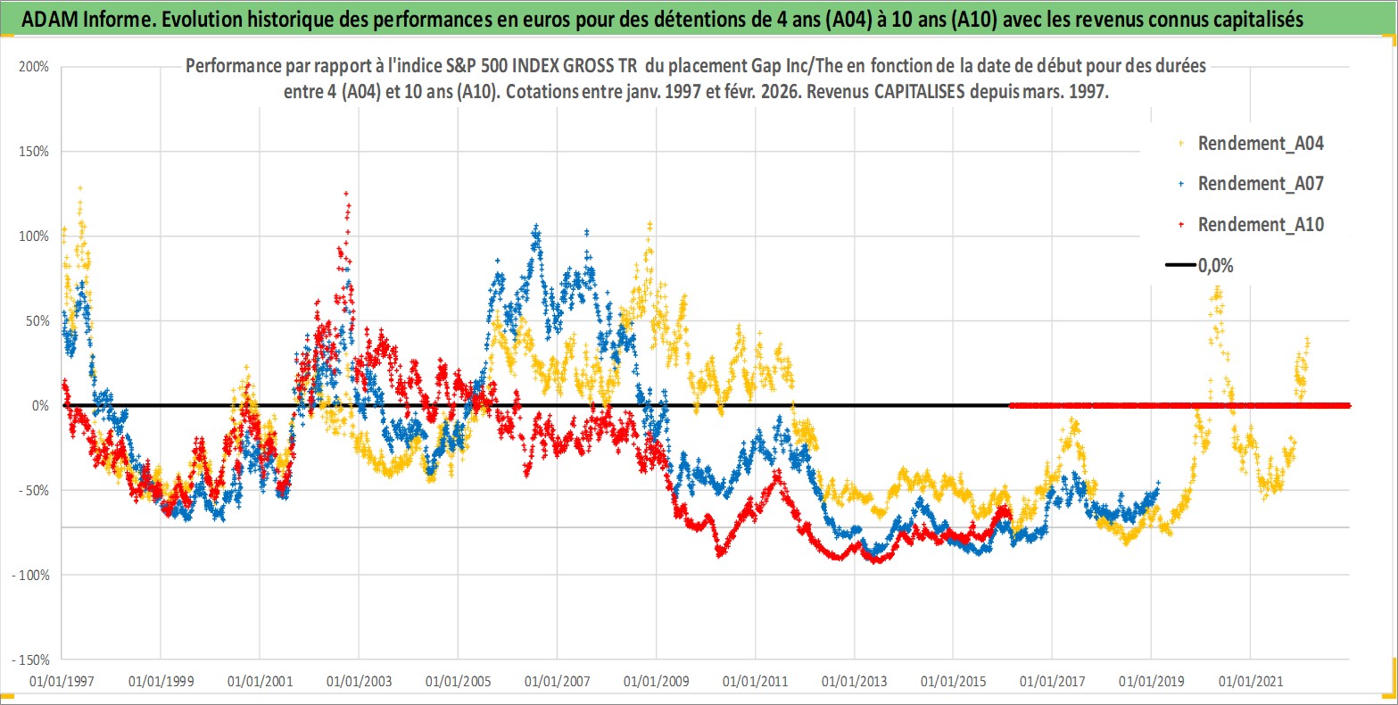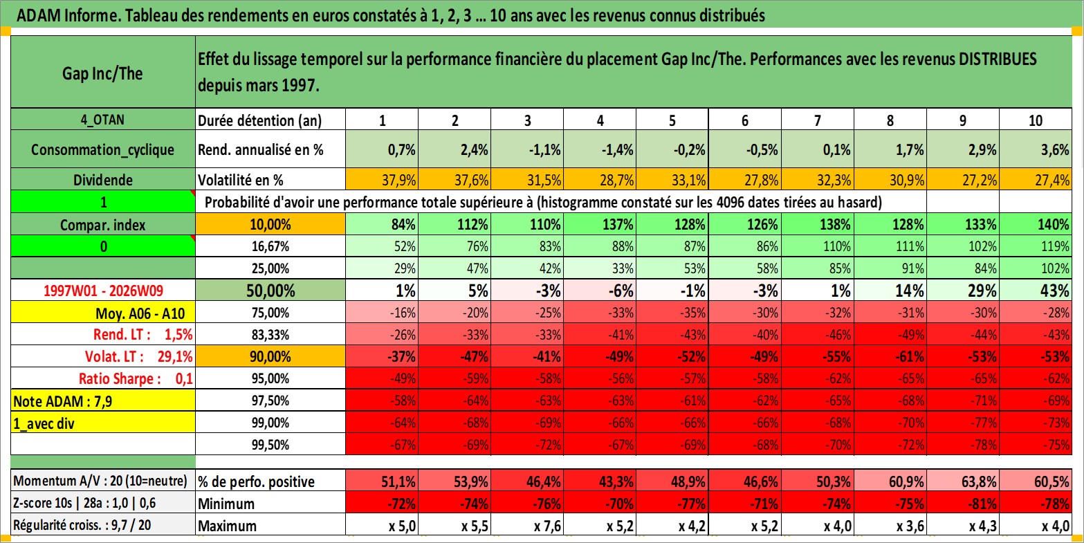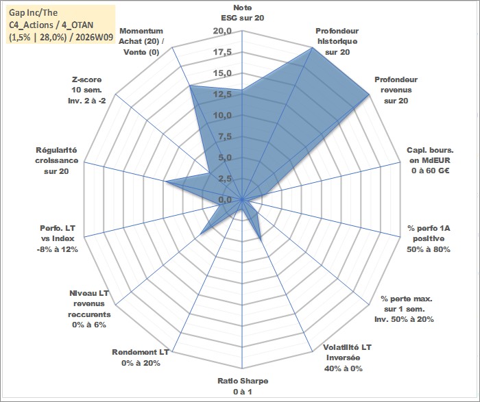 Site dédié aux investisseursPage dédiée sur site financeAnalyse des valorisations hebdomadaires de l'action Gap Inc/The. Cet actif est cote en USD. Les valorisations sont en contrevaleur EURO et couvrent les semaines 1997W01 a 2026W09. Les revenus de cet actif financier sont pris en compte depuis la semaine 1997W10. La note globale ESG de cet actif est estimee a 13.0 (apres rebasage entre 0 et 20).