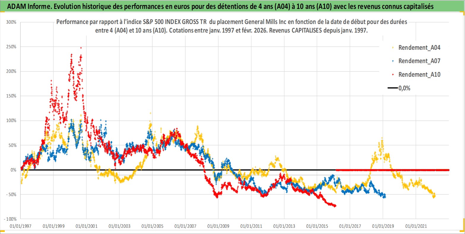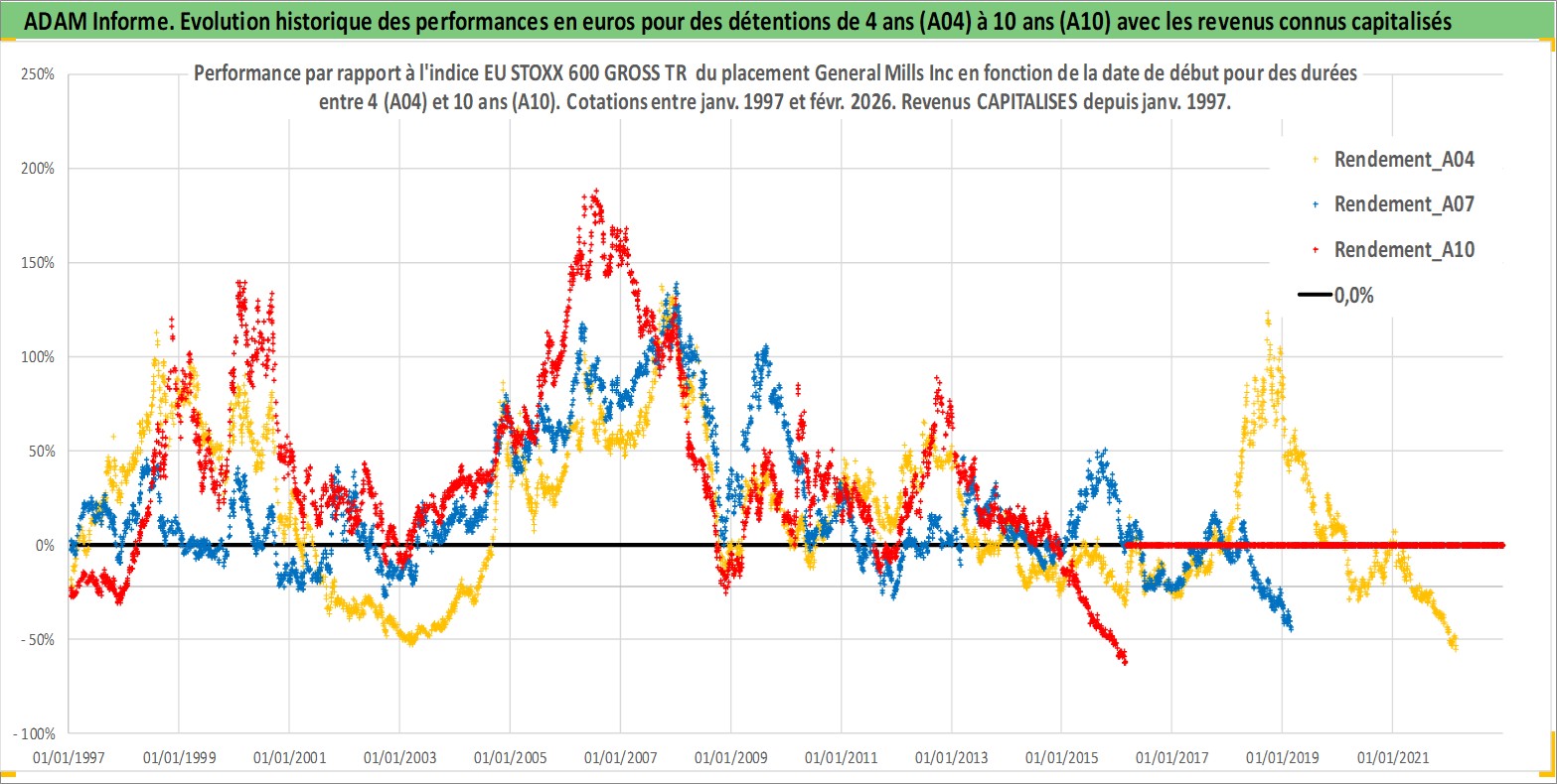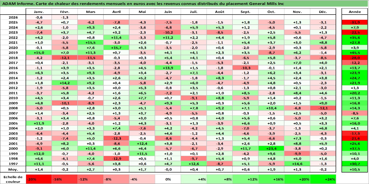 Site dédié aux investisseursPage dédiée sur site financeAnalyse des valorisations hebdomadaires de l'action General Mills Inc. Cet actif est cote en USD. Les valorisations sont en contrevaleur EURO et couvrent les semaines 1997W01 a 2026W09. Les revenus de cet actif financier sont pris en compte depuis la semaine 1997W02. La note globale ESG de cet actif est estimee a 9.0 (apres rebasage entre 0 et 20).