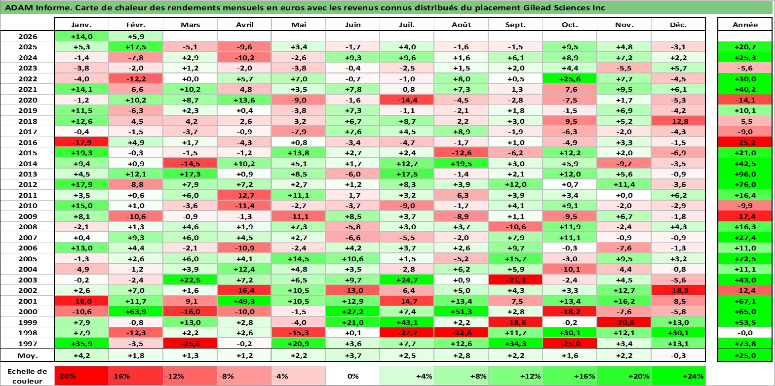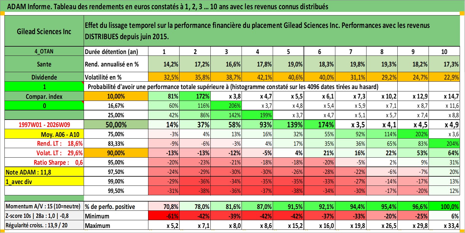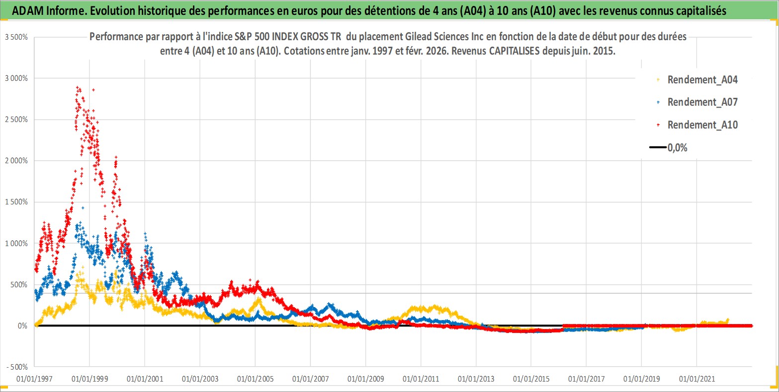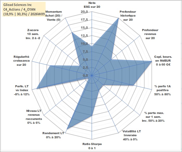 Site dédié aux investisseursPage dédiée sur site financeAnalyse des valorisations hebdomadaires de l'action Gilead Sciences Inc. Cet actif est cote en USD. Les valorisations sont en contrevaleur EURO et couvrent les semaines 1997W01 a 2026W09. Les revenus de cet actif financier sont pris en compte depuis la semaine 2015W24. La note globale ESG de cet actif est estimee a 9.0 (apres rebasage entre 0 et 20).