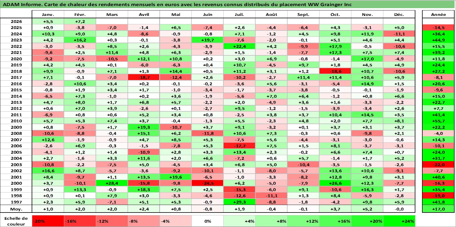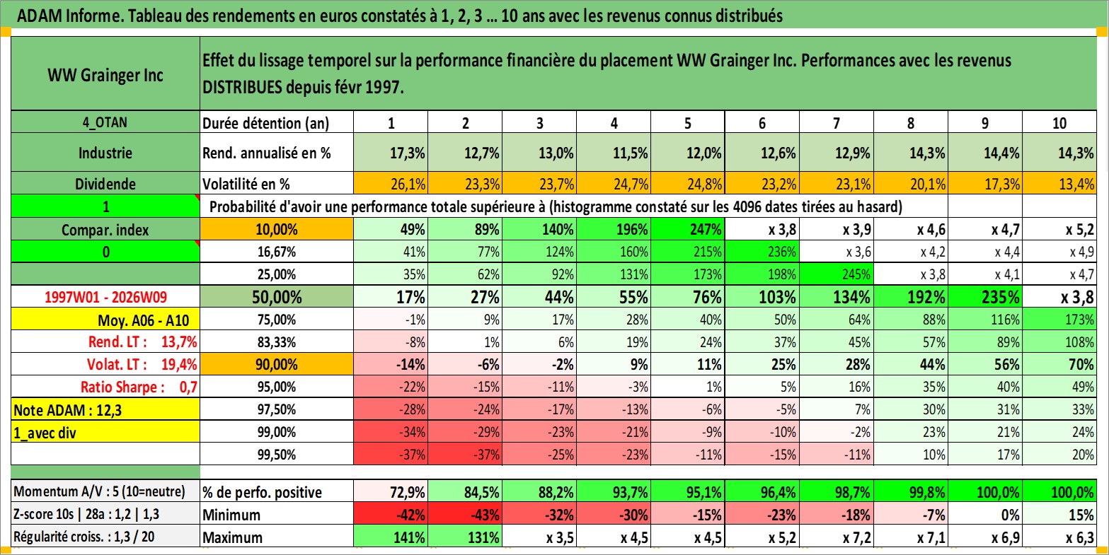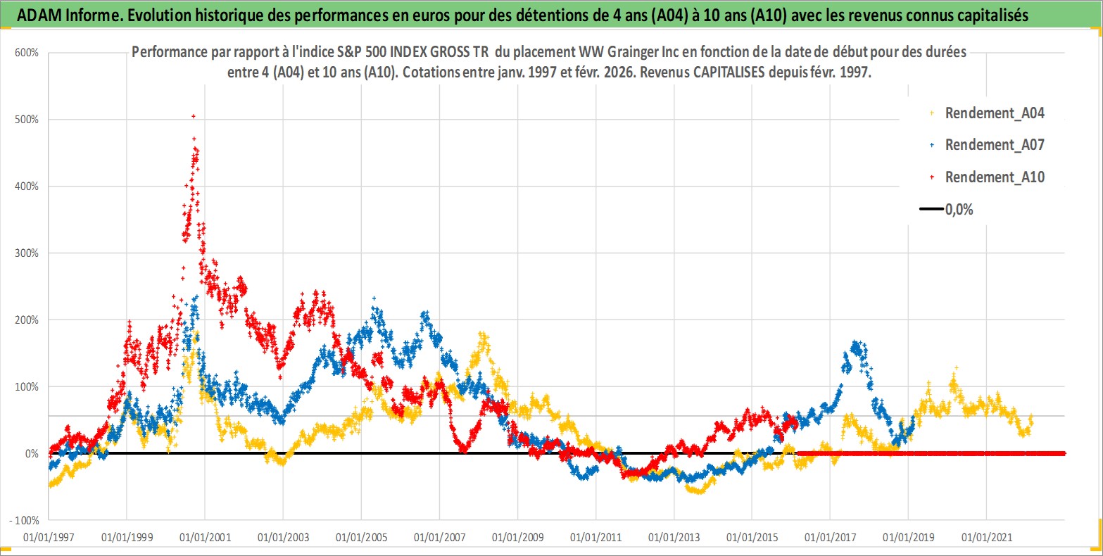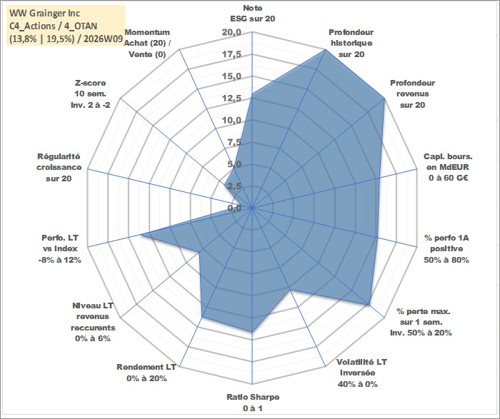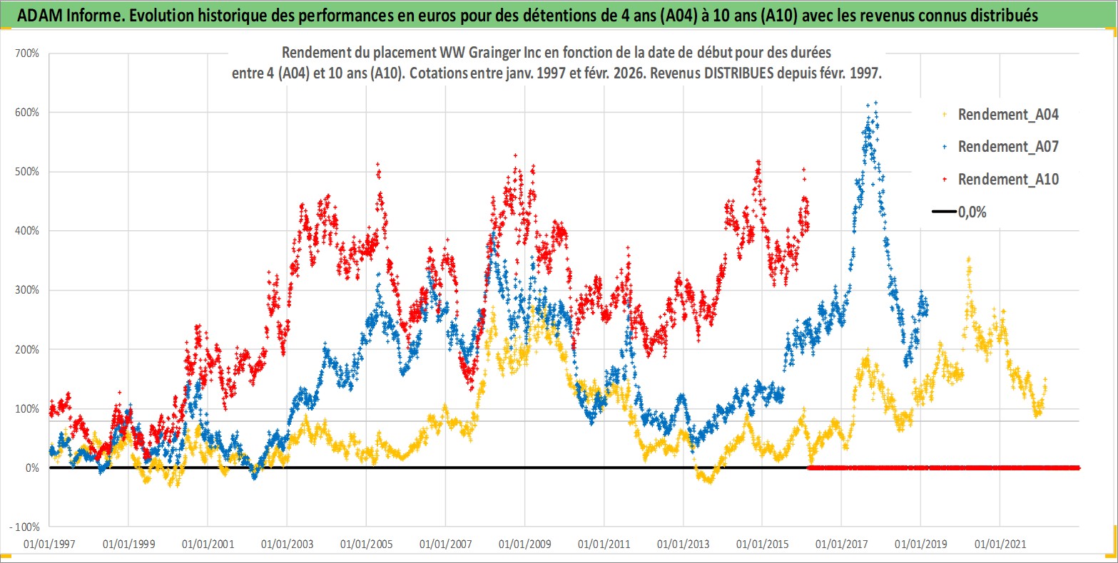 Site dédié aux investisseursPage dédiée sur site financeAnalyse des valorisations hebdomadaires de l'action WW Grainger Inc. Cet actif est cote en USD. Les valorisations sont en contrevaleur EURO et couvrent les semaines 1997W01 a 2026W09. Les revenus de cet actif financier sont pris en compte depuis la semaine 1997W06. La note globale ESG de cet actif est estimee a 13.0 (apres rebasage entre 0 et 20).