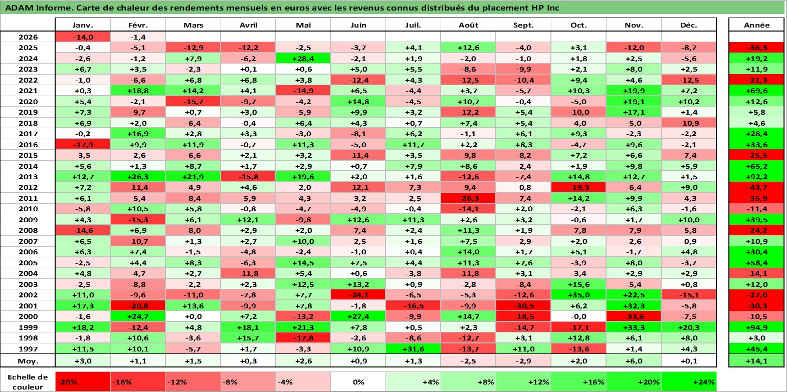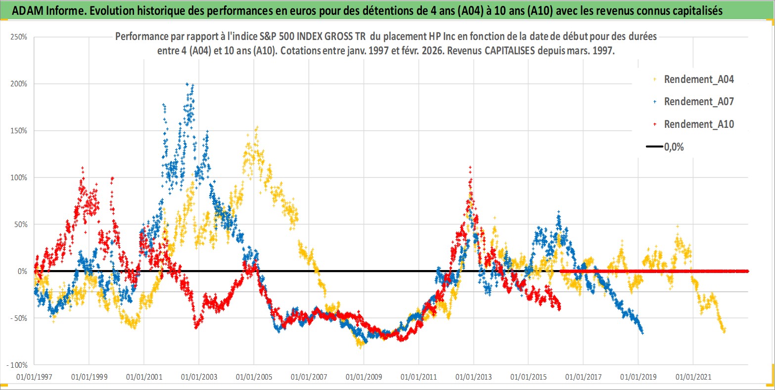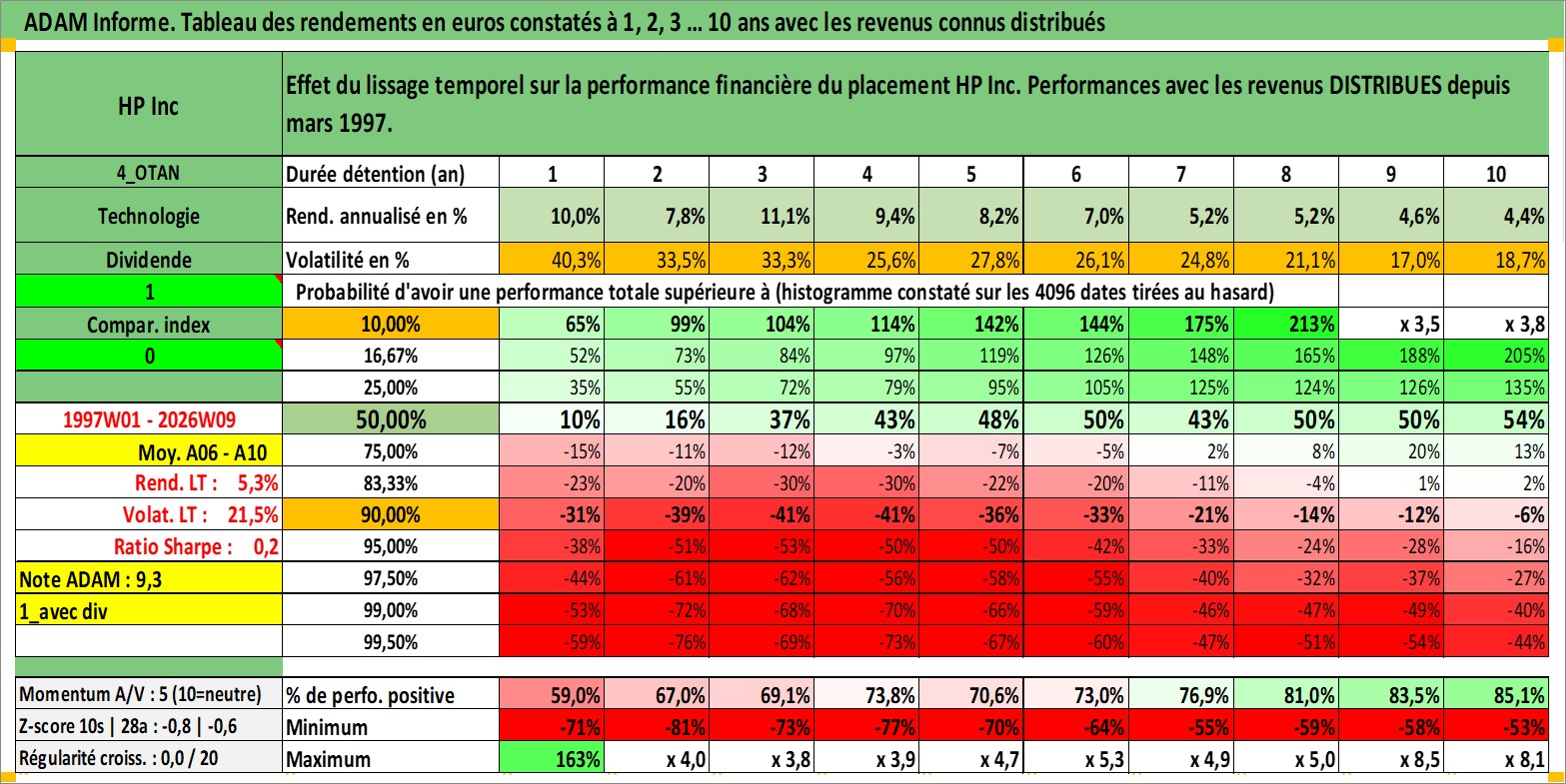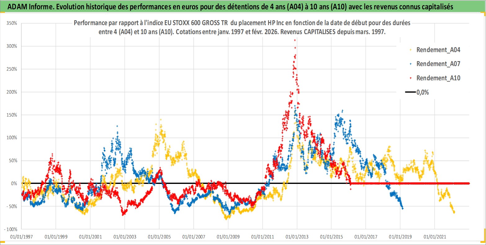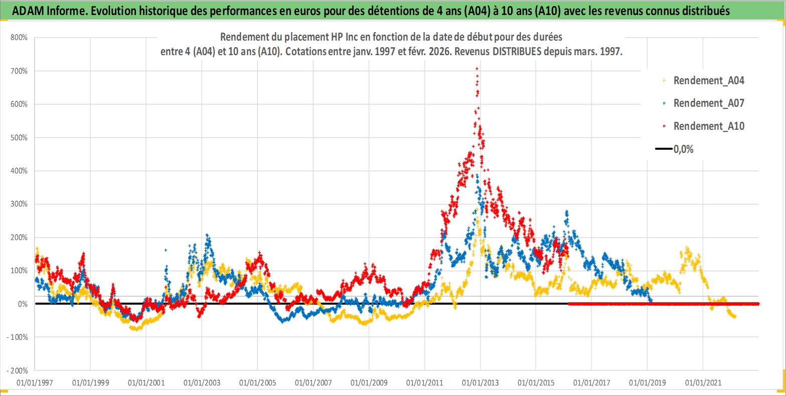 Site dédié aux investisseursPage dédiée sur site financeAnalyse des valorisations hebdomadaires de l'action HP Inc. Cet actif est cote en USD. Les valorisations sont en contrevaleur EURO et couvrent les semaines 1997W01 a 2026W09. Les revenus de cet actif financier sont pris en compte depuis la semaine 1997W13. La note globale ESG de cet actif est estimee a 16.0 (apres rebasage entre 0 et 20).