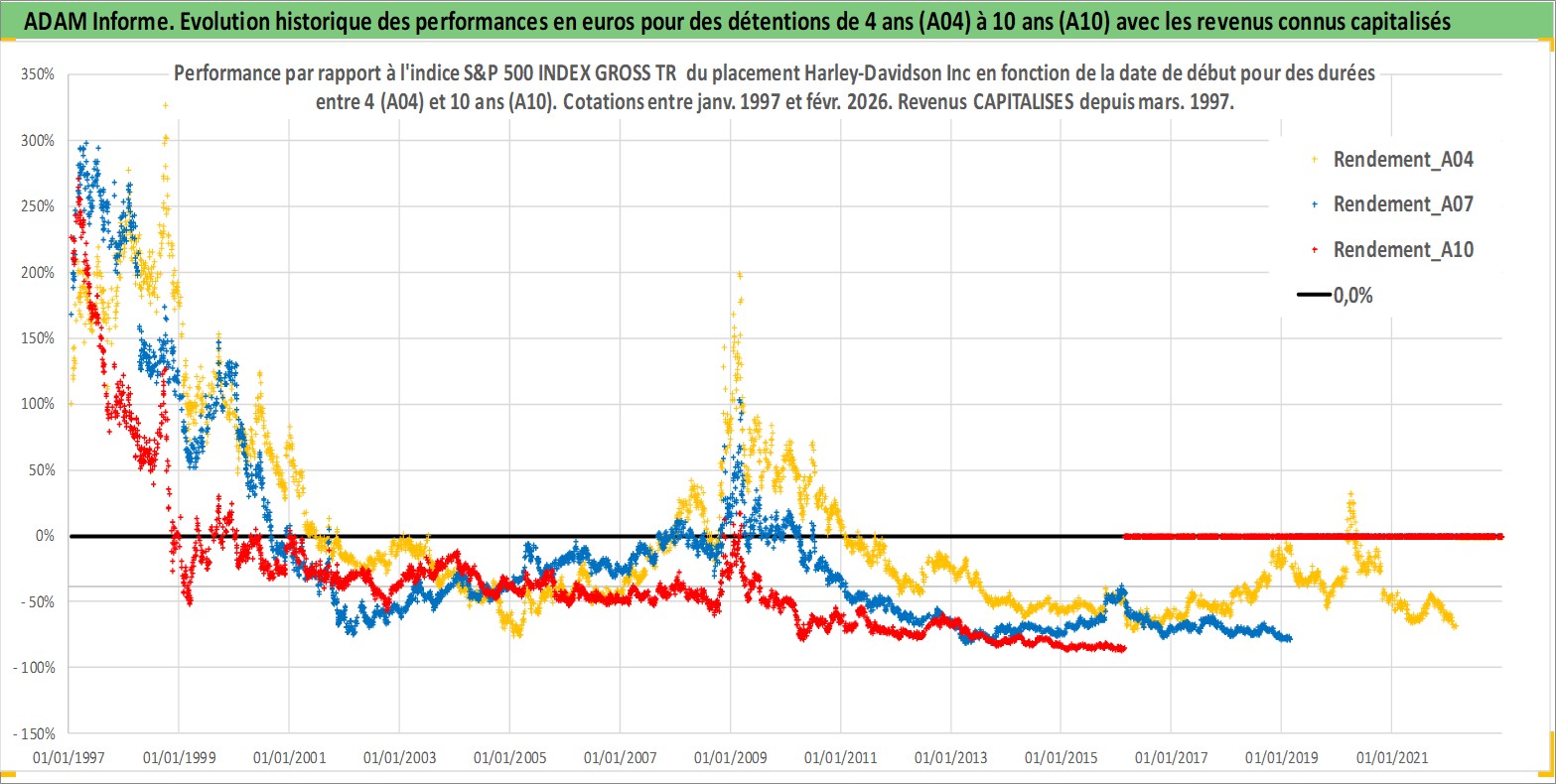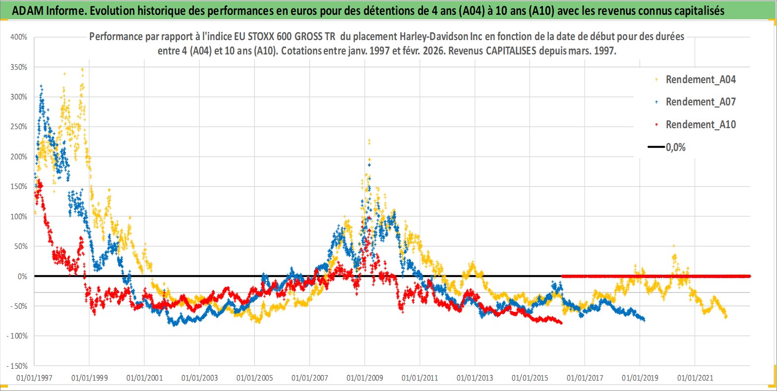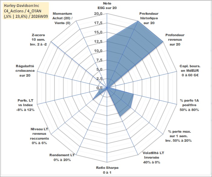 Site dédié aux investisseursPage dédiée sur site financeAnalyse des valorisations hebdomadaires de l'action Harley-Davidson Inc. Cet actif est cote en USD. Les valorisations sont en contrevaleur EURO et couvrent les semaines 1997W01 a 2026W09. Les revenus de cet actif financier sont pris en compte depuis la semaine 1997W11. La note globale ESG de cet actif est estimee a 13.0 (apres rebasage entre 0 et 20).