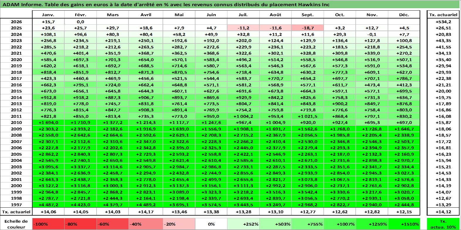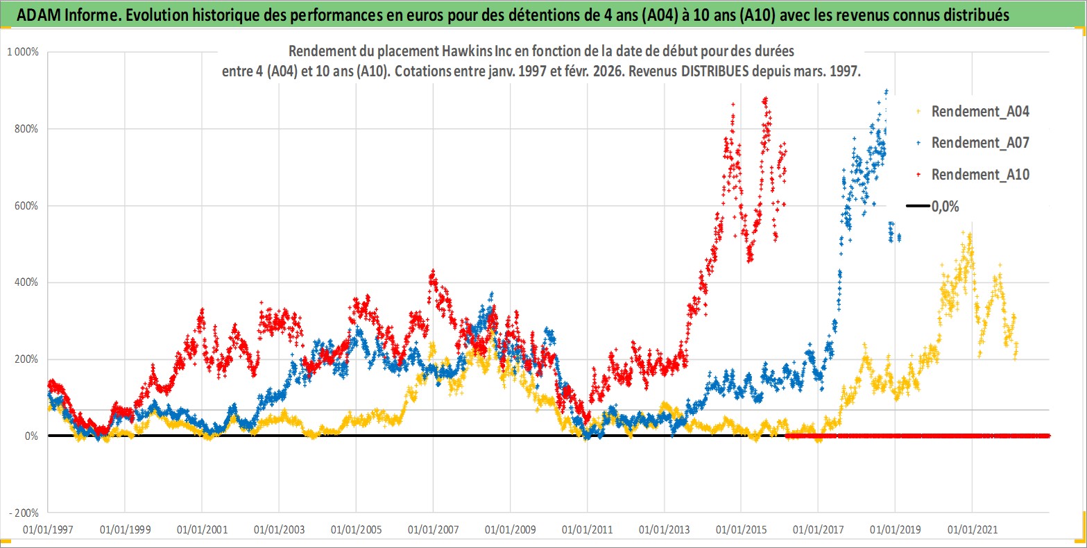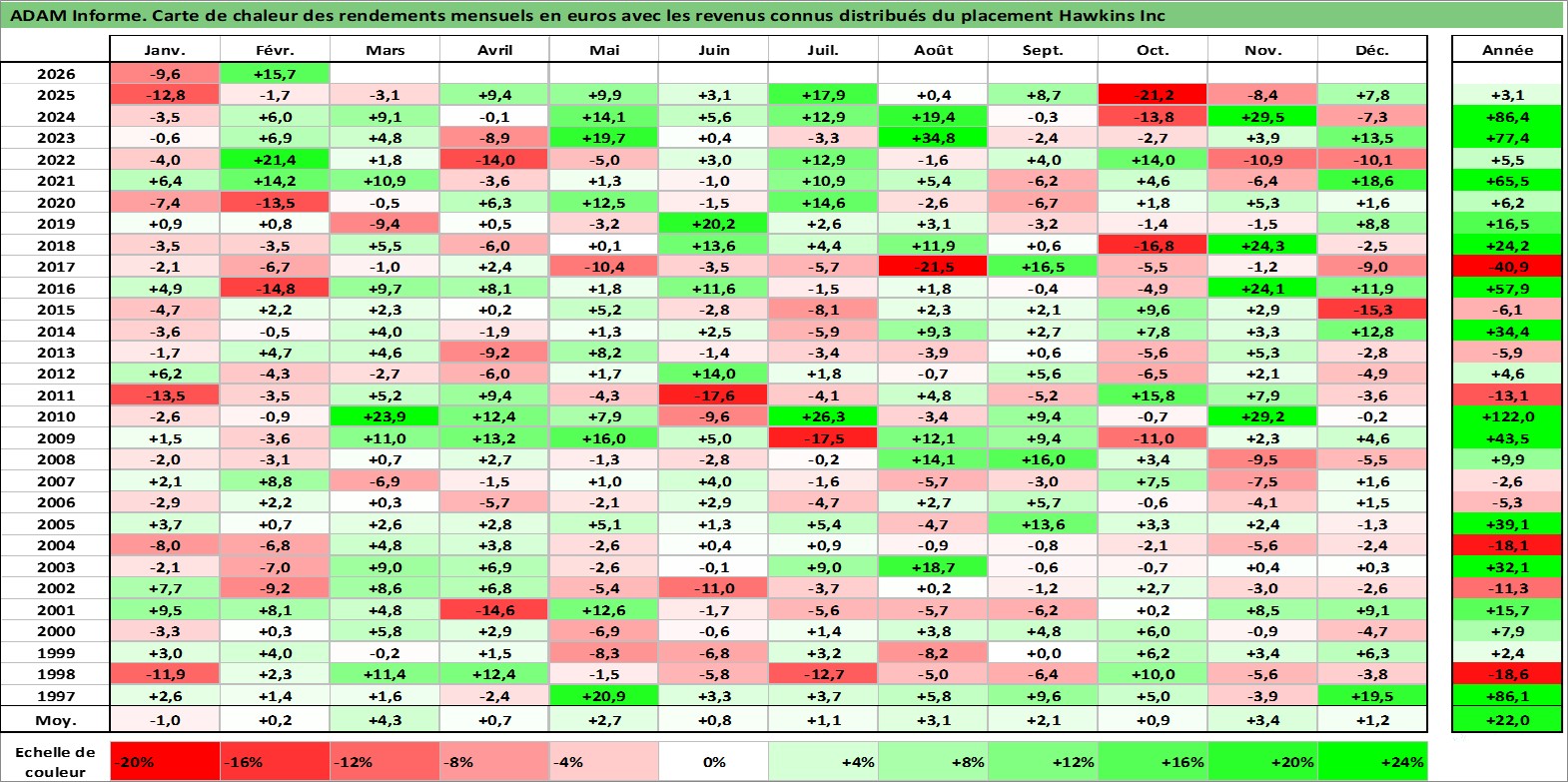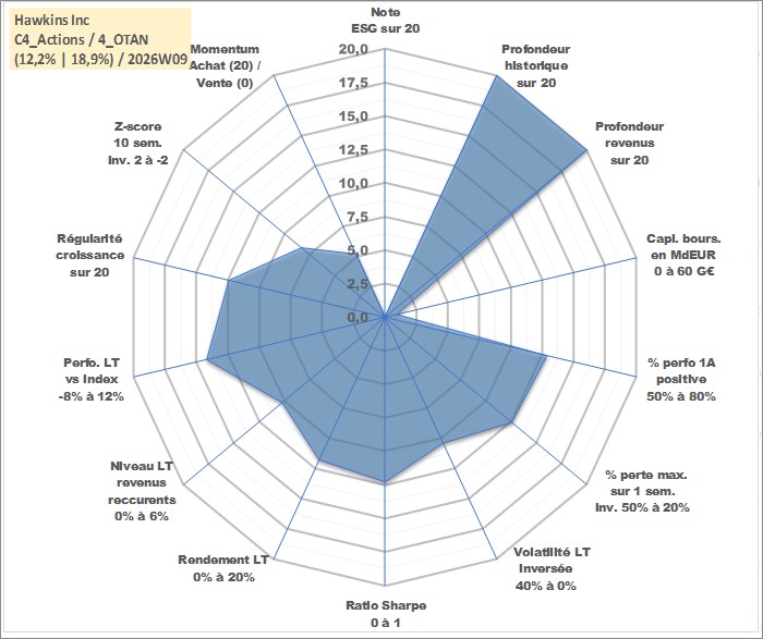 Site dédié aux investisseursPage dédiée sur site financeAnalyse des valorisations hebdomadaires de l'action Hawkins Inc. Cet actif est cote en USD. Les valorisations sont en contrevaleur EURO et couvrent les semaines 1997W01 a 2026W09. Les revenus de cet actif financier sont pris en compte depuis la semaine 1997W13. La note ESG de cet actif n'est pas connue.