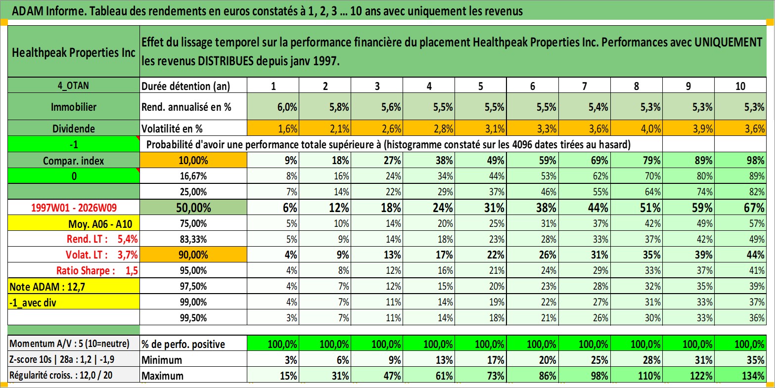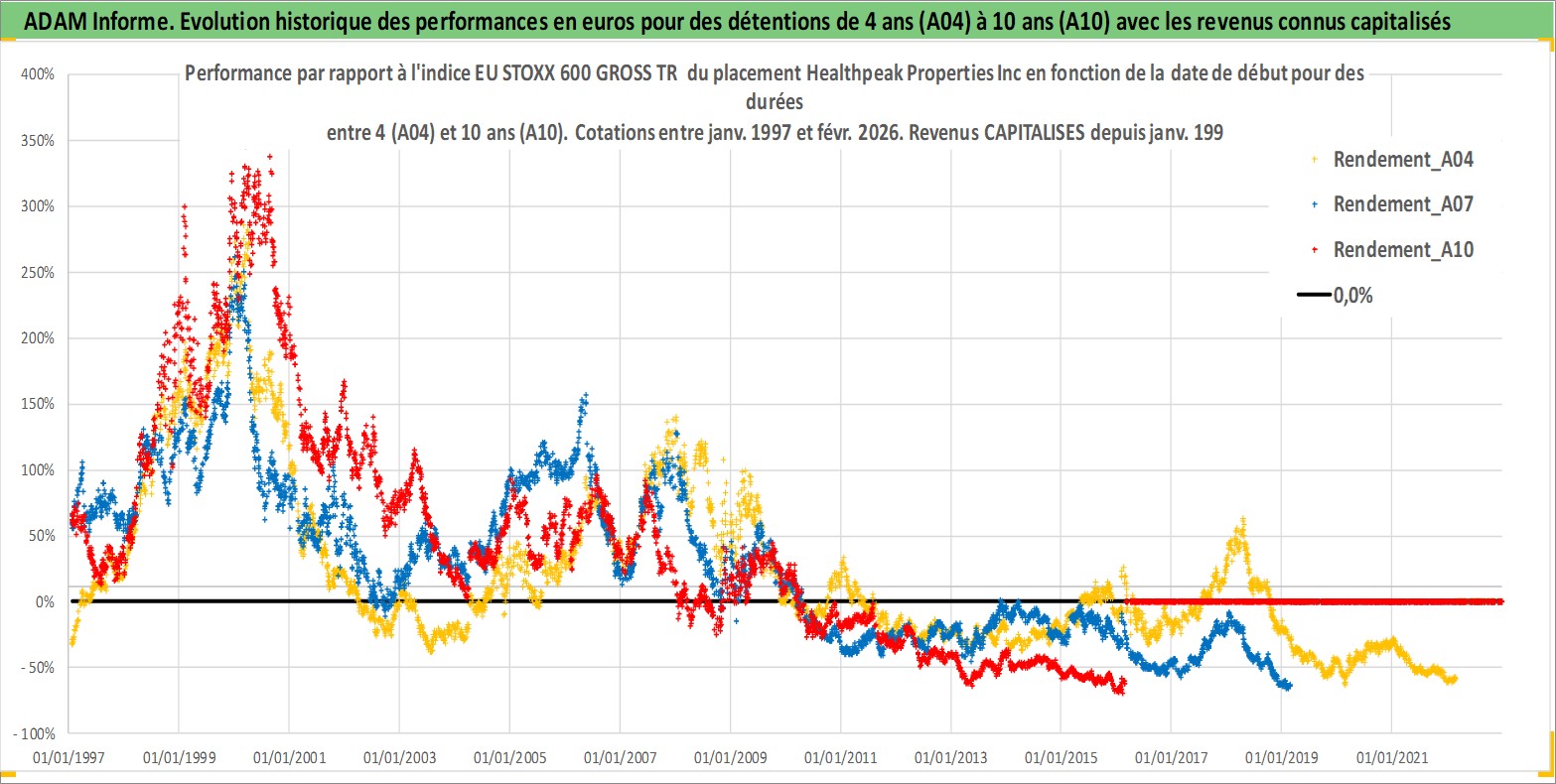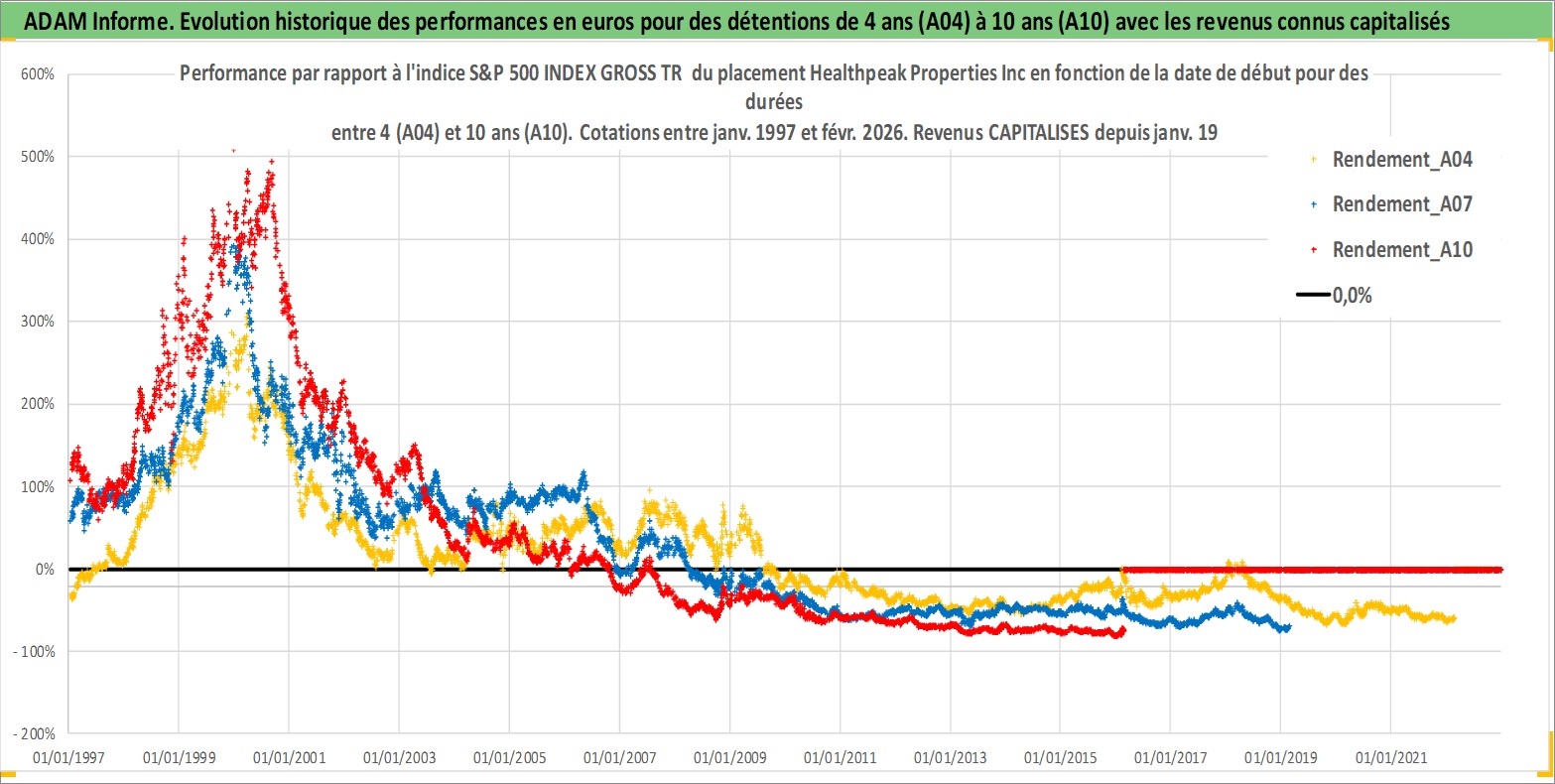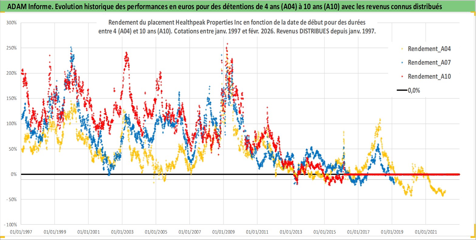 Site dédié aux investisseursPage dédiée sur site financeAnalyse des valorisations hebdomadaires de l'action Healthpeak Properties Inc. Cet actif est cote en USD. Les valorisations sont en contrevaleur EURO et couvrent les semaines 1997W01 a 2026W09. Les revenus de cet actif financier sont pris en compte depuis la semaine 1997W05. La note globale ESG de cet actif est estimee a 17.0 (apres rebasage entre 0 et 20).
