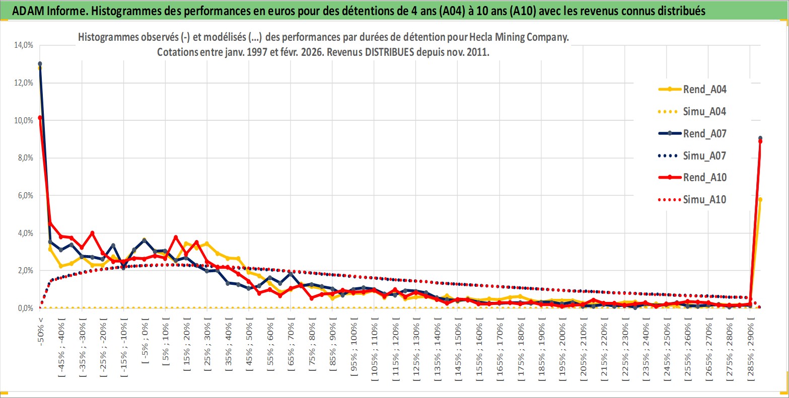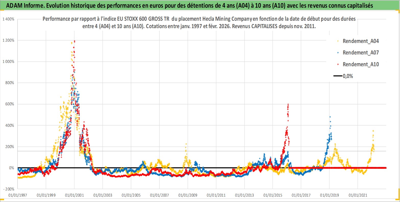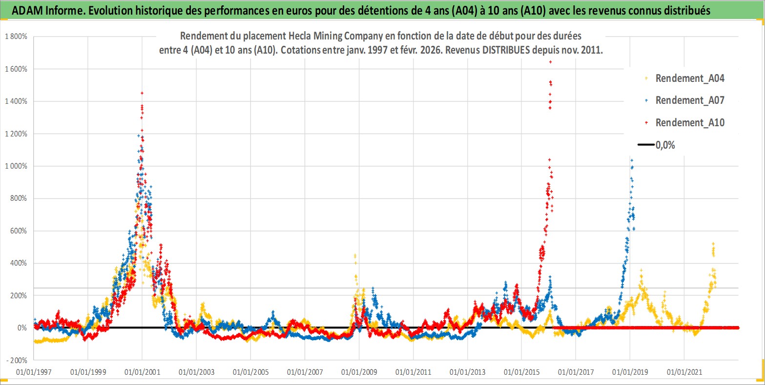 Site dédié aux investisseursPage dédiée sur site financeAnalyse des valorisations hebdomadaires de l'action Hecla Mining Company. Cet actif est cote en USD. Les valorisations sont en contrevaleur EURO et couvrent les semaines 1997W01 a 2026W09. Les revenus de cet actif financier sont pris en compte depuis la semaine 2011W46. La note ESG de cet actif n'est pas connue.