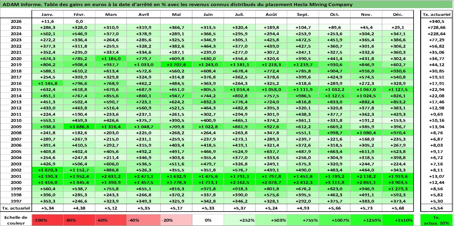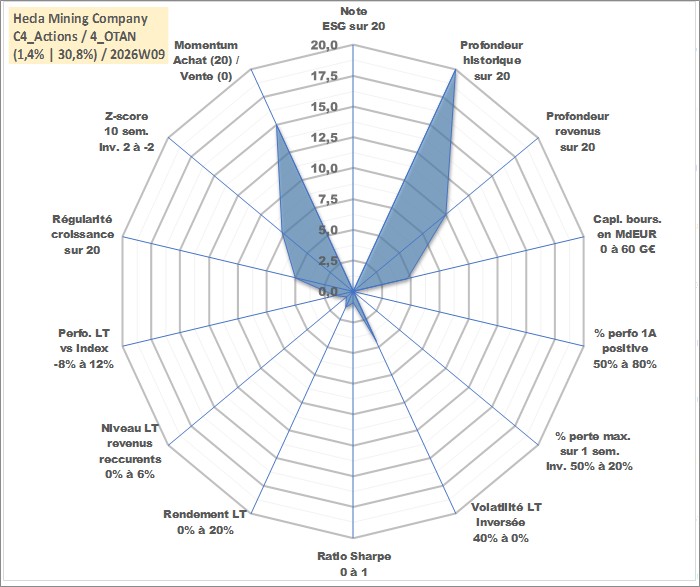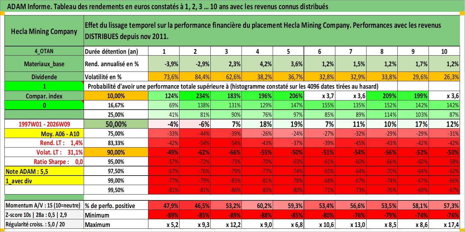 Site dédié aux investisseursPage dédiée sur site financeAnalyse des valorisations hebdomadaires de l'action Hecla Mining Company. Cet actif est cote en USD. Les valorisations sont en contrevaleur EURO et couvrent les semaines 1997W01 a 2026W09. Les revenus de cet actif financier sont pris en compte depuis la semaine 2011W46. La note ESG de cet actif n'est pas connue.
