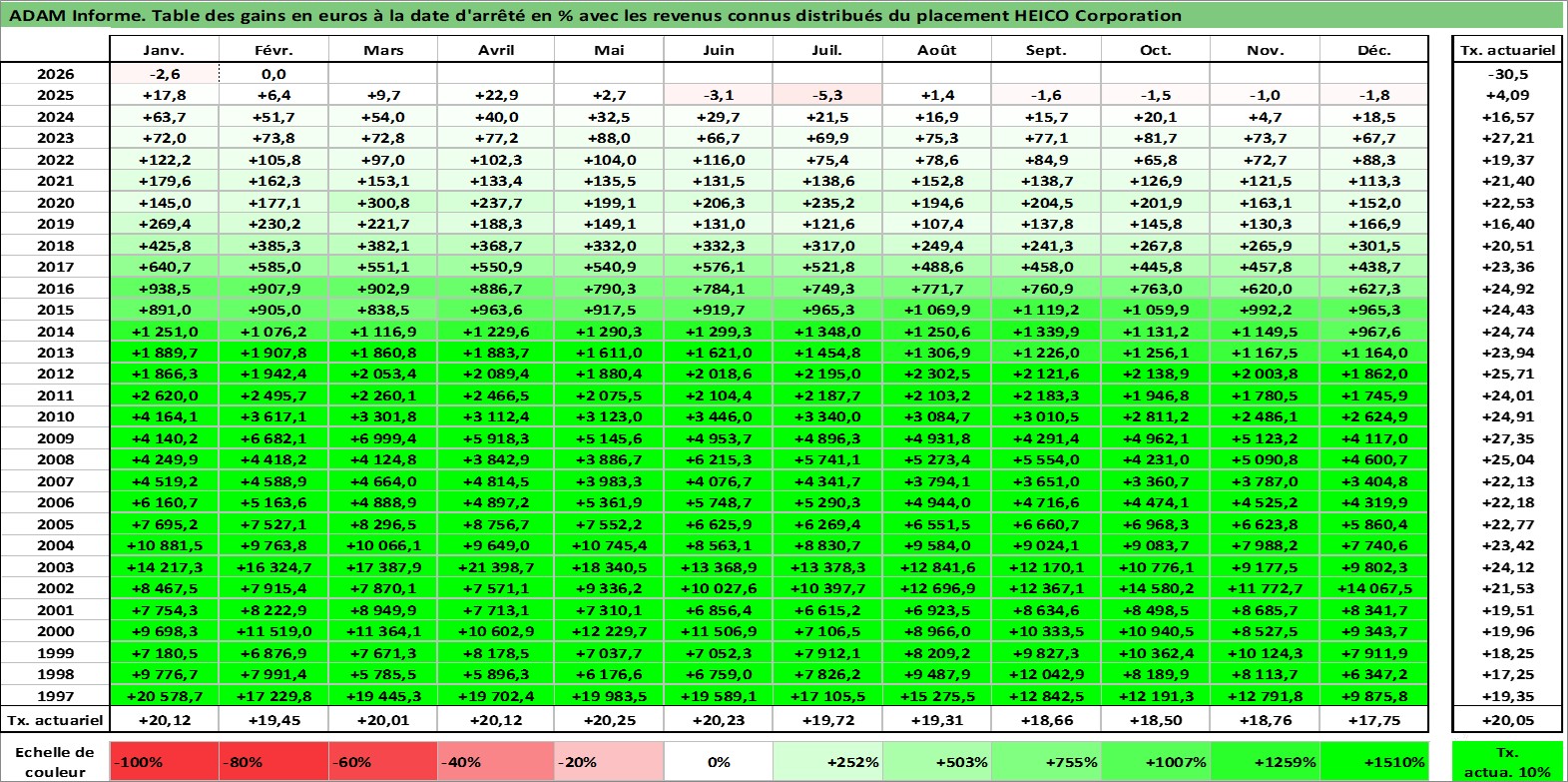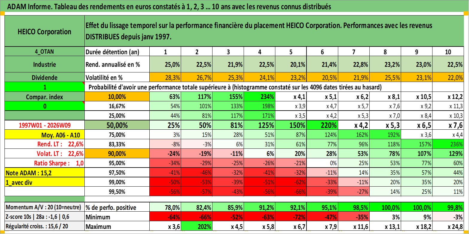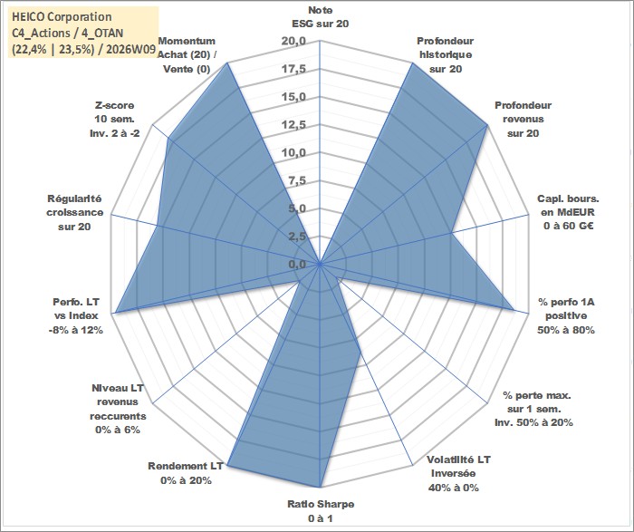 Site dédié aux investisseursPage dédiée sur site financeAnalyse des valorisations hebdomadaires de l'action HEICO Corporation. Cet actif est cote en USD. Les valorisations sont en contrevaleur EURO et couvrent les semaines 1997W01 a 2026W09. Les revenus de cet actif financier sont pris en compte depuis la semaine 1997W02. La note ESG de cet actif n'est pas connue.