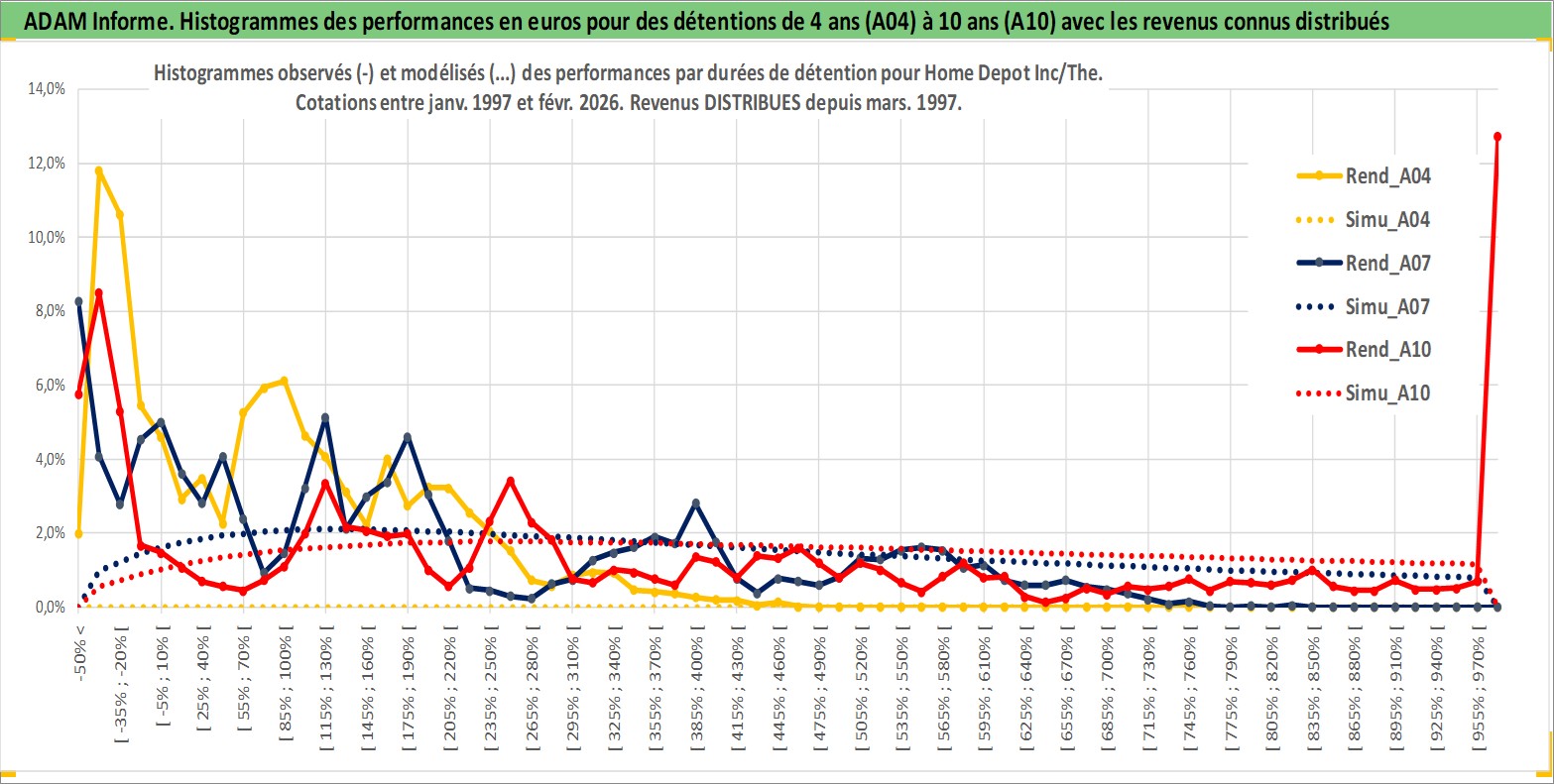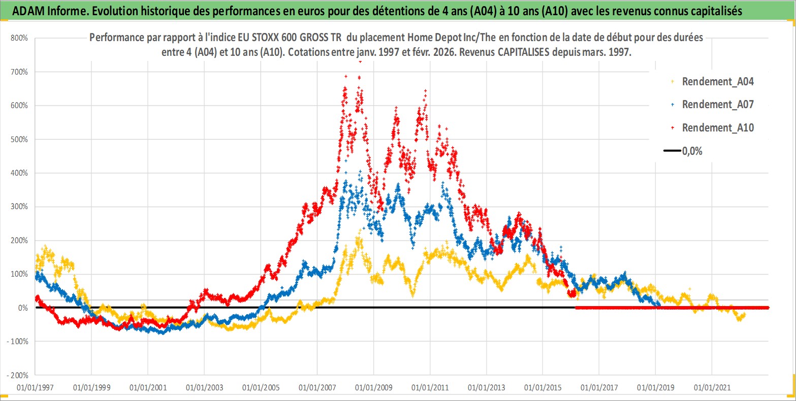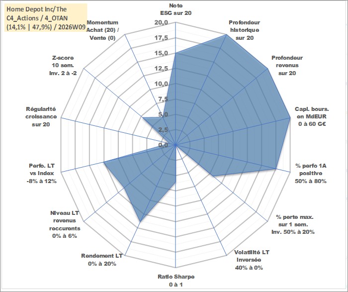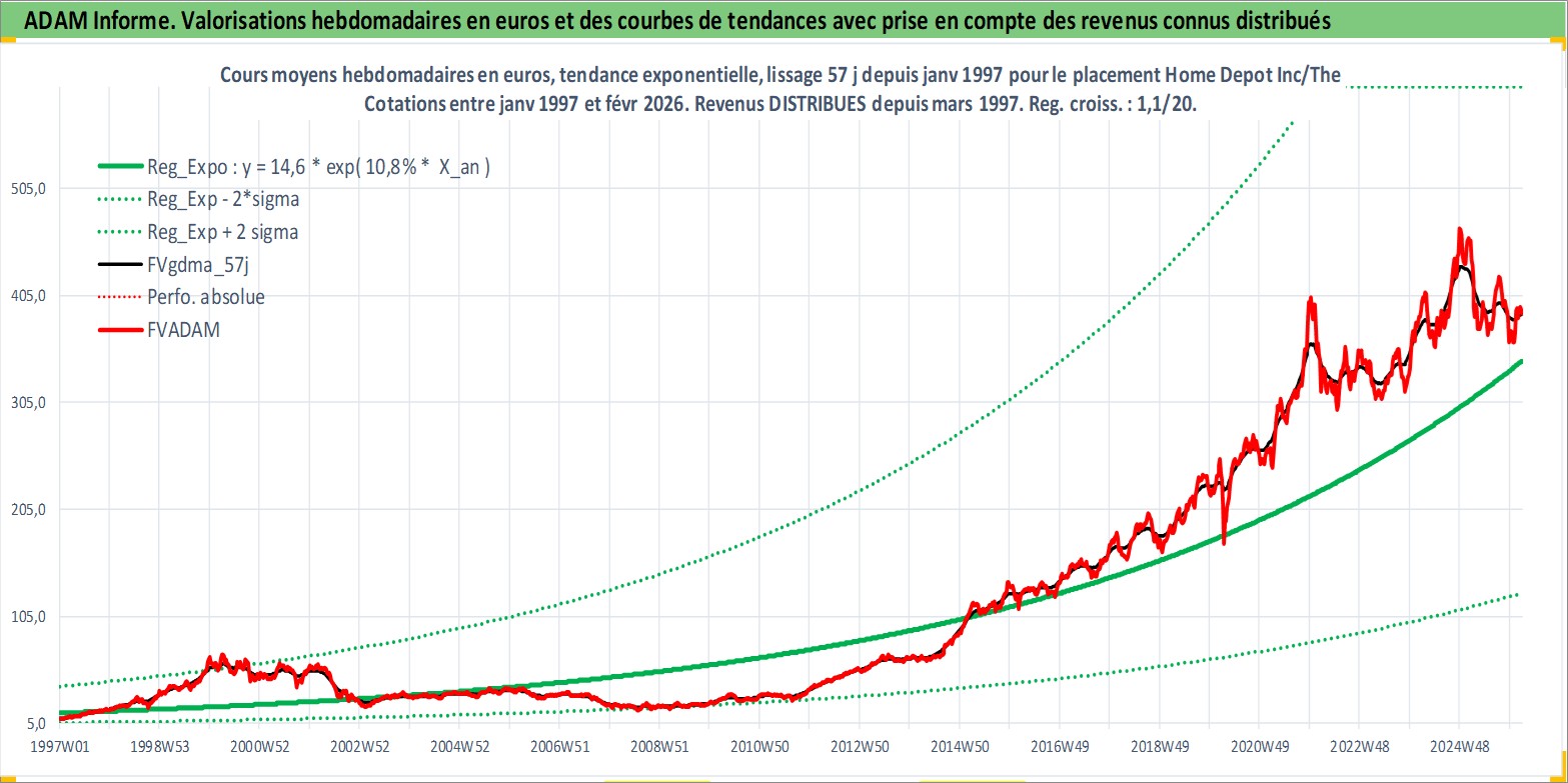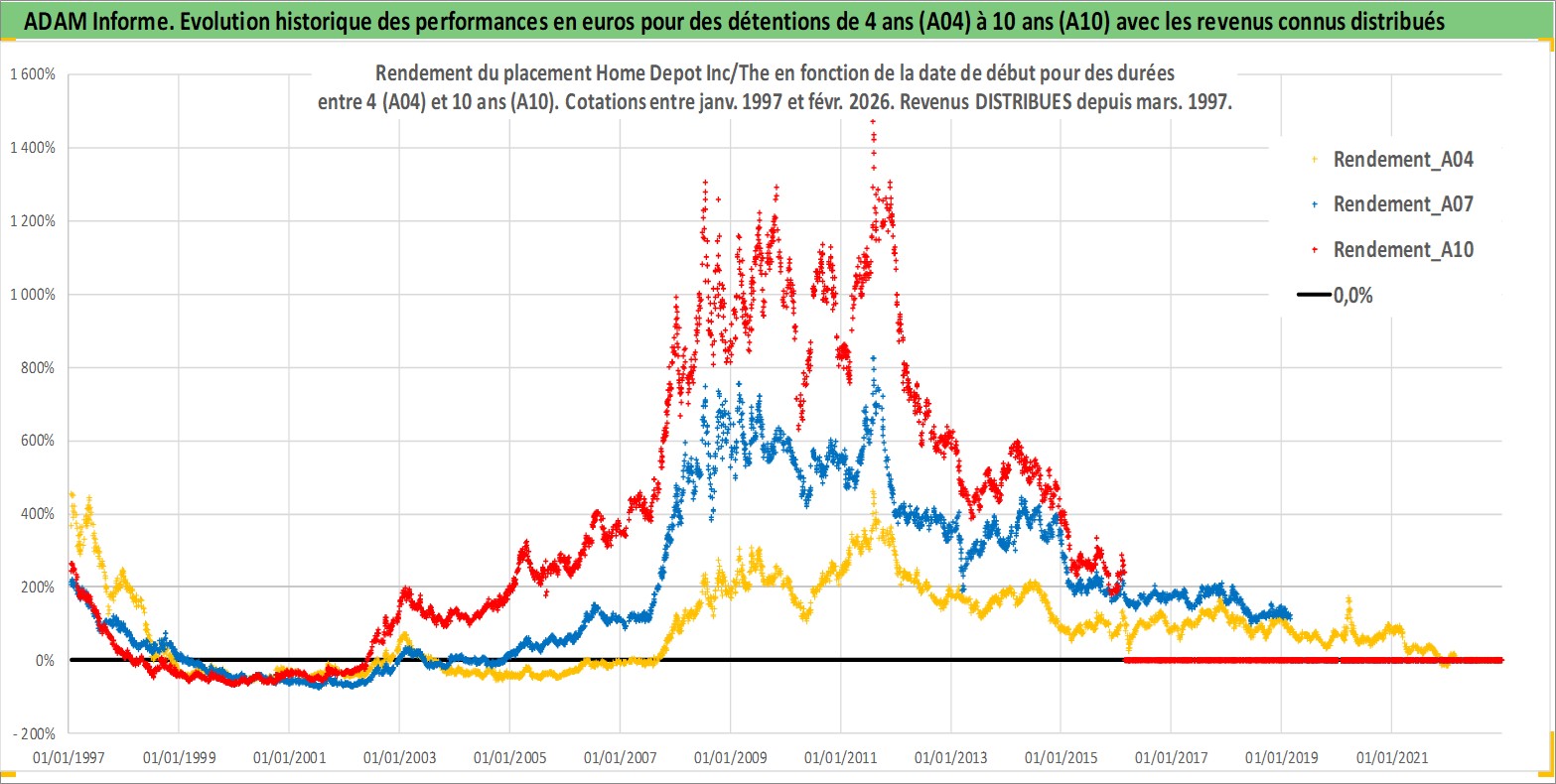 Site dédié aux investisseursPage dédiée sur site financeAnalyse des valorisations hebdomadaires de l'action Home Depot Inc/The. Cet actif est cote en USD. Les valorisations sont en contrevaleur EURO et couvrent les semaines 1997W01 a 2026W09. Les revenus de cet actif financier sont pris en compte depuis la semaine 1997W11. La note globale ESG de cet actif est estimee a 15.0 (apres rebasage entre 0 et 20).