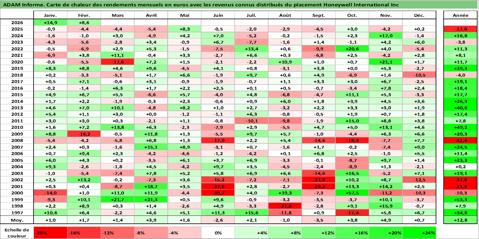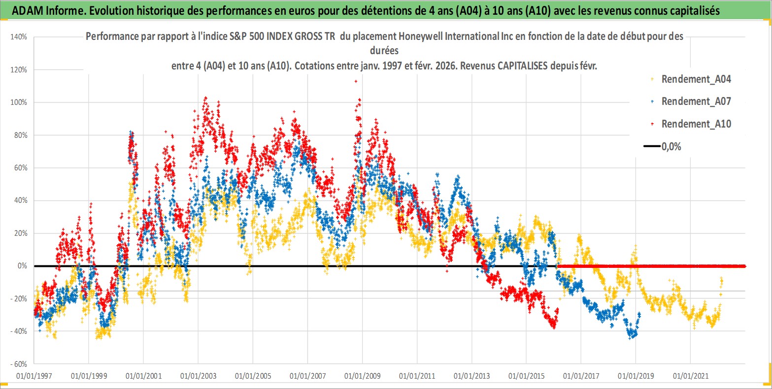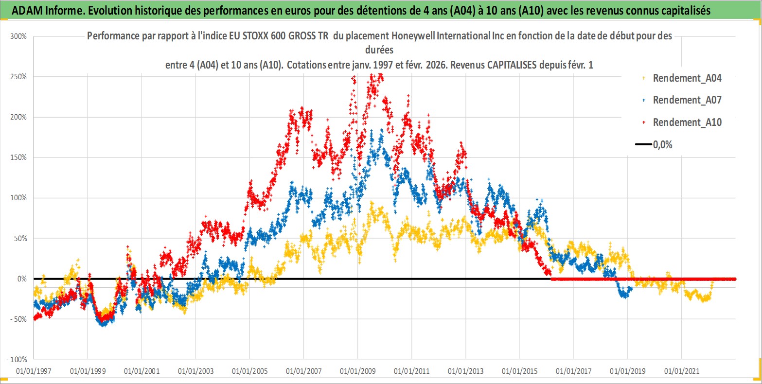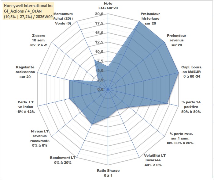 Site dédié aux investisseursPage dédiée sur site financeAnalyse des valorisations hebdomadaires de l'action Honeywell International Inc. Cet actif est cote en USD. Les valorisations sont en contrevaleur EURO et couvrent les semaines 1997W01 a 2026W09. Les revenus de cet actif financier sont pris en compte depuis la semaine 1997W08. La note globale ESG de cet actif est estimee a 6.0 (apres rebasage entre 0 et 20).