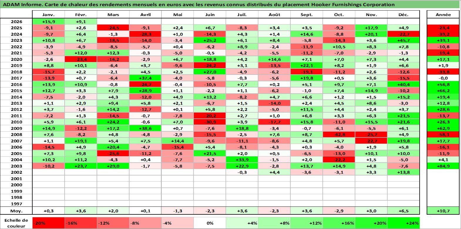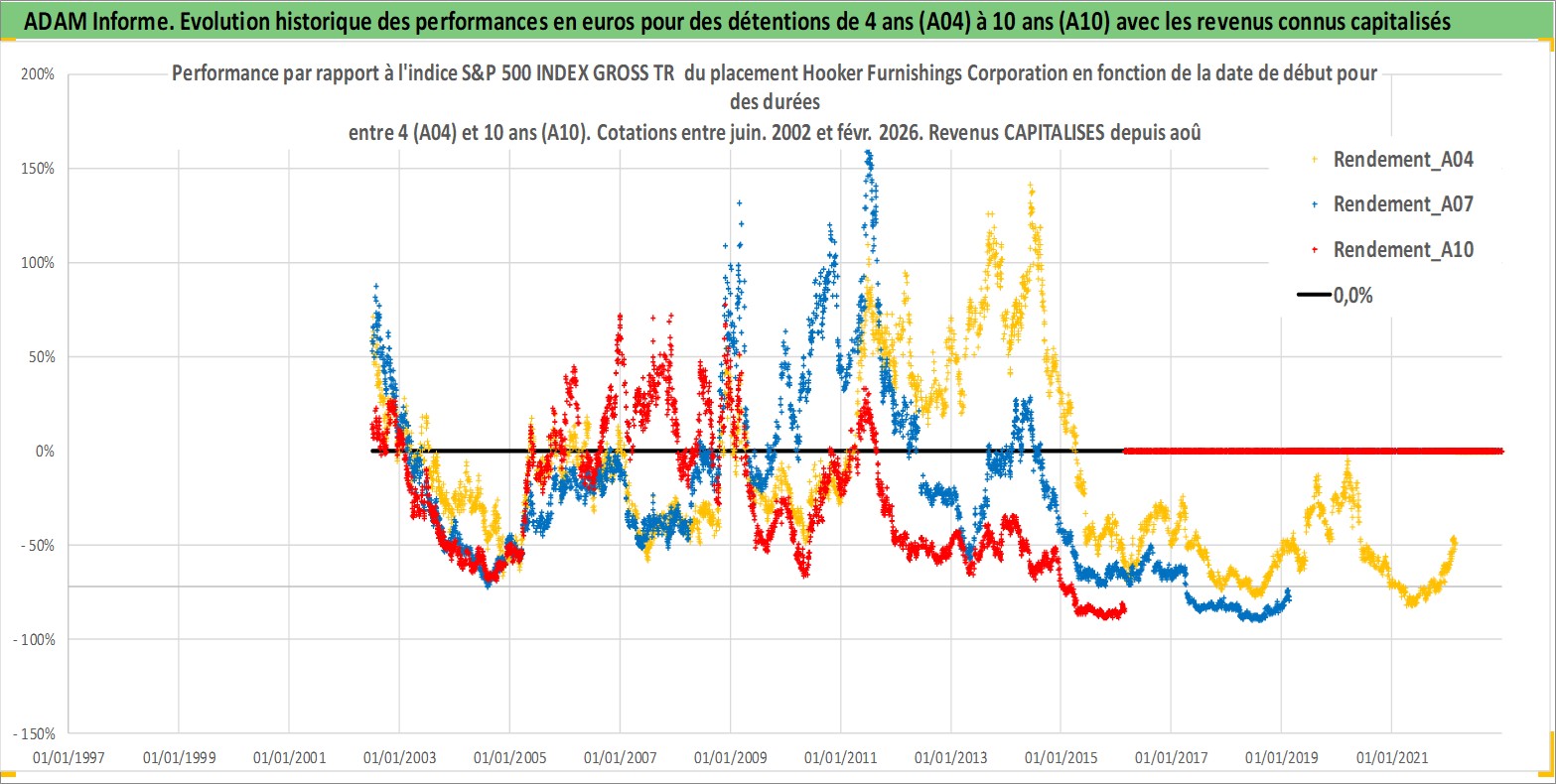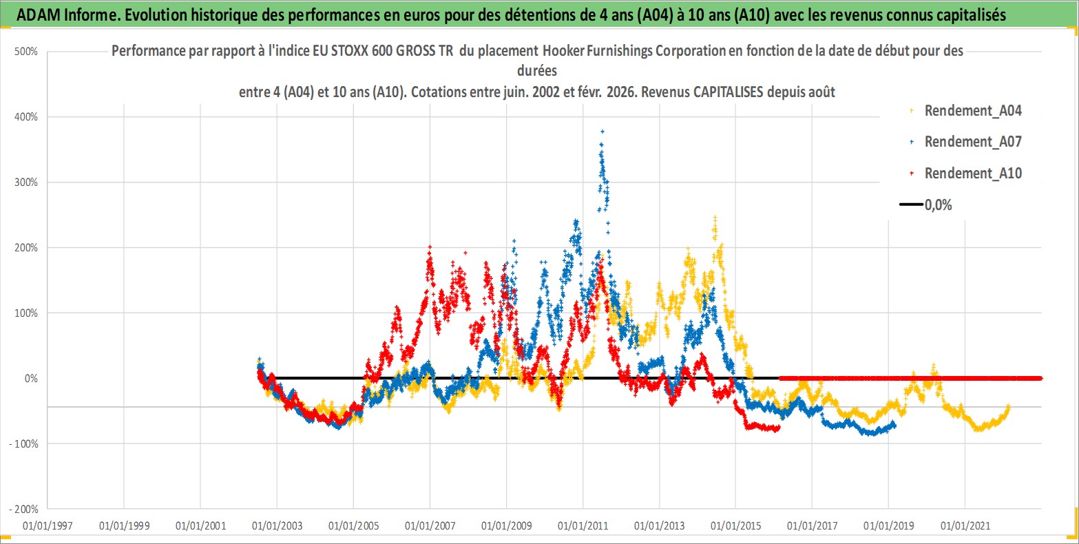 Site dédié aux investisseursPage dédiée sur site financeAnalyse des valorisations hebdomadaires de l'action Hooker Furnishings Corporation. Cet actif est cote en USD. Les valorisations sont en contrevaleur EURO et couvrent les semaines 2002W26 a 2026W09. Les revenus de cet actif financier sont pris en compte depuis la semaine 2002W33. La note ESG de cet actif n'est pas connue.
