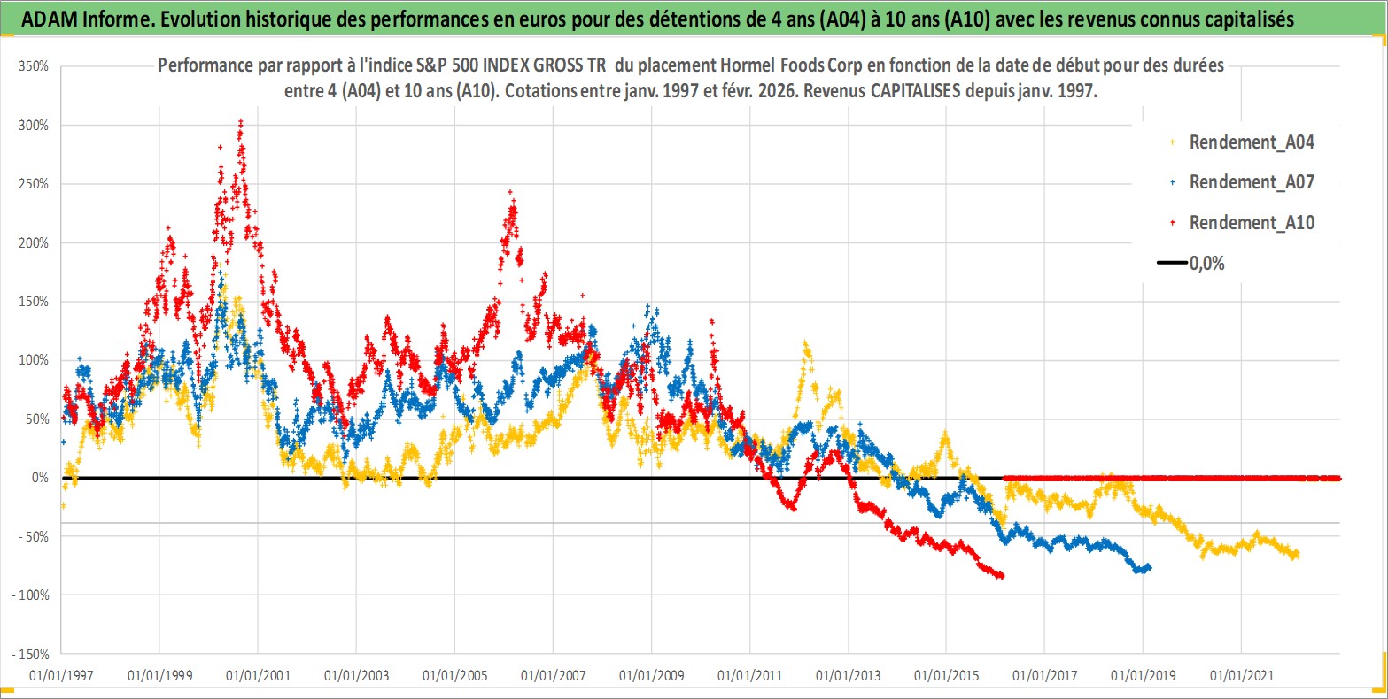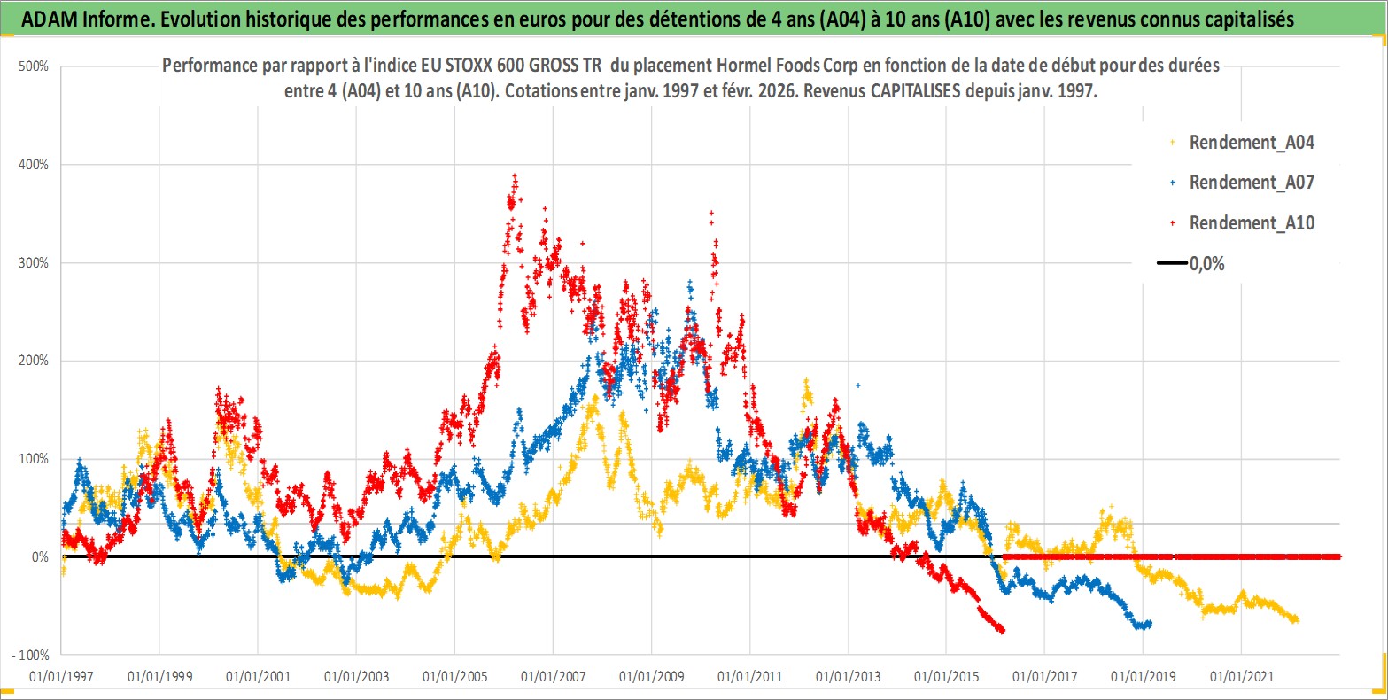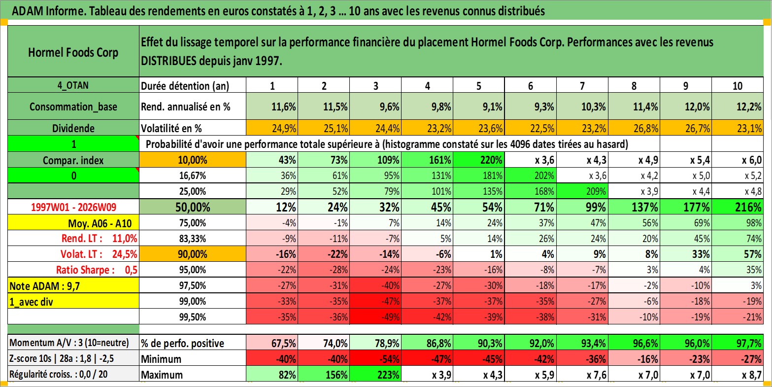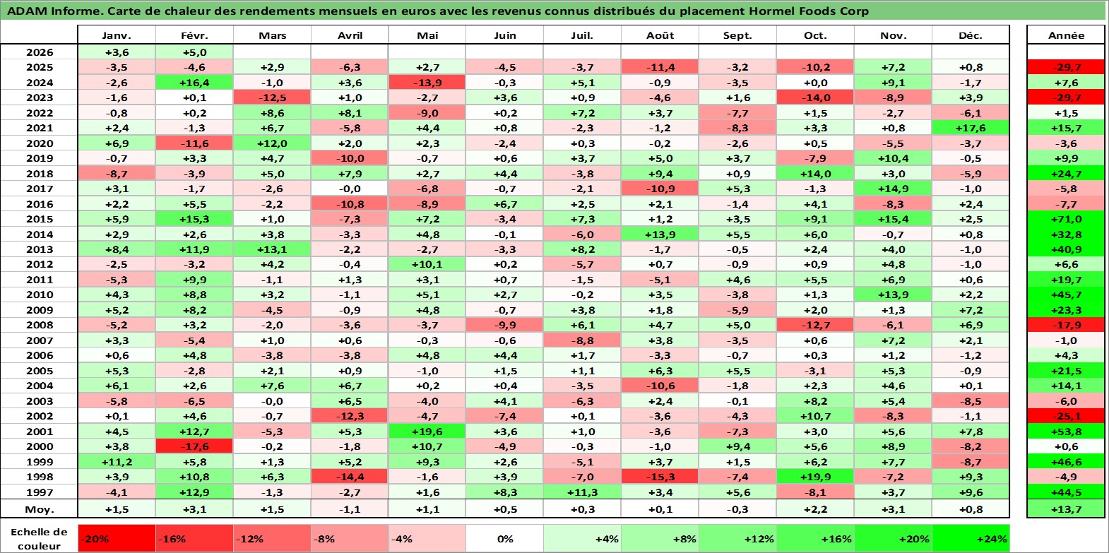 Site dédié aux investisseursPage dédiée sur site financeAnalyse des valorisations hebdomadaires de l'action Hormel Foods Corp. Cet actif est cote en USD. Les valorisations sont en contrevaleur EURO et couvrent les semaines 1997W01 a 2026W09. Les revenus de cet actif financier sont pris en compte depuis la semaine 1997W03. La note globale ESG de cet actif est estimee a 5.0 (apres rebasage entre 0 et 20).