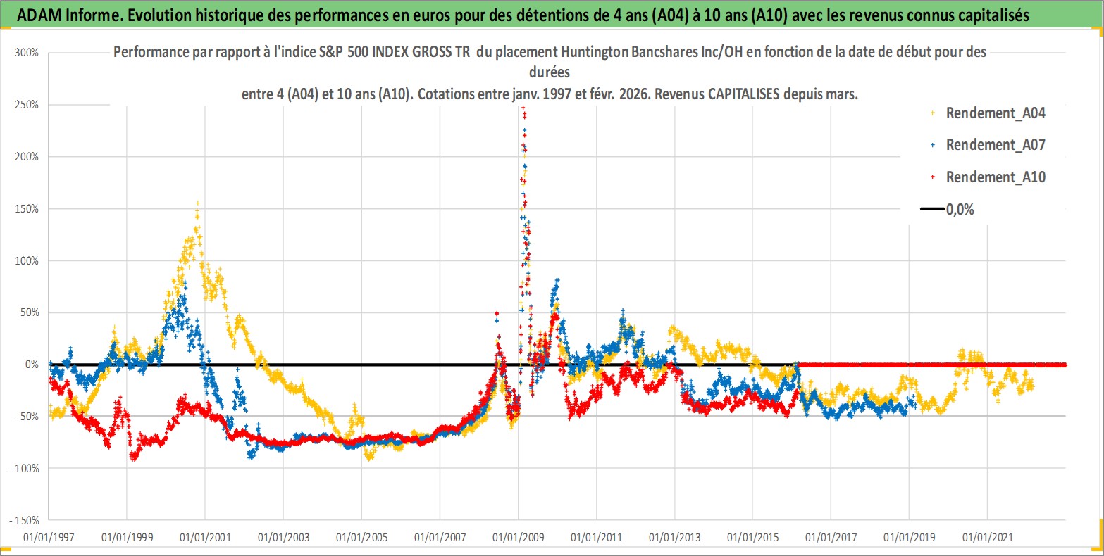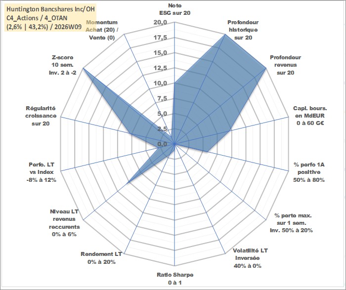 Site dédié aux investisseursPage dédiée sur site financeAnalyse des valorisations hebdomadaires de l'action Huntington Bancshares Inc/OH. Cet actif est cote en USD. Les valorisations sont en contrevaleur EURO et couvrent les semaines 1997W01 a 2026W09. Les revenus de cet actif financier sont pris en compte depuis la semaine 1997W11. La note globale ESG de cet actif est estimee a 10.0 (apres rebasage entre 0 et 20).