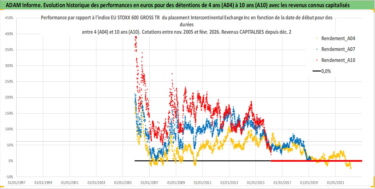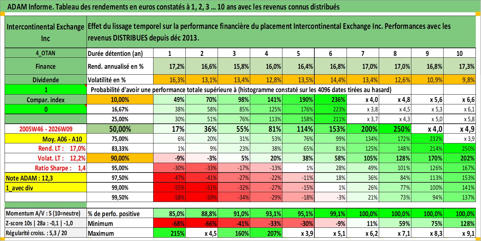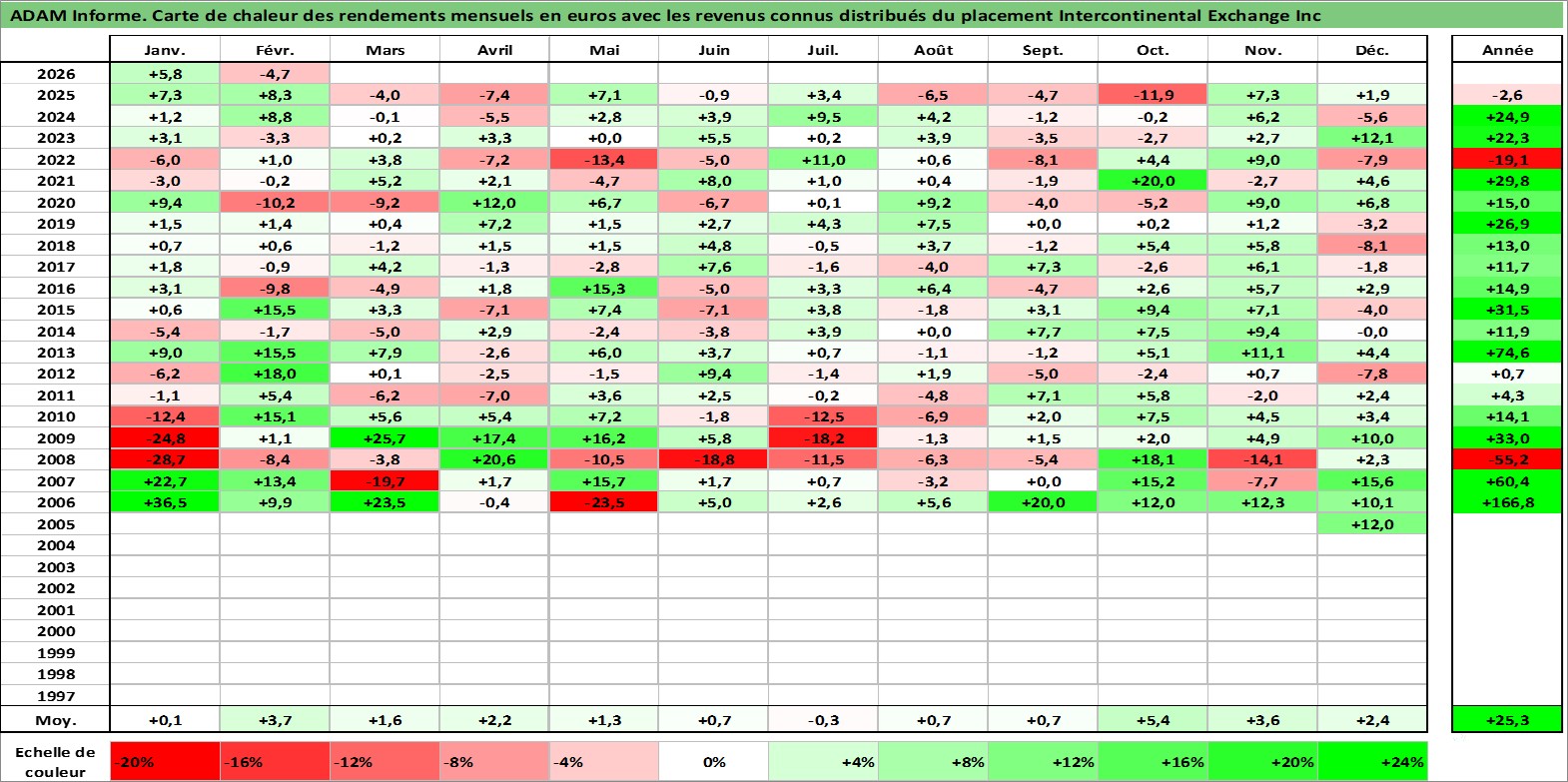 Site dédié aux investisseursPage dédiée sur site financeAnalyse des valorisations hebdomadaires de l'action Intercontinental Exchange Inc. Cet actif est cote en USD. Les valorisations sont en contrevaleur EURO et couvrent les semaines 2005W46 a 2026W09. Les revenus de cet actif financier sont pris en compte depuis la semaine 2013W50. La note globale ESG de cet actif est estimee a 13.0 (apres rebasage entre 0 et 20).