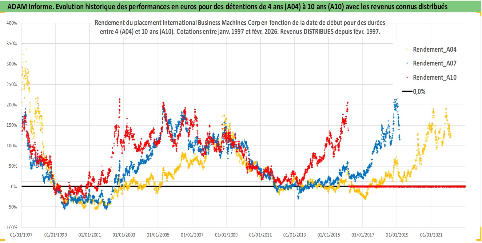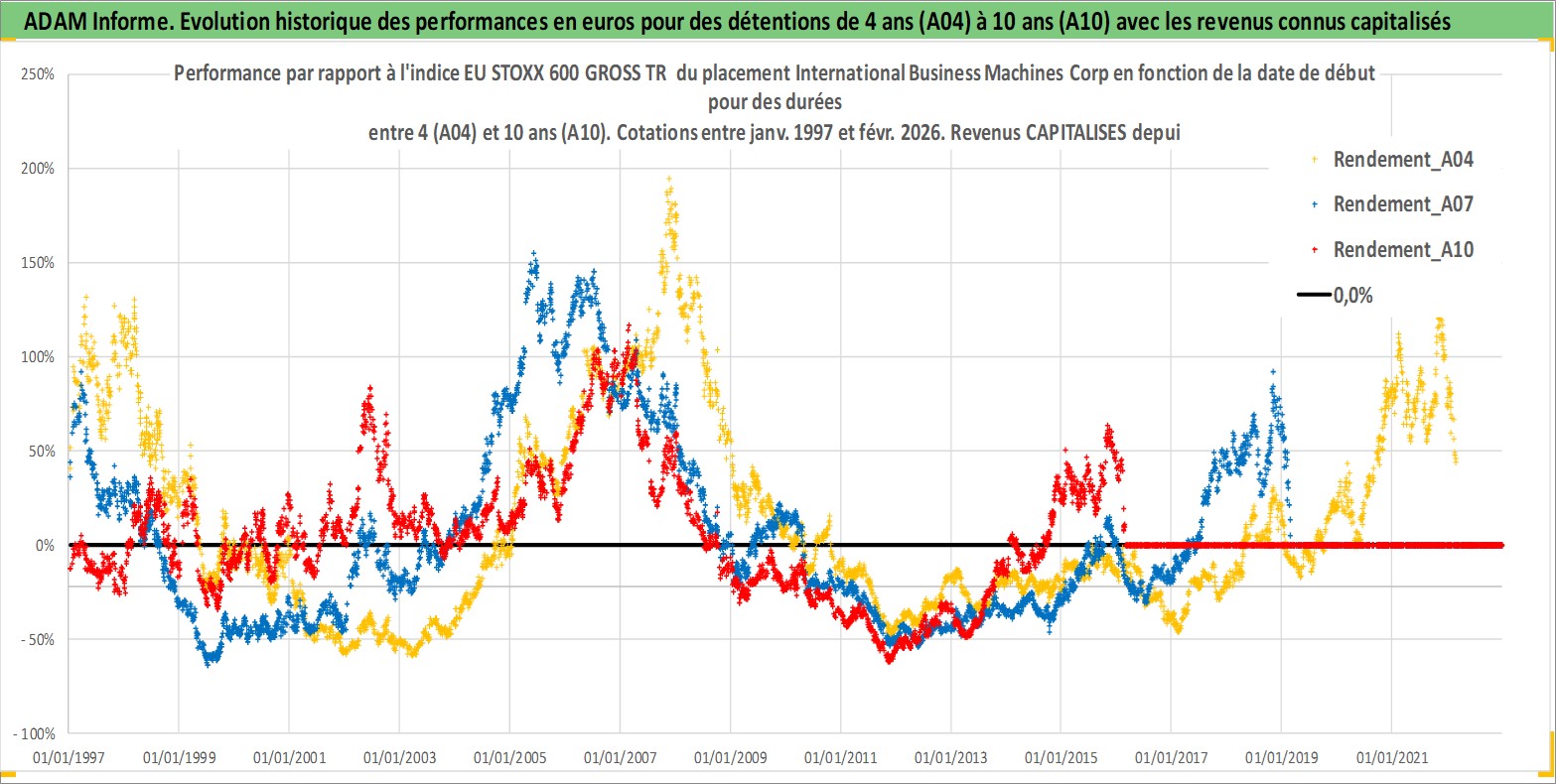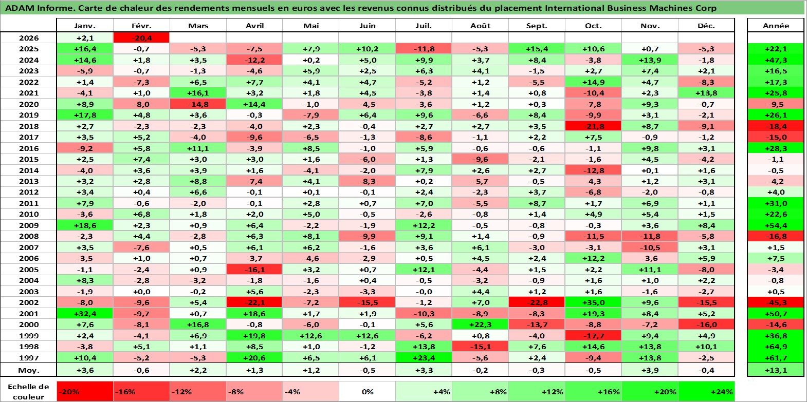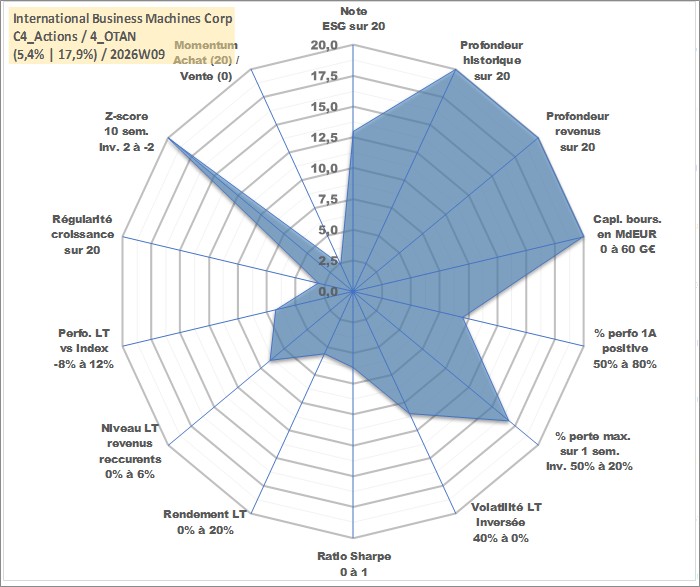 Site dédié aux investisseursPage dédiée sur site financeAnalyse des valorisations hebdomadaires de l'action International Business Machines Corp. Cet actif est cote en USD. Les valorisations sont en contrevaleur EURO et couvrent les semaines 1997W01 a 2026W09. Les revenus de cet actif financier sont pris en compte depuis la semaine 1997W06. La note globale ESG de cet actif est estimee a 13.0 (apres rebasage entre 0 et 20).