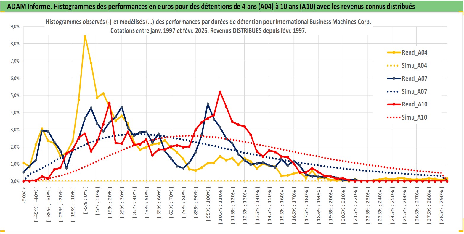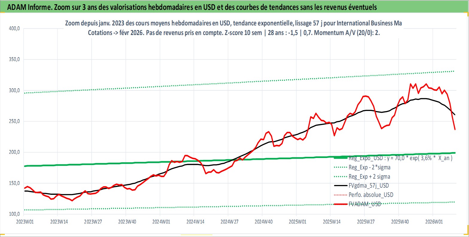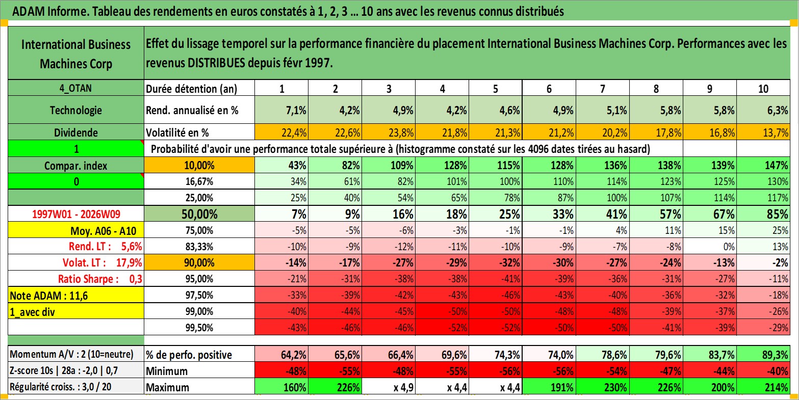 Site dédié aux investisseursPage dédiée sur site financeAnalyse des valorisations hebdomadaires de l'action International Business Machines Corp. Cet actif est cote en USD. Les valorisations sont en contrevaleur EURO et couvrent les semaines 1997W01 a 2026W09. Les revenus de cet actif financier sont pris en compte depuis la semaine 1997W06. La note globale ESG de cet actif est estimee a 13.0 (apres rebasage entre 0 et 20).