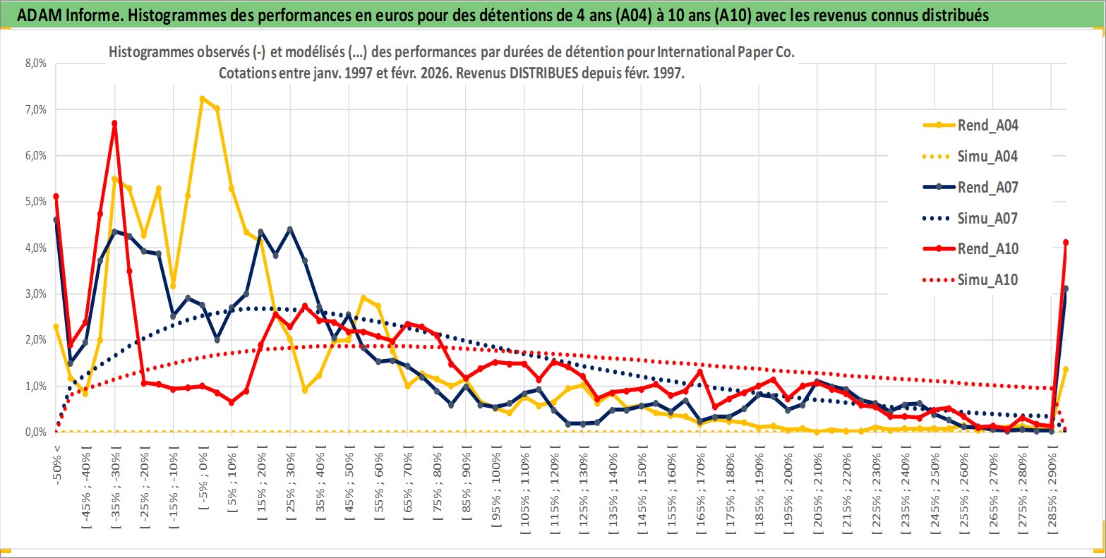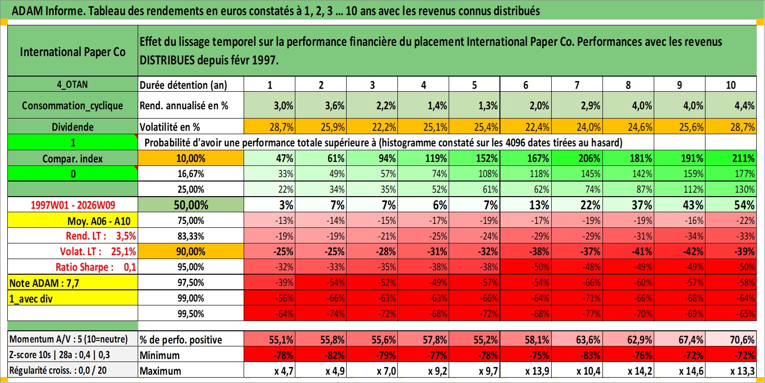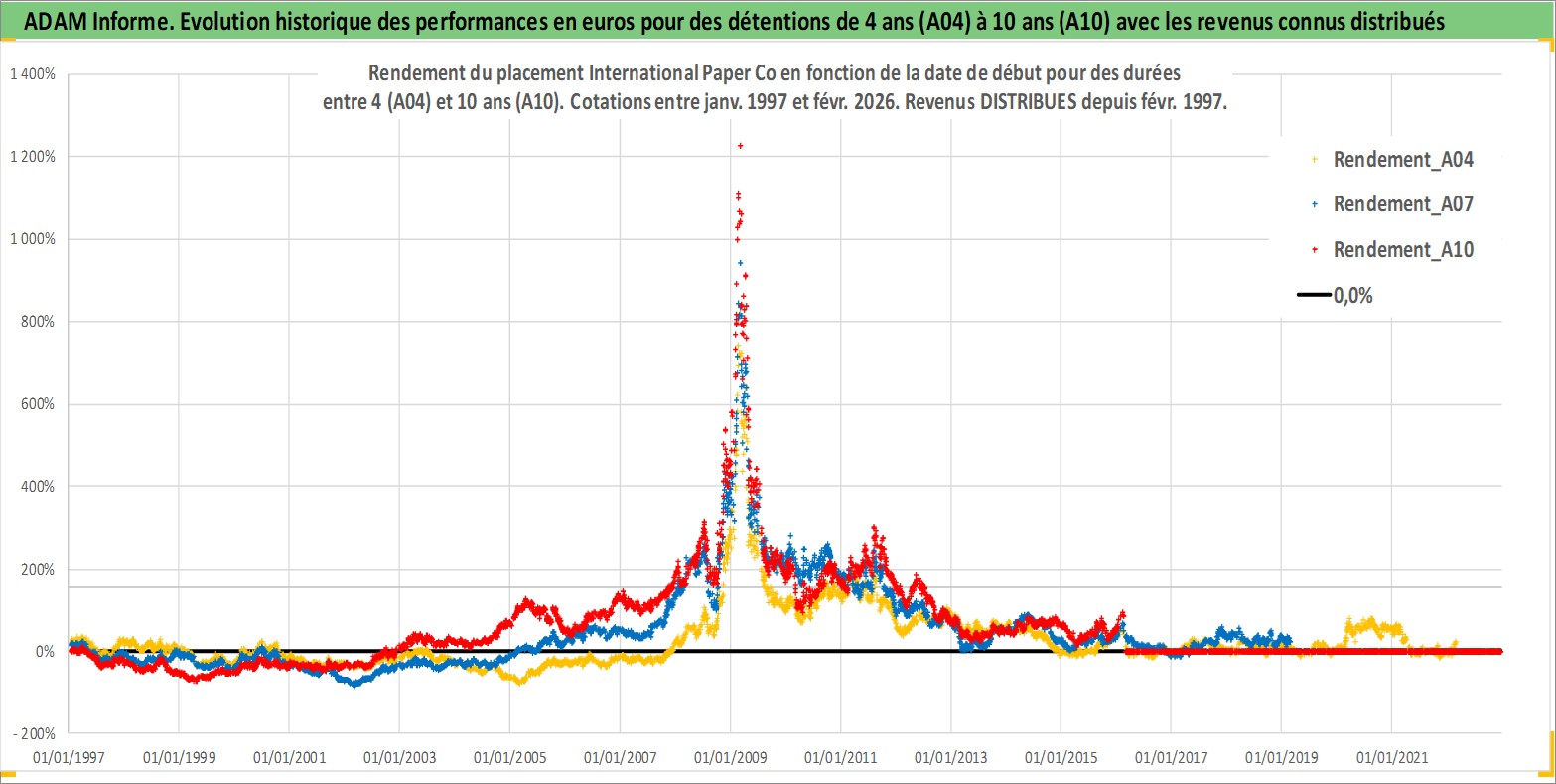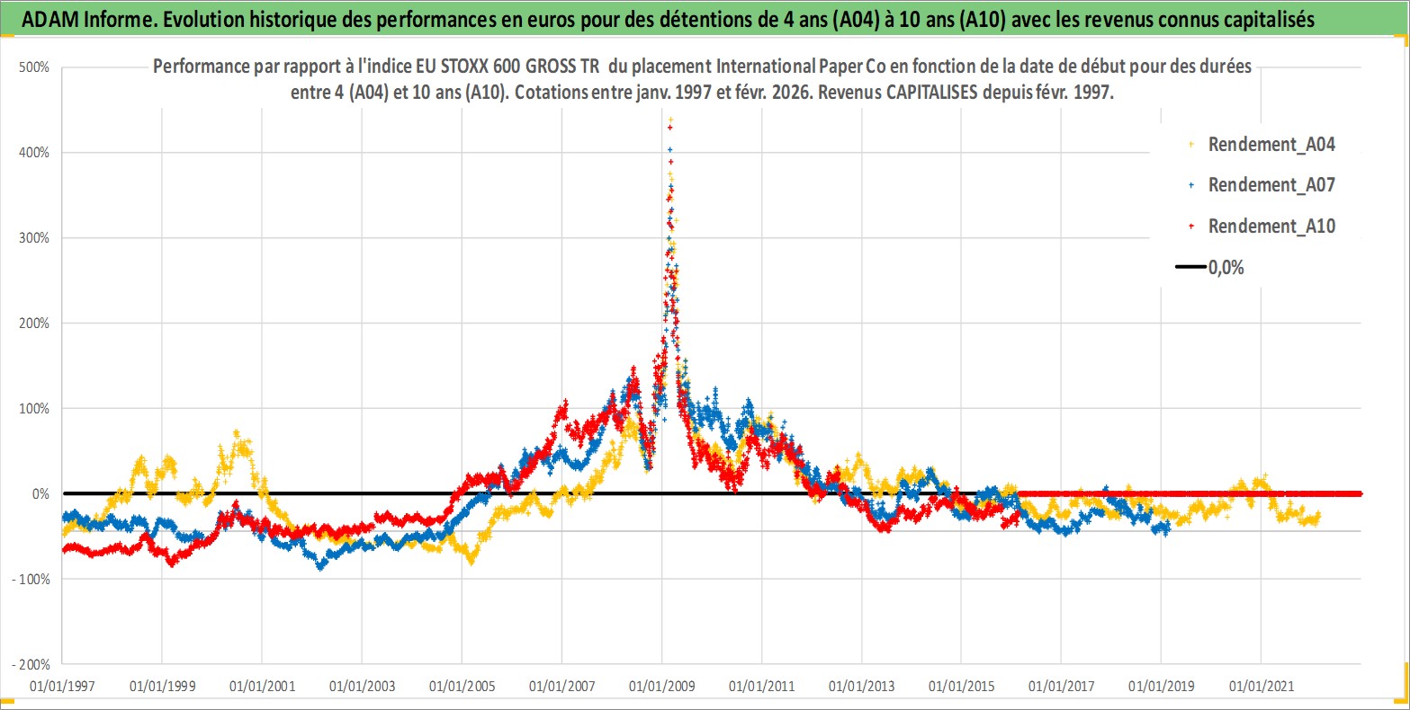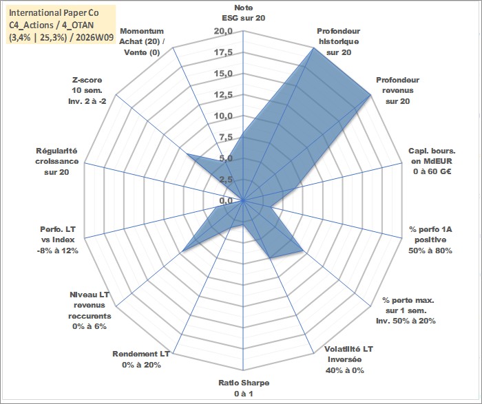 Site dédié aux investisseursPage dédiée sur site financeAnalyse des valorisations hebdomadaires de l'action International Paper Co. Cet actif est cote en USD. Les valorisations sont en contrevaleur EURO et couvrent les semaines 1997W01 a 2026W09. Les revenus de cet actif financier sont pris en compte depuis la semaine 1997W08. La note globale ESG de cet actif est estimee a 8.0 (apres rebasage entre 0 et 20).