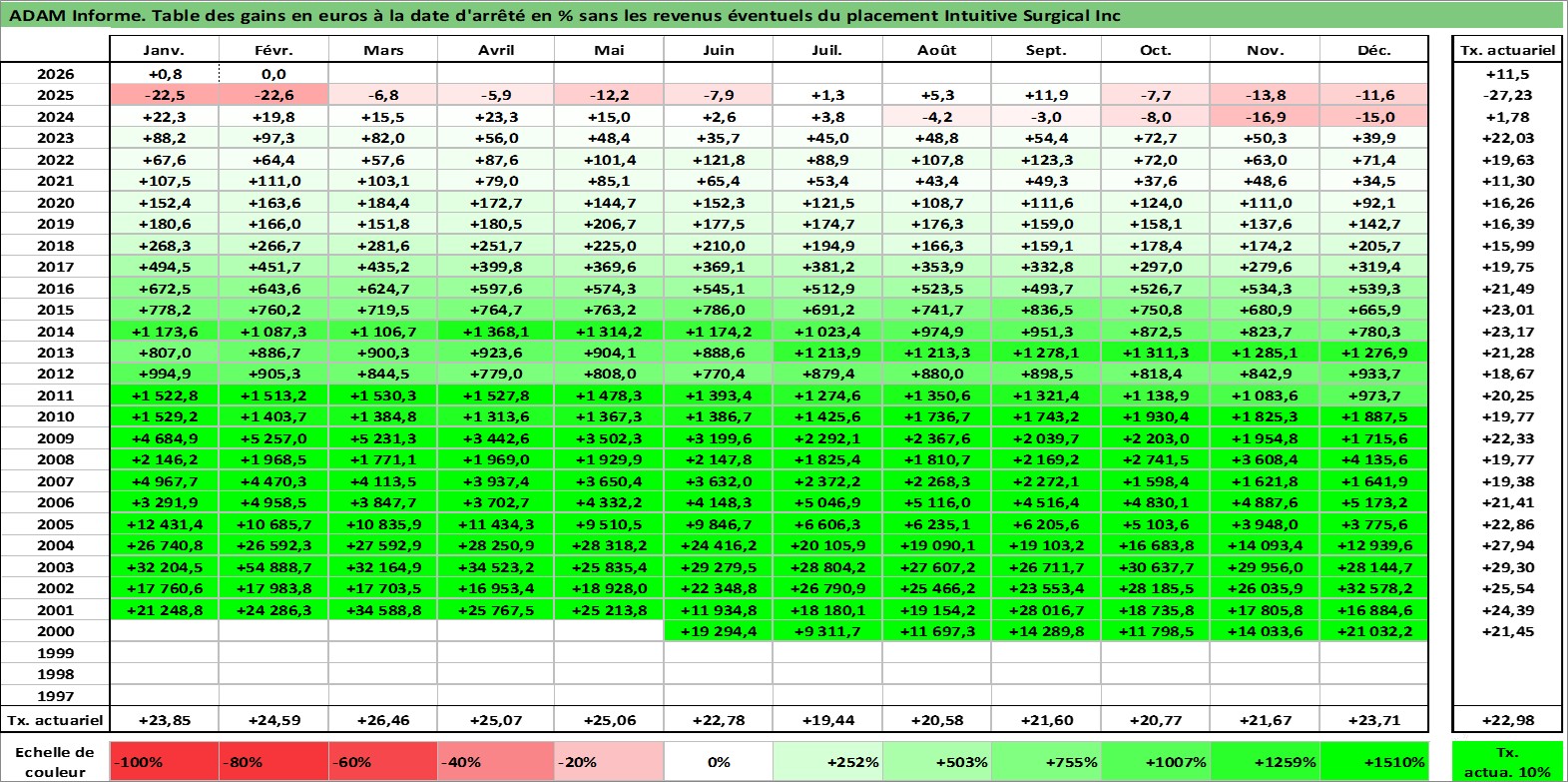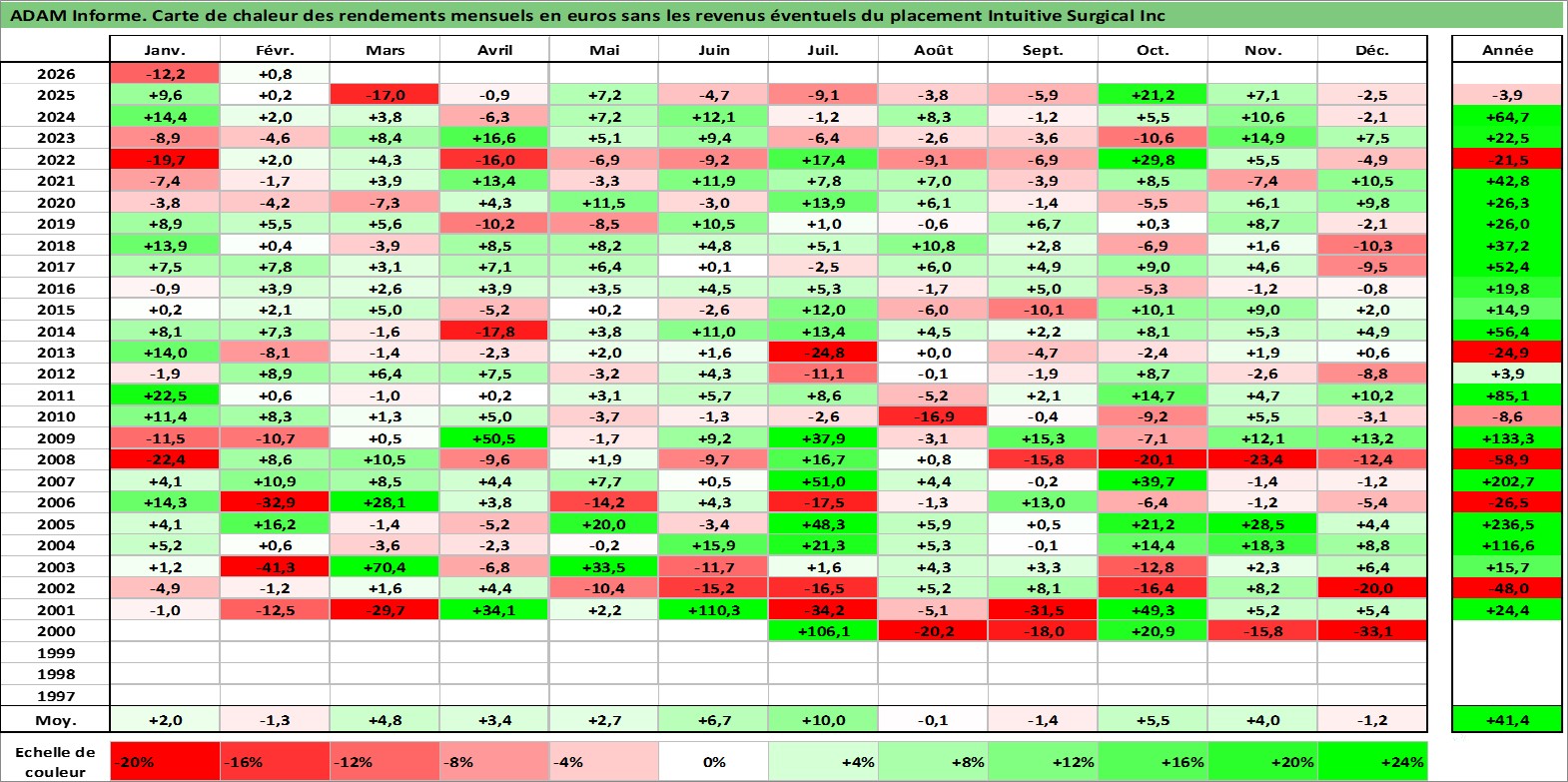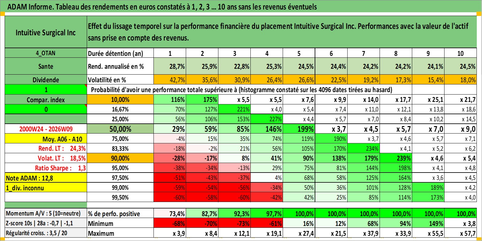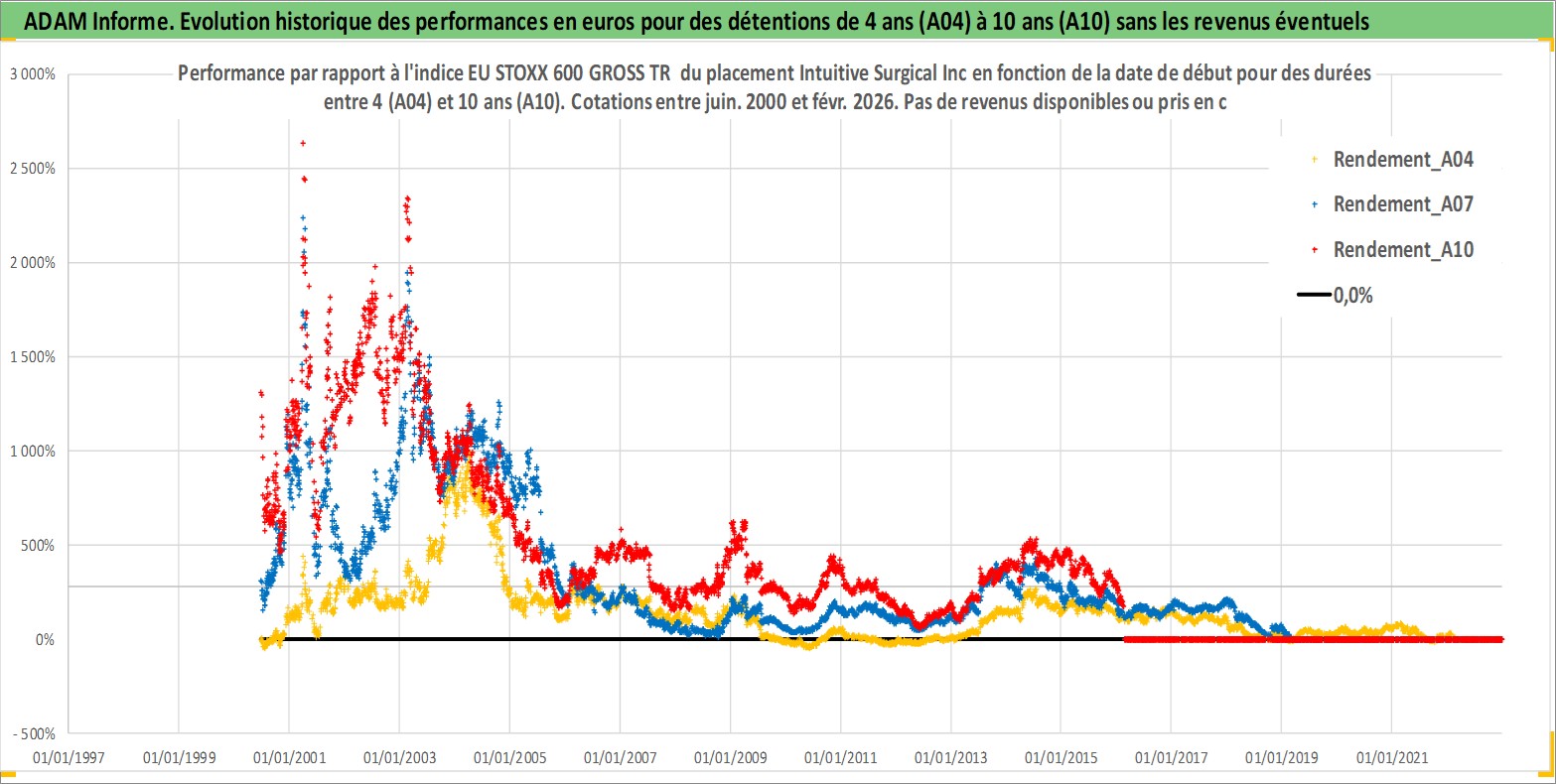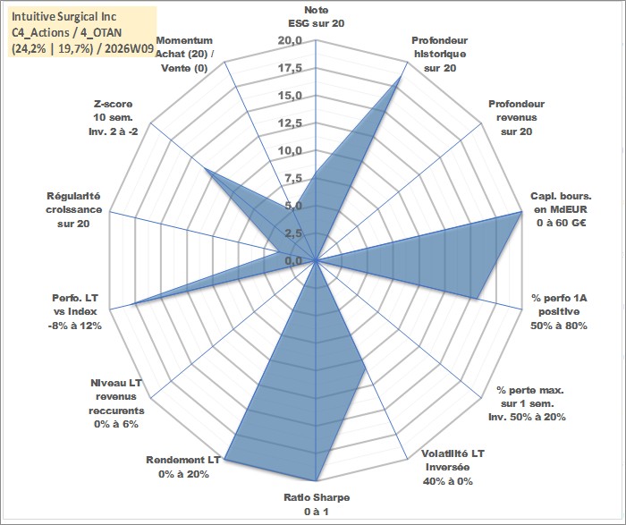 Site dédié aux investisseursPage dédiée sur site financeAnalyse des valorisations hebdomadaires de l'action Intuitive Surgical Inc. Cet actif est cote en USD. Les valorisations sont en contrevaleur EURO et couvrent les semaines 2000W24 a 2026W09. Les revenus de cet actif financier ne sont pas connus car non existants ou non disponibles sur le site Yahoo Finance. La note globale ESG de cet actif est estimee a 8.0 (apres rebasage entre 0 et 20).