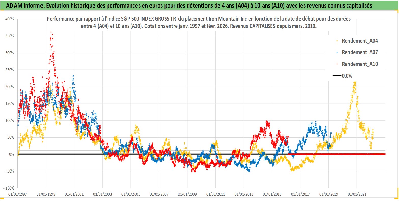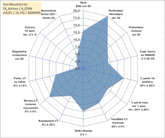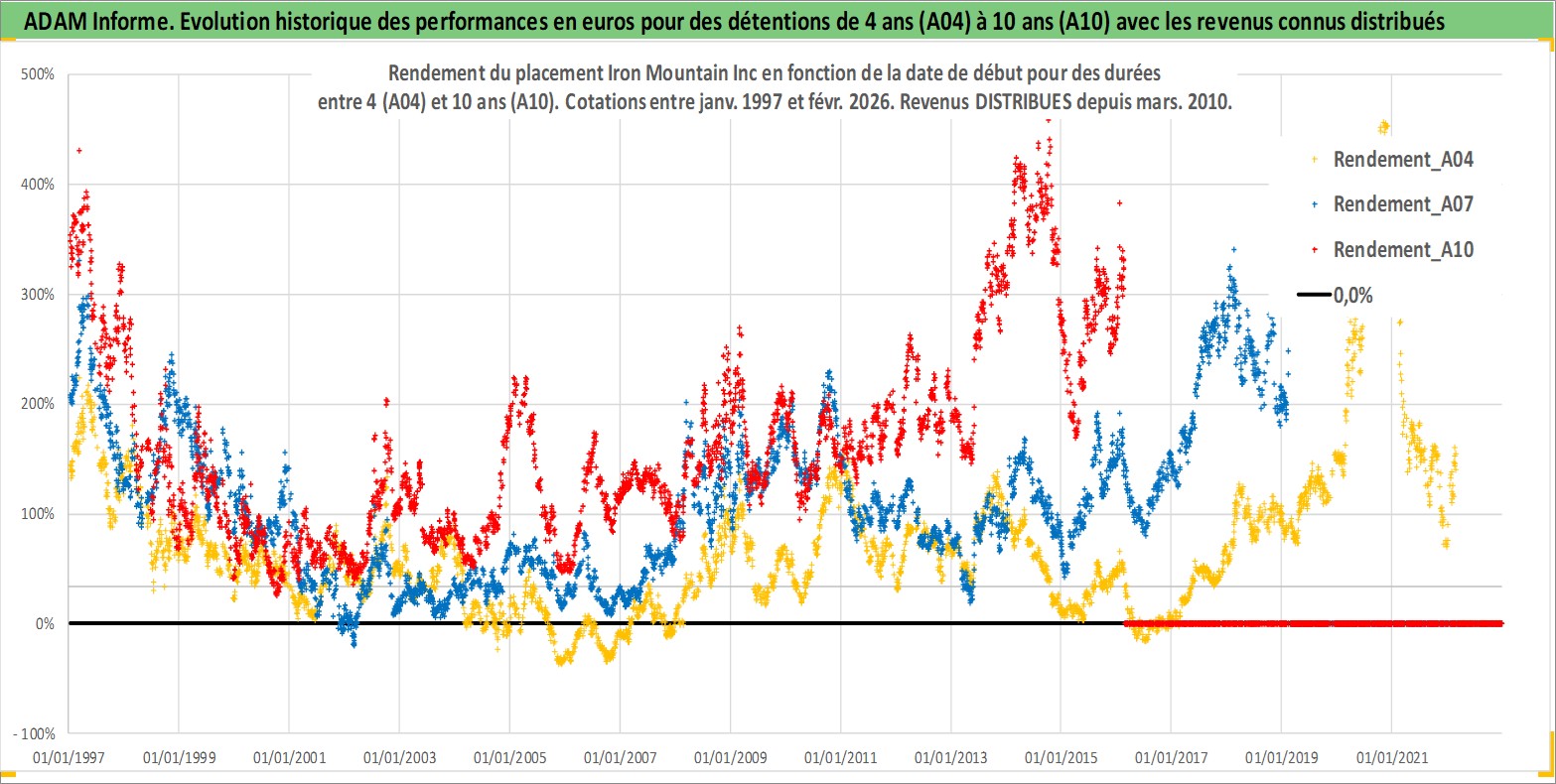 Site dédié aux investisseursPage dédiée sur site financeAnalyse des valorisations hebdomadaires de l'action Iron Mountain Inc. Cet actif est cote en USD. Les valorisations sont en contrevaleur EURO et couvrent les semaines 1997W01 a 2026W09. Les revenus de cet actif financier sont pris en compte depuis la semaine 2010W12. La note globale ESG de cet actif est estimee a 13.0 (apres rebasage entre 0 et 20).