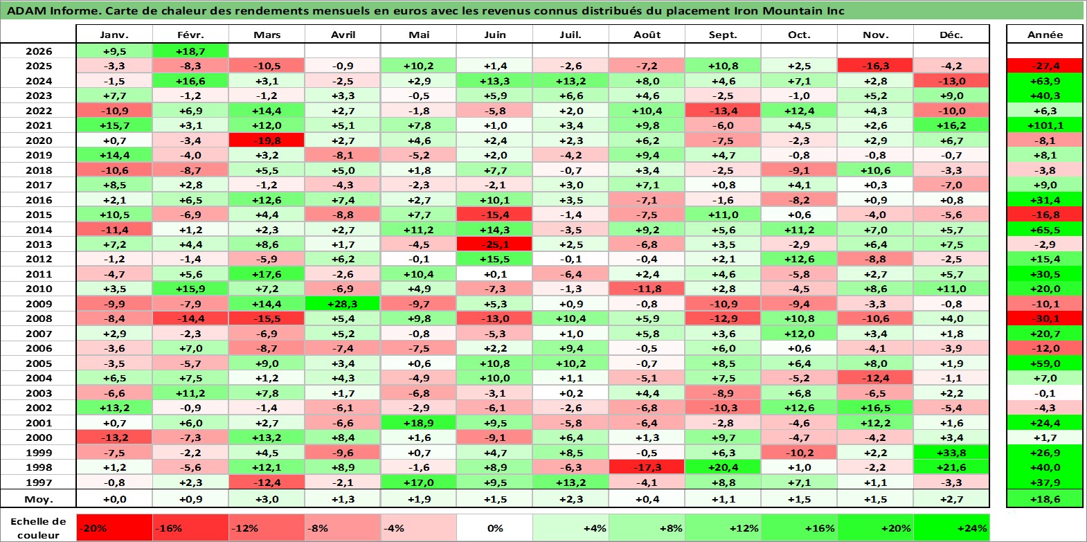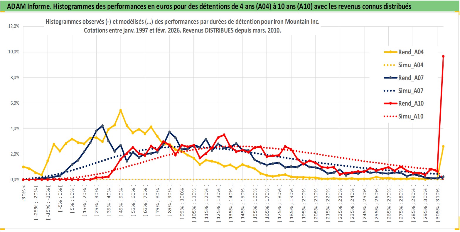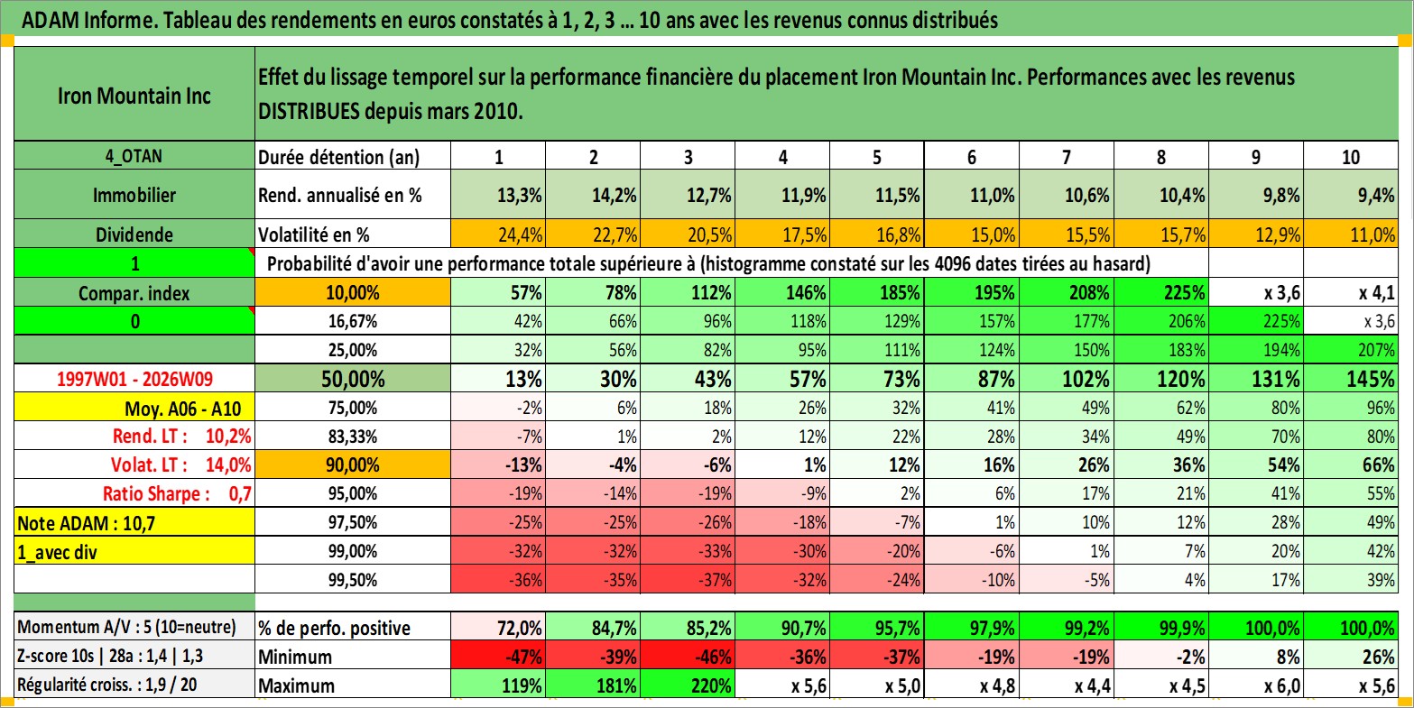Site dédié aux investisseursPage dédiée sur site financeAnalyse des valorisations hebdomadaires de l'action Iron Mountain Inc. Cet actif est cote en USD. Les valorisations sont en contrevaleur EURO et couvrent les semaines 1997W01 a 2026W09. Les revenus de cet actif financier sont pris en compte depuis la semaine 2010W12. La note globale ESG de cet actif est estimee a 13.0 (apres rebasage entre 0 et 20).