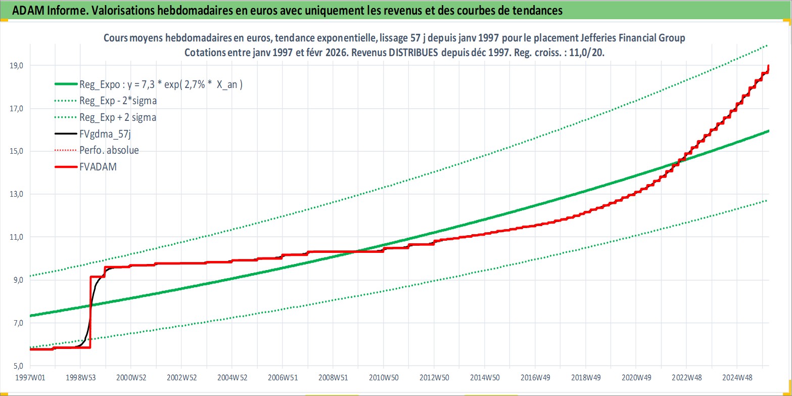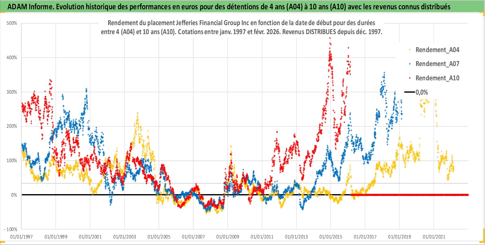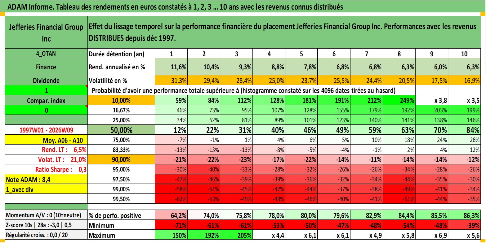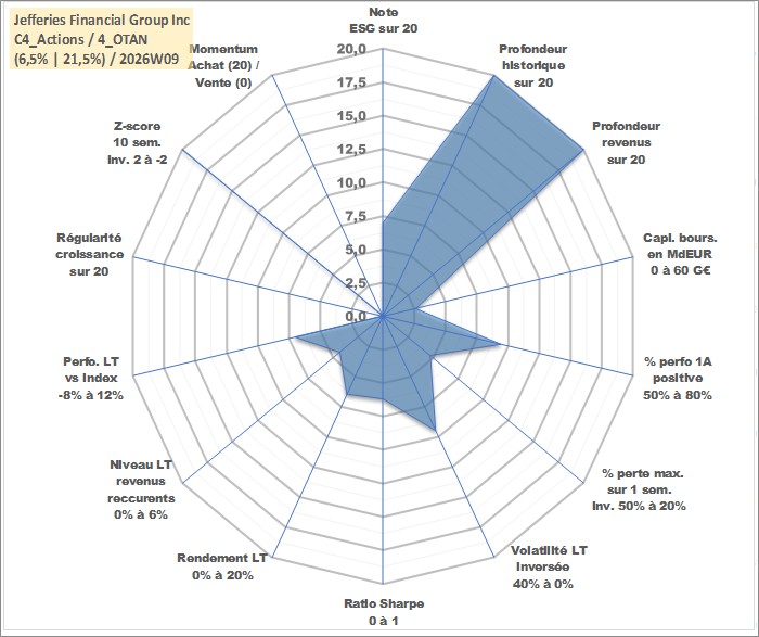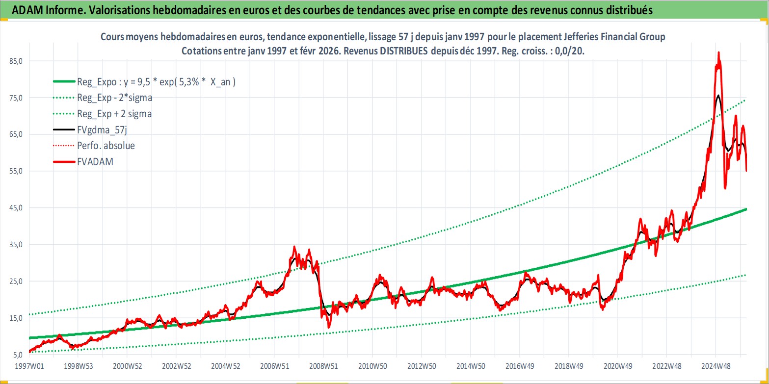 Site dédié aux investisseursPage dédiée sur site financeAnalyse des valorisations hebdomadaires de l'action Jefferies Financial Group Inc. Cet actif est cote en USD. Les valorisations sont en contrevaleur EURO et couvrent les semaines 1997W01 a 2026W09. Les revenus de cet actif financier sont pris en compte depuis la semaine 1997W49. La note globale ESG de cet actif est estimee a 7.0 (apres rebasage entre 0 et 20).