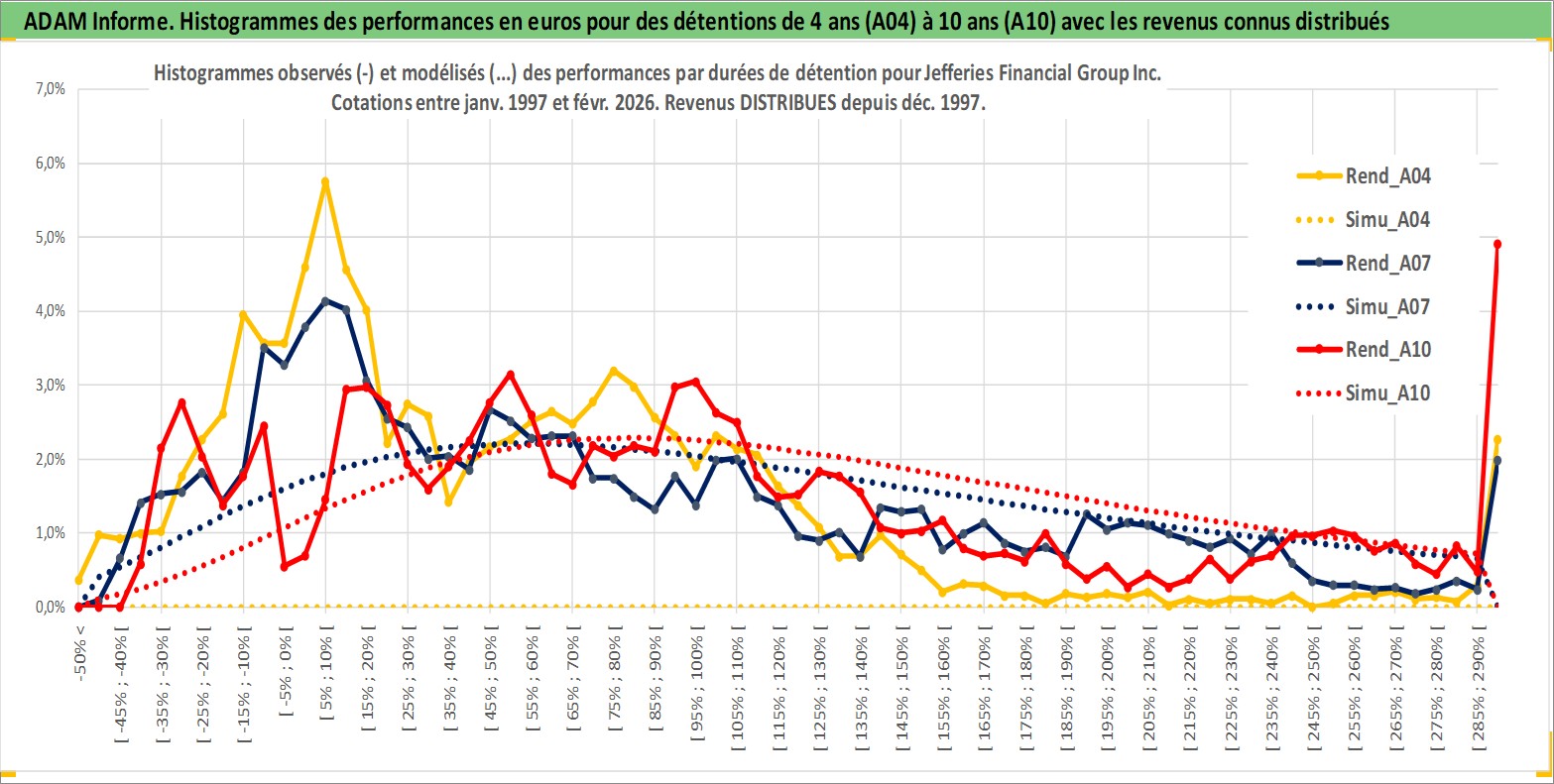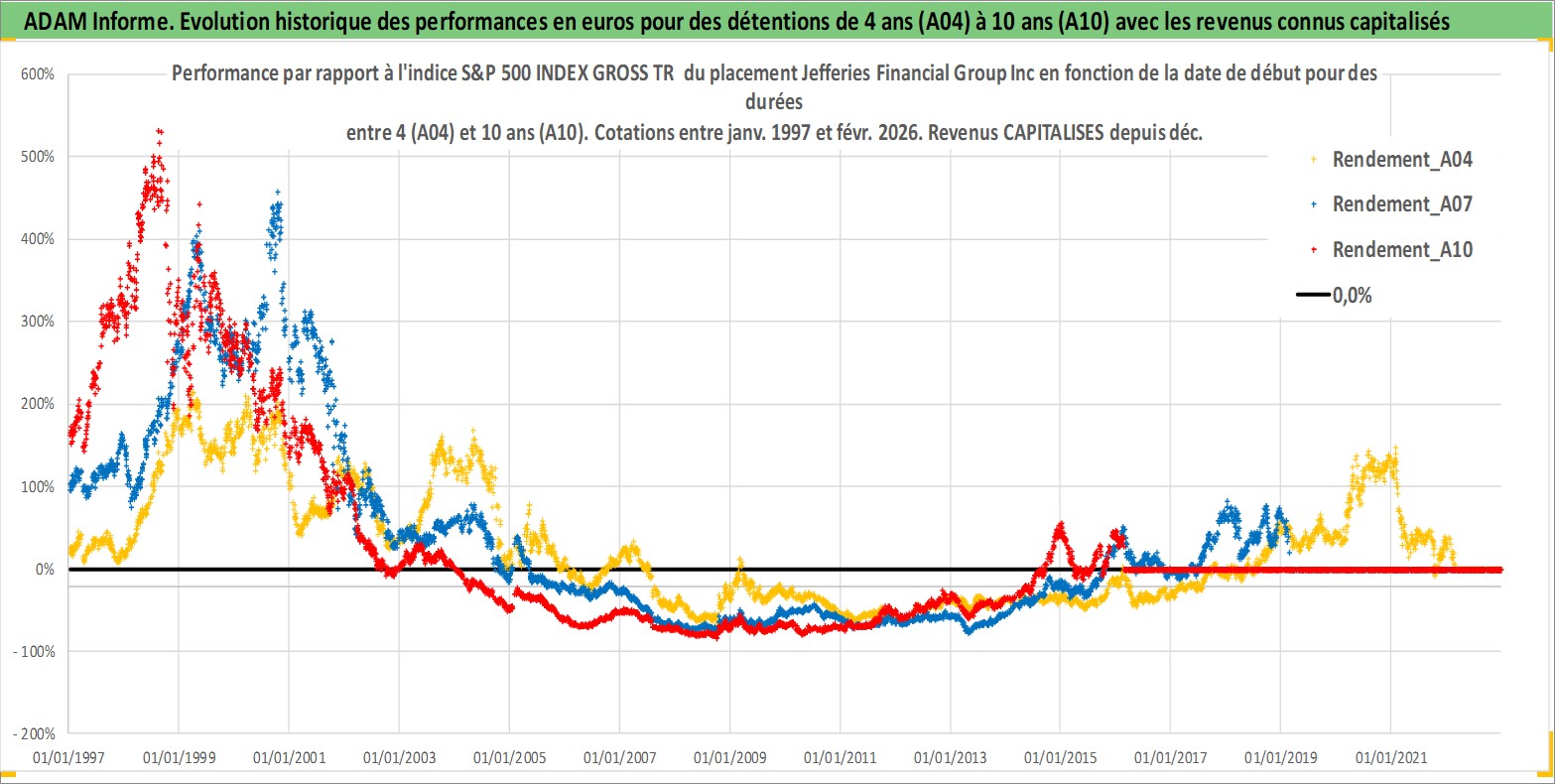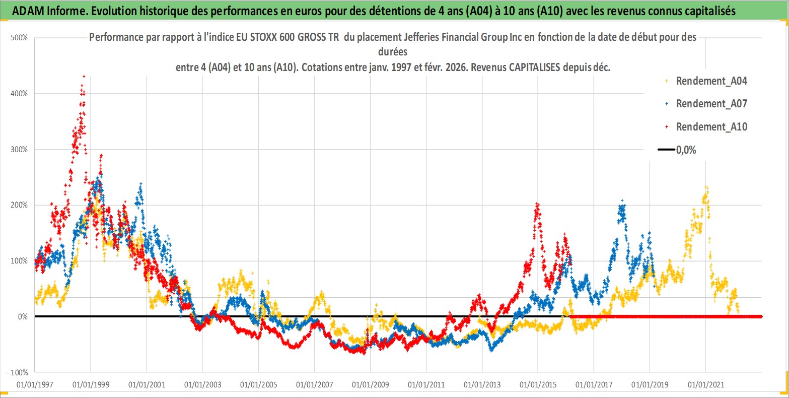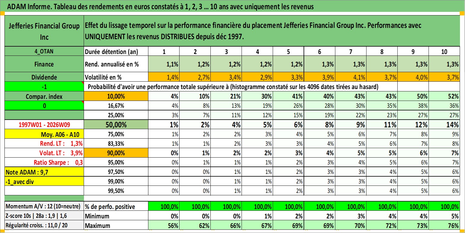 Site dédié aux investisseursPage dédiée sur site financeAnalyse des valorisations hebdomadaires de l'action Jefferies Financial Group Inc. Cet actif est cote en USD. Les valorisations sont en contrevaleur EURO et couvrent les semaines 1997W01 a 2026W09. Les revenus de cet actif financier sont pris en compte depuis la semaine 1997W49. La note globale ESG de cet actif est estimee a 7.0 (apres rebasage entre 0 et 20).