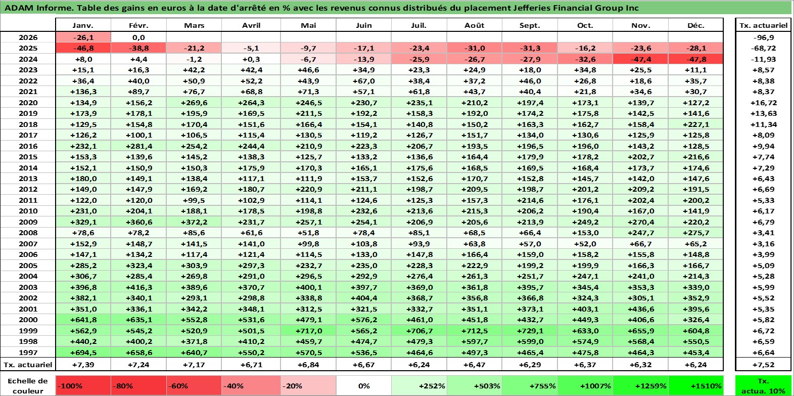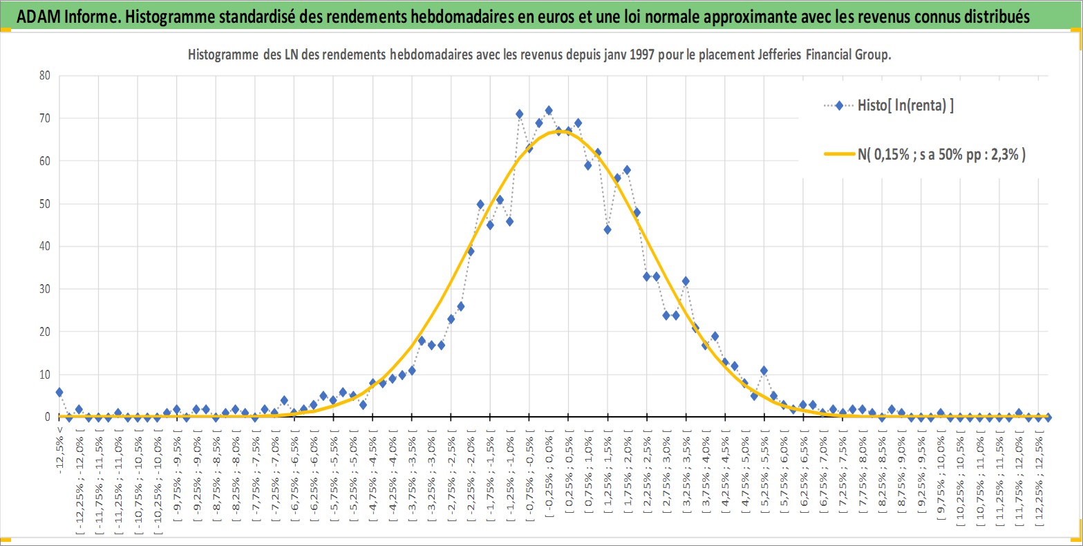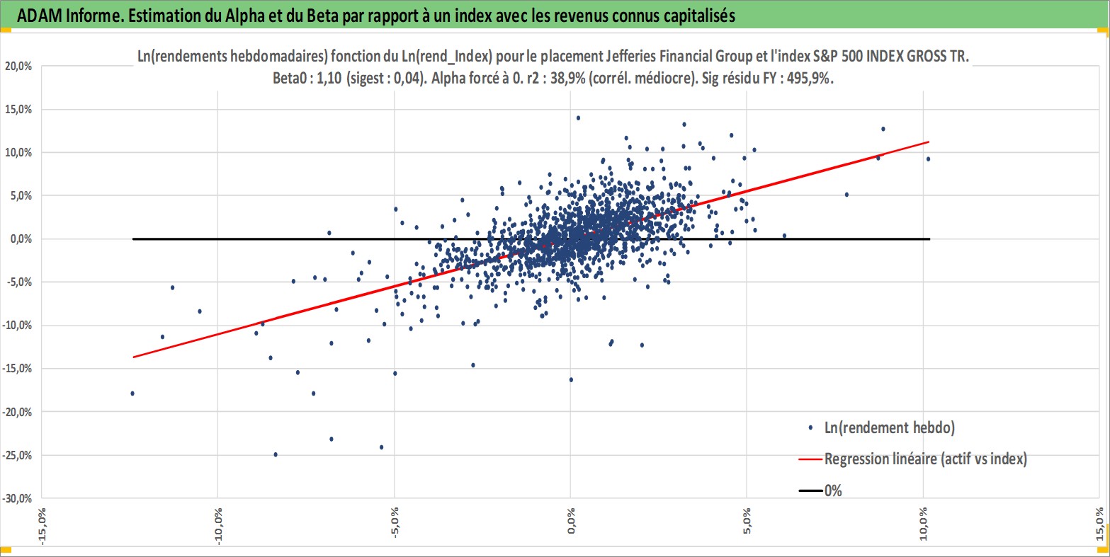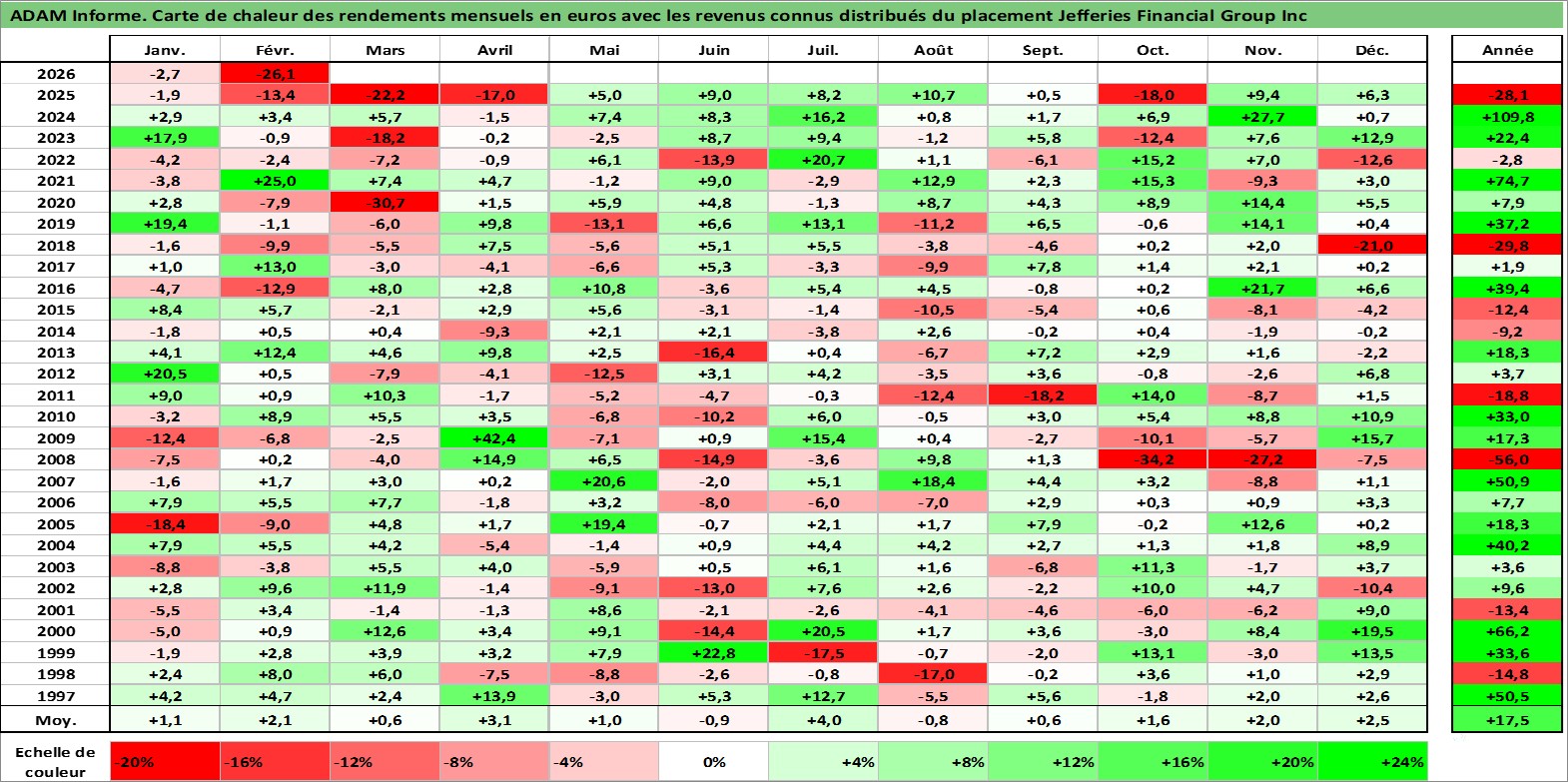 Site dédié aux investisseursPage dédiée sur site financeAnalyse des valorisations hebdomadaires de l'action Jefferies Financial Group Inc. Cet actif est cote en USD. Les valorisations sont en contrevaleur EURO et couvrent les semaines 1997W01 a 2026W09. Les revenus de cet actif financier sont pris en compte depuis la semaine 1997W49. La note globale ESG de cet actif est estimee a 7.0 (apres rebasage entre 0 et 20).