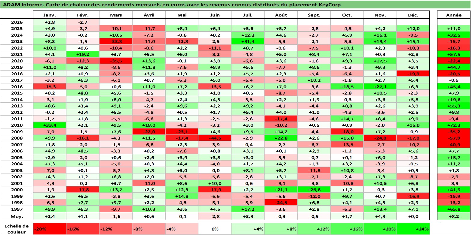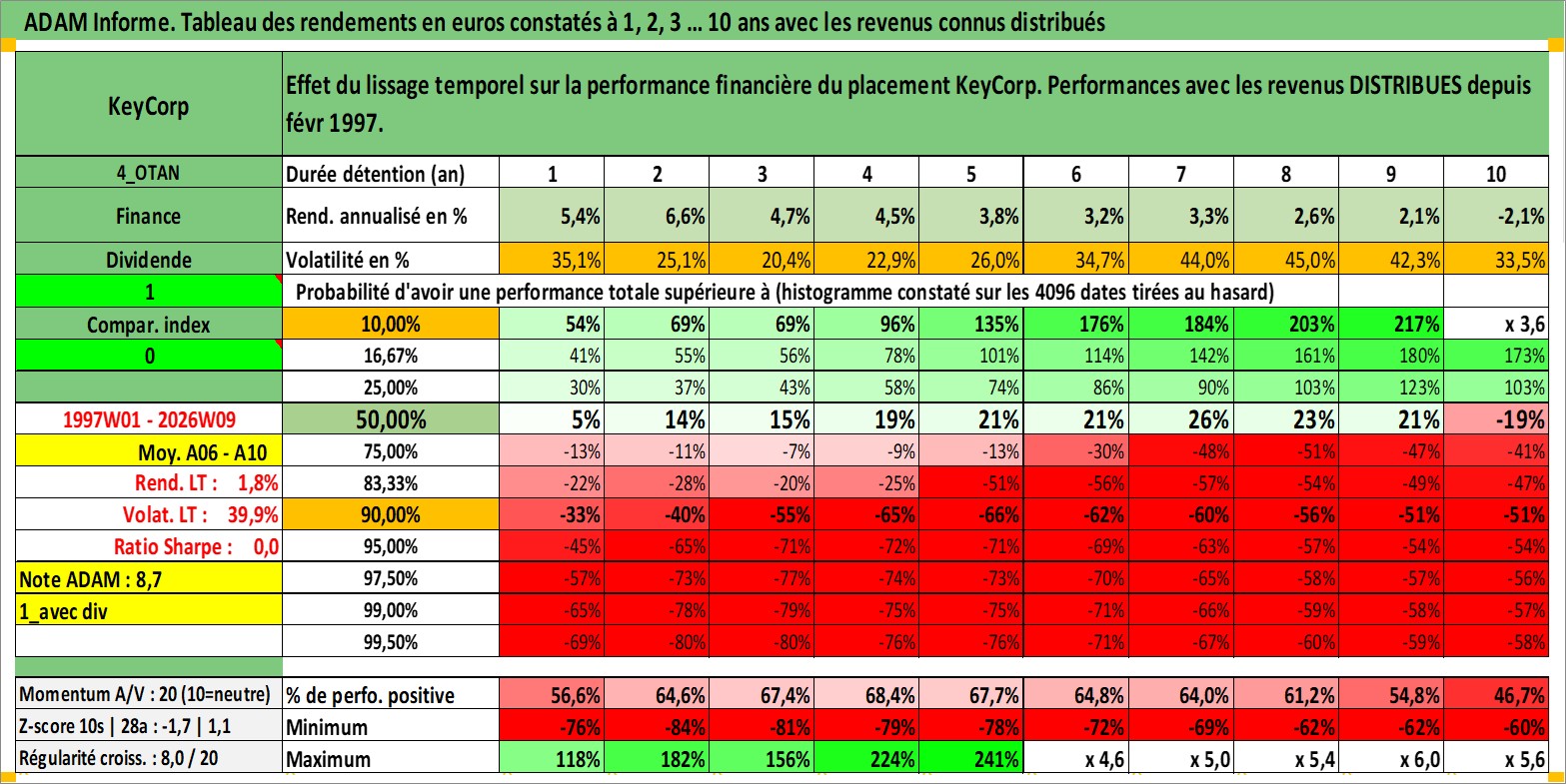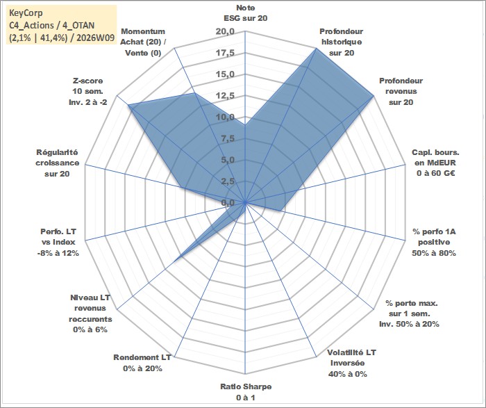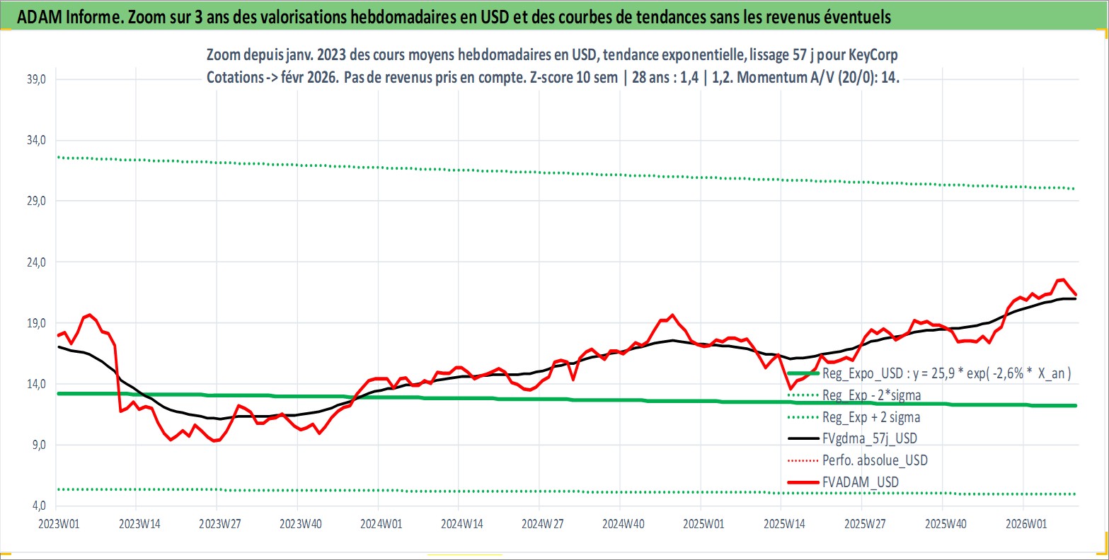 Site dédié aux investisseursPage dédiée sur site financeAnalyse des valorisations hebdomadaires de l'action KeyCorp. Cet actif est cote en USD. Les valorisations sont en contrevaleur EURO et couvrent les semaines 1997W01 a 2026W09. Les revenus de cet actif financier sont pris en compte depuis la semaine 1997W09. La note globale ESG de cet actif est estimee a 9.0 (apres rebasage entre 0 et 20).