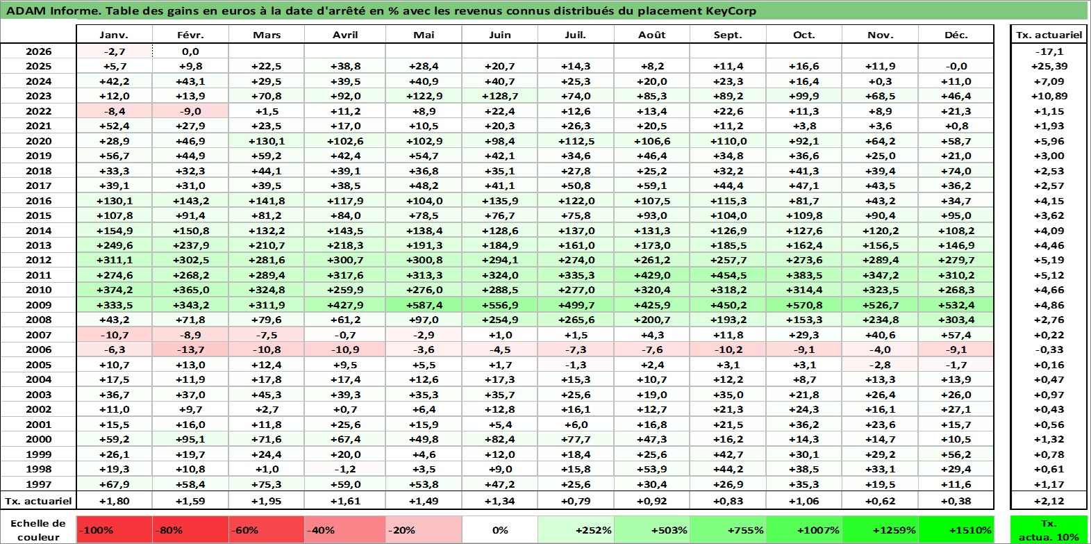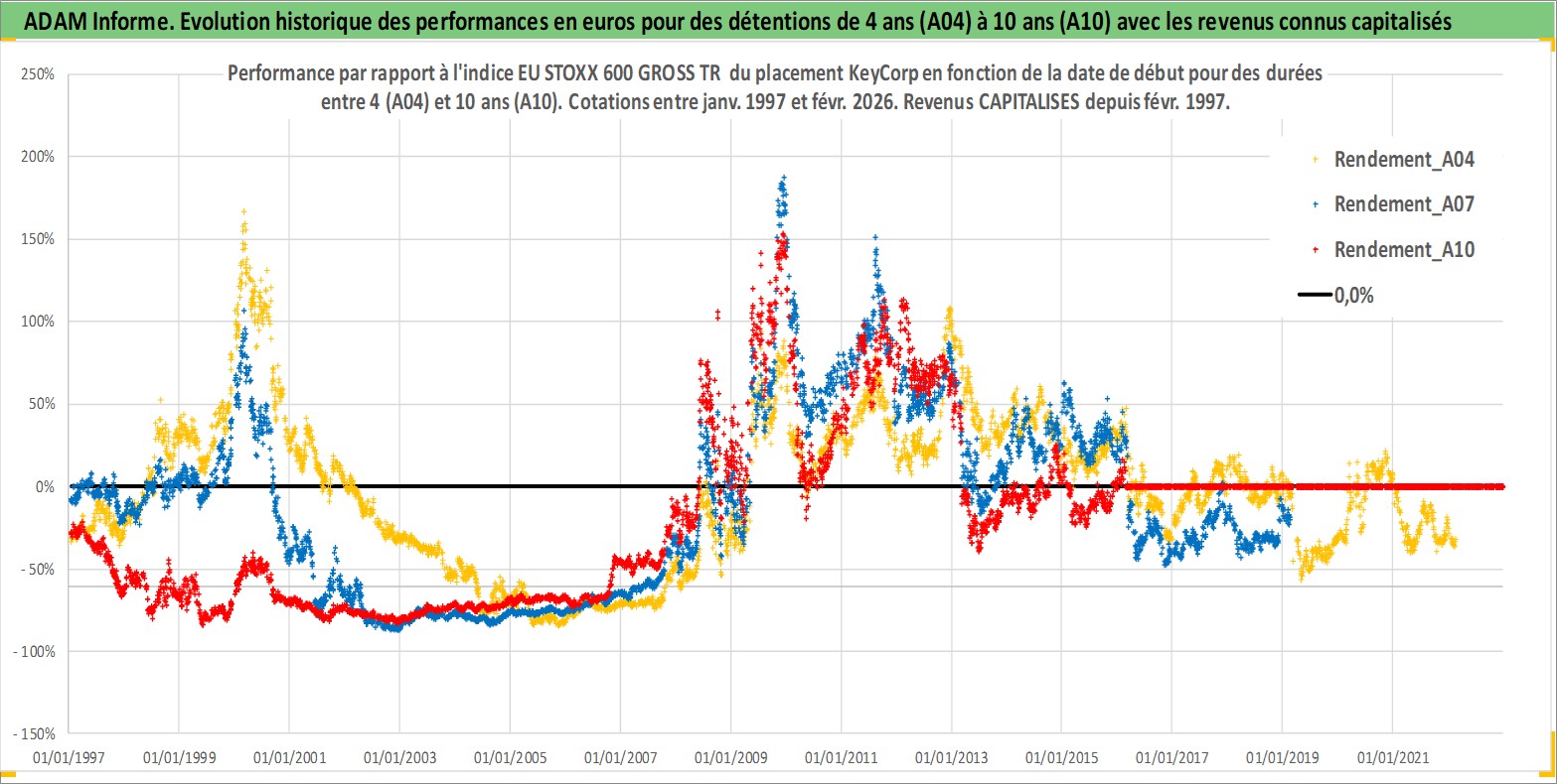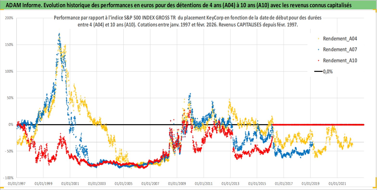 Site dédié aux investisseursPage dédiée sur site financeAnalyse des valorisations hebdomadaires de l'action KeyCorp. Cet actif est cote en USD. Les valorisations sont en contrevaleur EURO et couvrent les semaines 1997W01 a 2026W09. Les revenus de cet actif financier sont pris en compte depuis la semaine 1997W09. La note globale ESG de cet actif est estimee a 9.0 (apres rebasage entre 0 et 20).