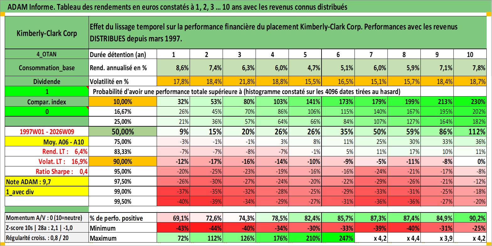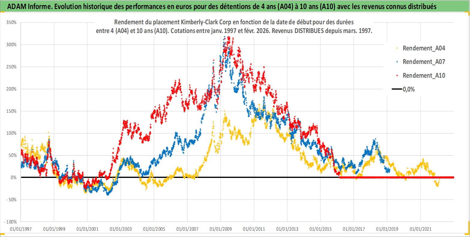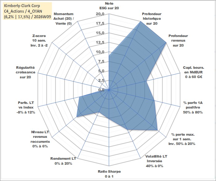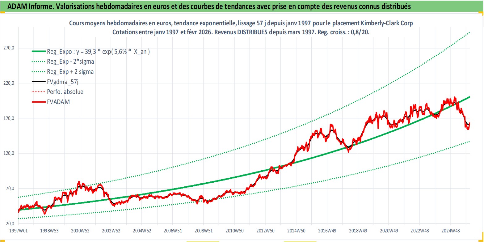 Site dédié aux investisseursPage dédiée sur site financeAnalyse des valorisations hebdomadaires de l'action Kimberly-Clark Corp. Cet actif est cote en USD. Les valorisations sont en contrevaleur EURO et couvrent les semaines 1997W01 a 2026W09. Les revenus de cet actif financier sont pris en compte depuis la semaine 1997W10. La note globale ESG de cet actif est estimee a 9.0 (apres rebasage entre 0 et 20).