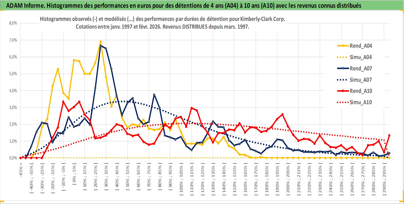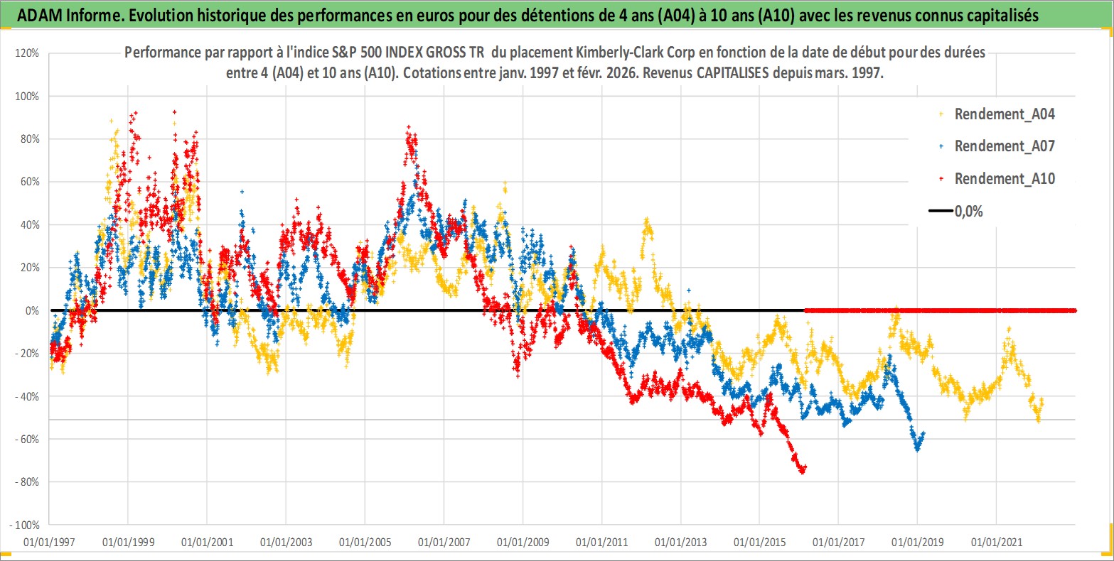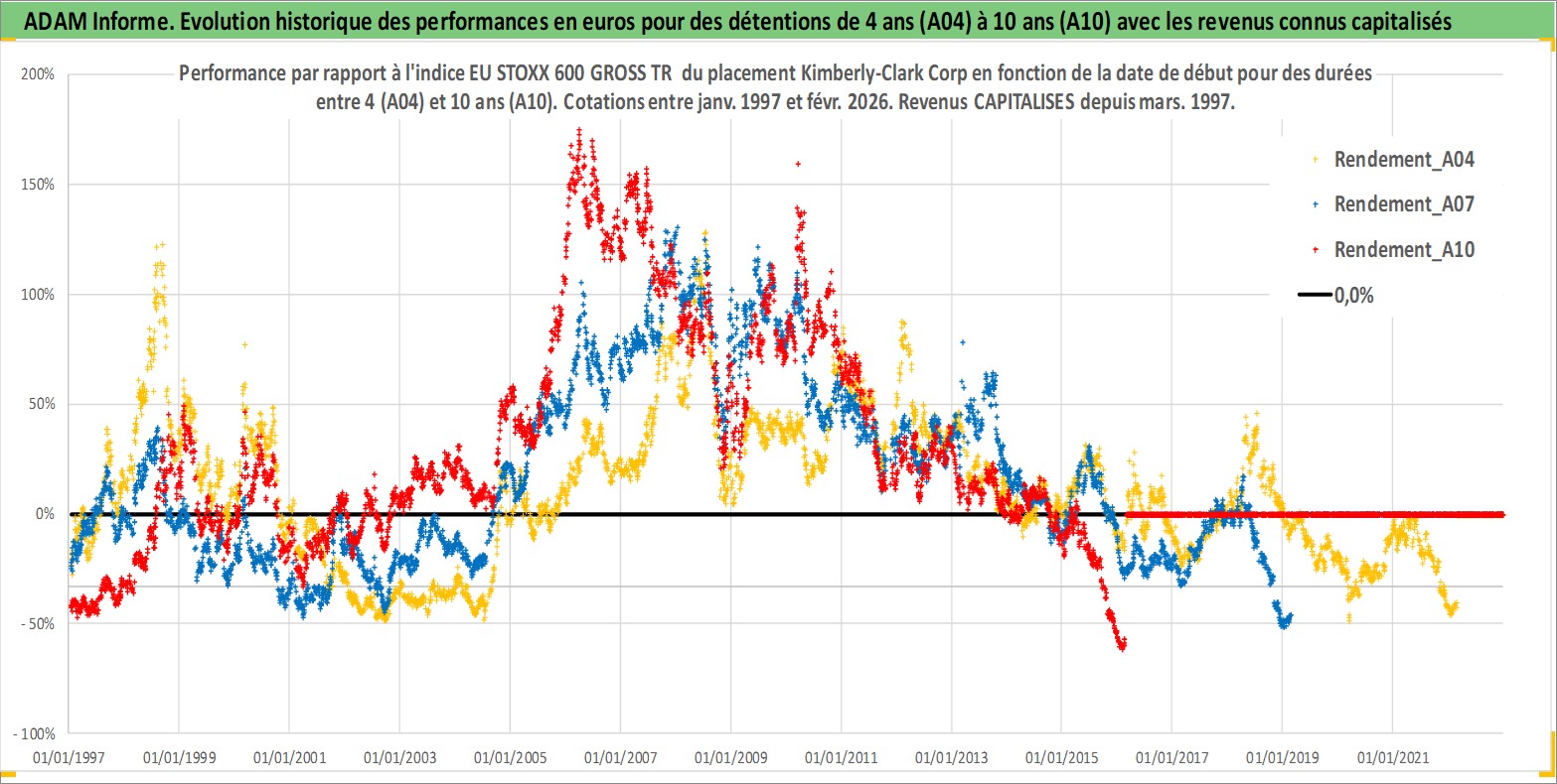 Site dédié aux investisseursPage dédiée sur site financeAnalyse des valorisations hebdomadaires de l'action Kimberly-Clark Corp. Cet actif est cote en USD. Les valorisations sont en contrevaleur EURO et couvrent les semaines 1997W01 a 2026W09. Les revenus de cet actif financier sont pris en compte depuis la semaine 1997W10. La note globale ESG de cet actif est estimee a 9.0 (apres rebasage entre 0 et 20).