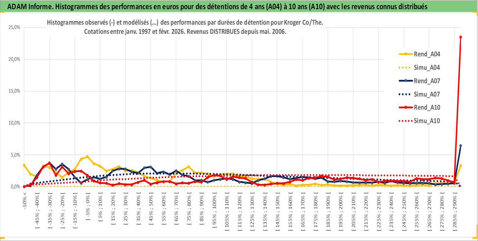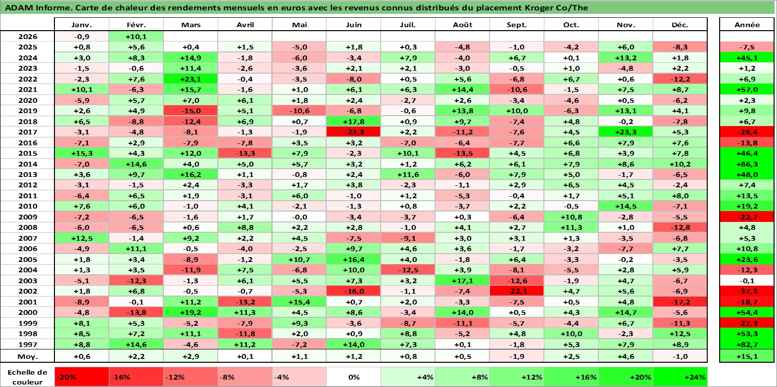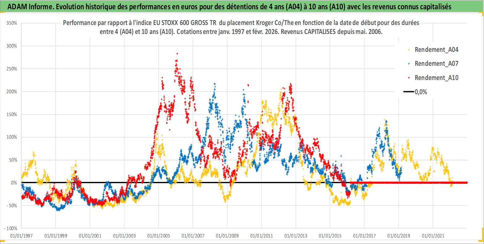 Site dédié aux investisseursPage dédiée sur site financeAnalyse des valorisations hebdomadaires de l'action Kroger Co/The. Cet actif est cote en USD. Les valorisations sont en contrevaleur EURO et couvrent les semaines 1997W01 a 2026W09. Les revenus de cet actif financier sont pris en compte depuis la semaine 2006W19. La note globale ESG de cet actif est estimee a 10.0 (apres rebasage entre 0 et 20).