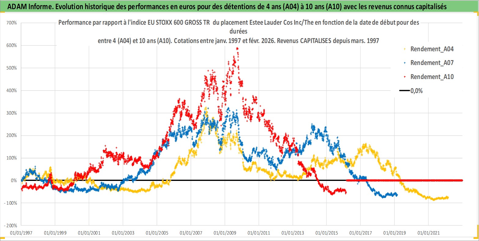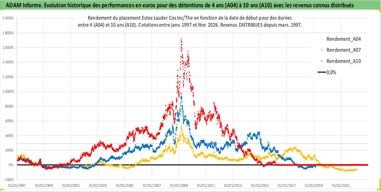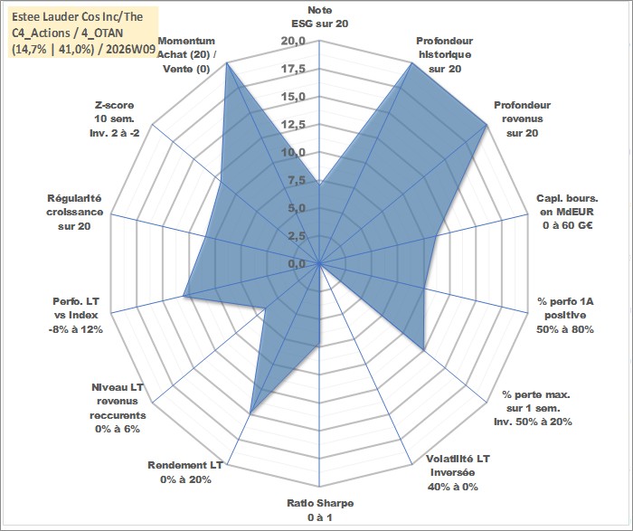 Site dédié aux investisseursPage dédiée sur site financeAnalyse des valorisations hebdomadaires de l'action Estee Lauder Cos Inc/The. Cet actif est cote en USD. Les valorisations sont en contrevaleur EURO et couvrent les semaines 1997W01 a 2026W09. Les revenus de cet actif financier sont pris en compte depuis la semaine 1997W11. La note globale ESG de cet actif est estimee a 7.0 (apres rebasage entre 0 et 20).