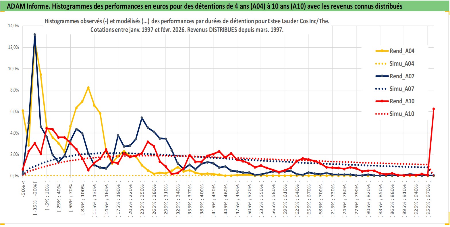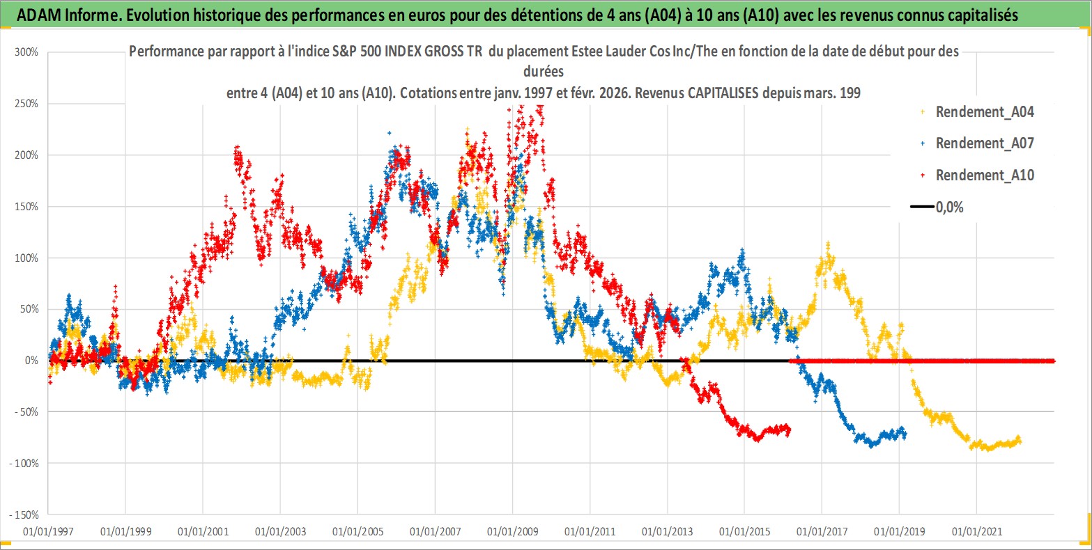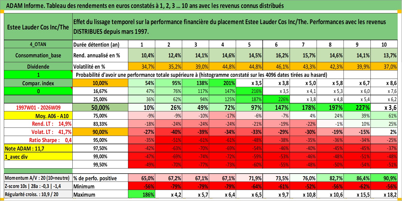 Site dédié aux investisseursPage dédiée sur site financeAnalyse des valorisations hebdomadaires de l'action Estee Lauder Cos Inc/The. Cet actif est cote en USD. Les valorisations sont en contrevaleur EURO et couvrent les semaines 1997W01 a 2026W09. Les revenus de cet actif financier sont pris en compte depuis la semaine 1997W11. La note globale ESG de cet actif est estimee a 7.0 (apres rebasage entre 0 et 20).