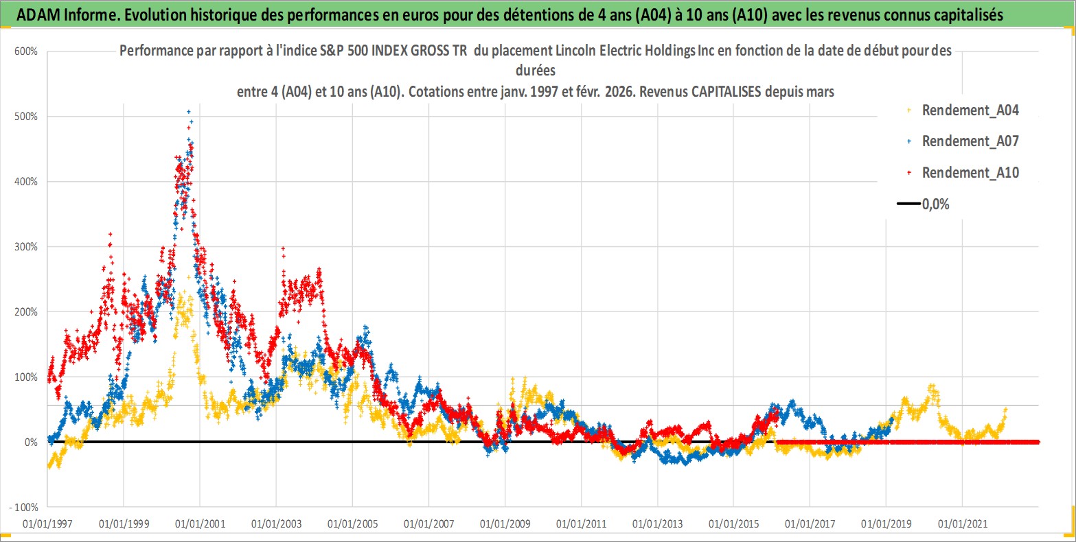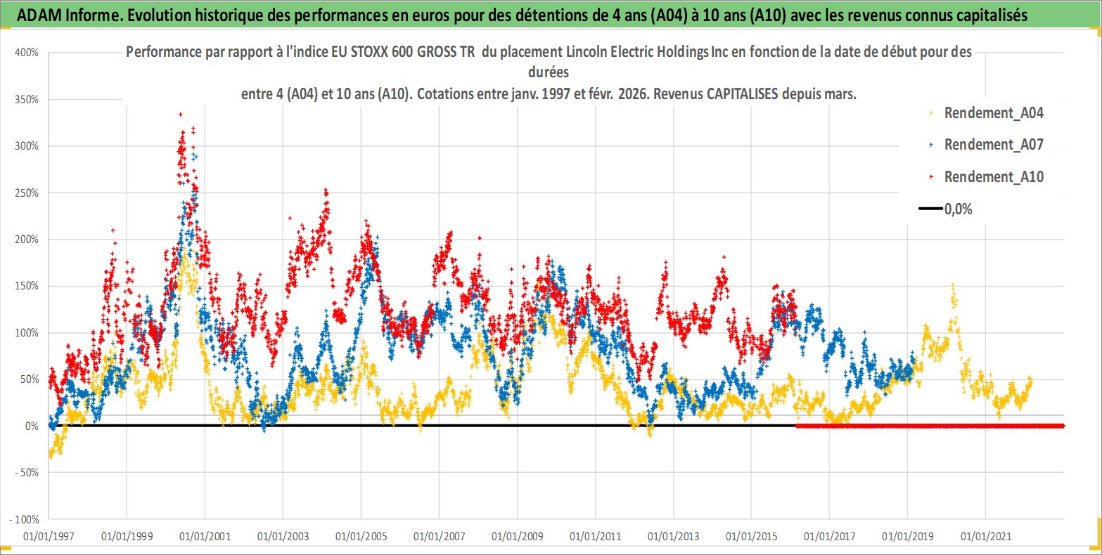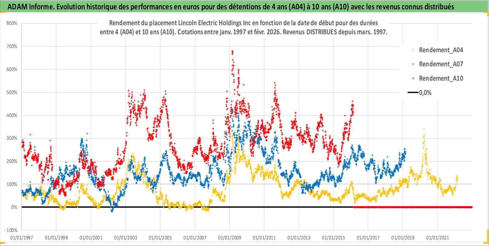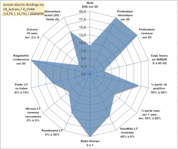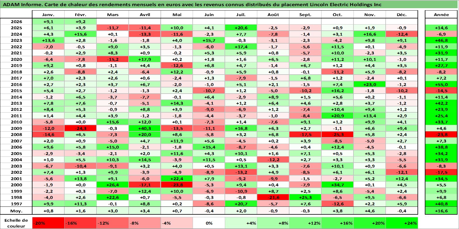 Site dédié aux investisseursPage dédiée sur site financeAnalyse des valorisations hebdomadaires de l'action Lincoln Electric Holdings Inc. Cet actif est cote en USD. Les valorisations sont en contrevaleur EURO et couvrent les semaines 1997W01 a 2026W09. Les revenus de cet actif financier sont pris en compte depuis la semaine 1997W13. La note globale ESG de cet actif est estimee a 9.0 (apres rebasage entre 0 et 20).