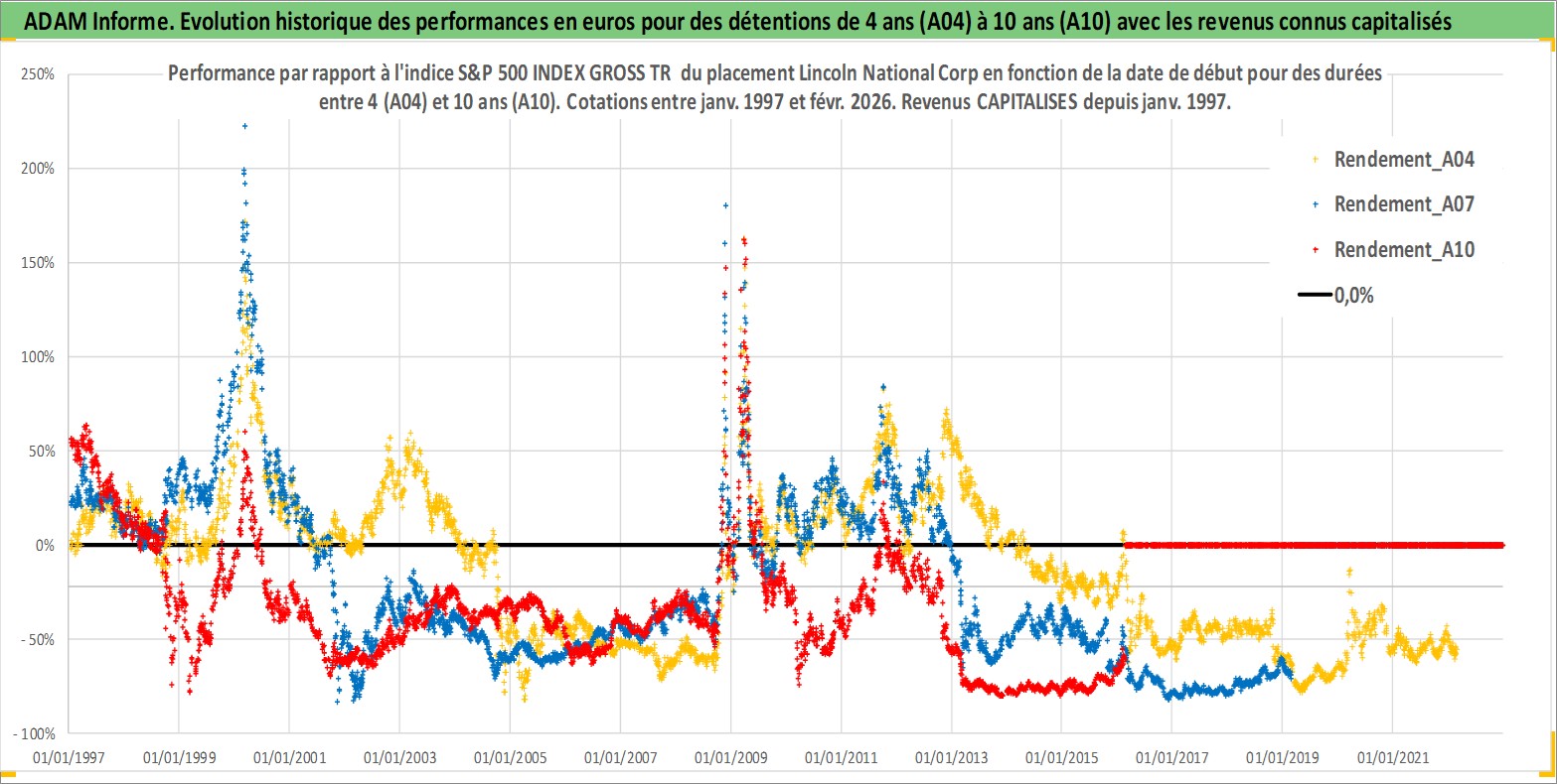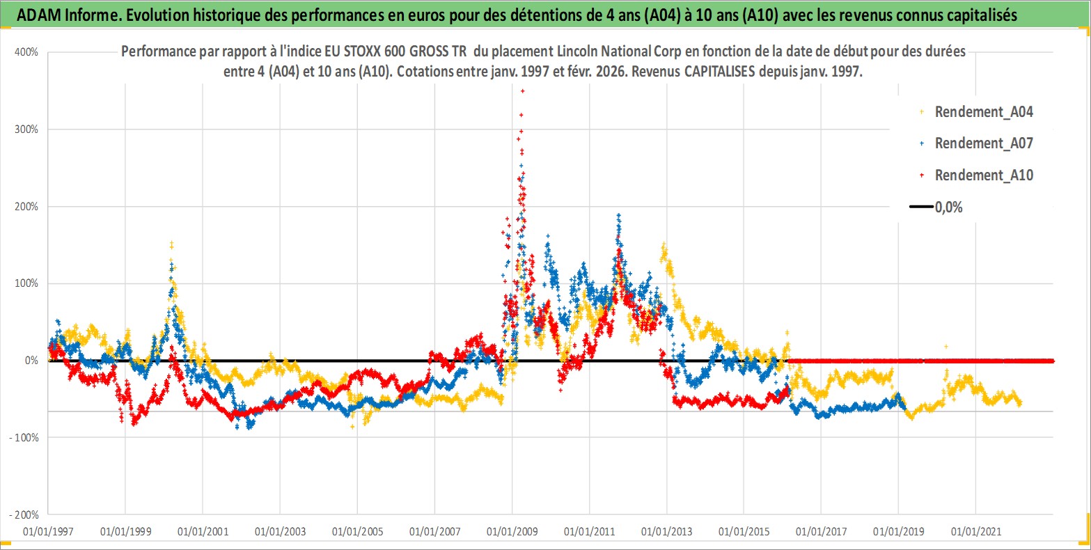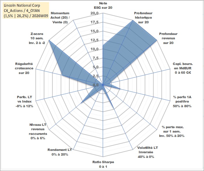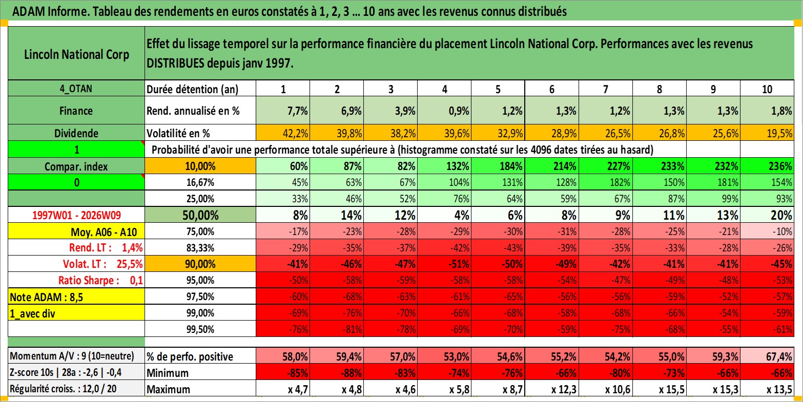 Site dédié aux investisseursPage dédiée sur site financeAnalyse des valorisations hebdomadaires de l'action Lincoln National Corp. Cet actif est cote en USD. Les valorisations sont en contrevaleur EURO et couvrent les semaines 1997W01 a 2026W09. Les revenus de cet actif financier sont pris en compte depuis la semaine 1997W02. La note globale ESG de cet actif est estimee a 11.0 (apres rebasage entre 0 et 20).